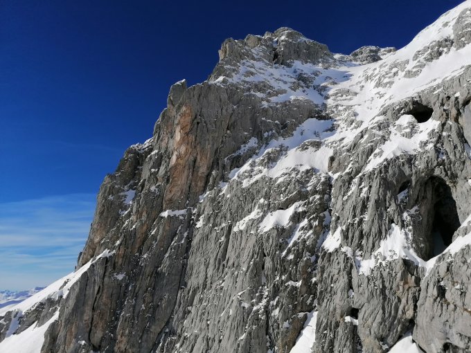 Gute Verhältnisse auf der gesamten Tour. Guter Trittschnee an der Steilstufe. Super Wetter, starker Wind auf dem Gipfel. Vorsicht bei der Abfahrt, schlecht eingeschneite Steine.