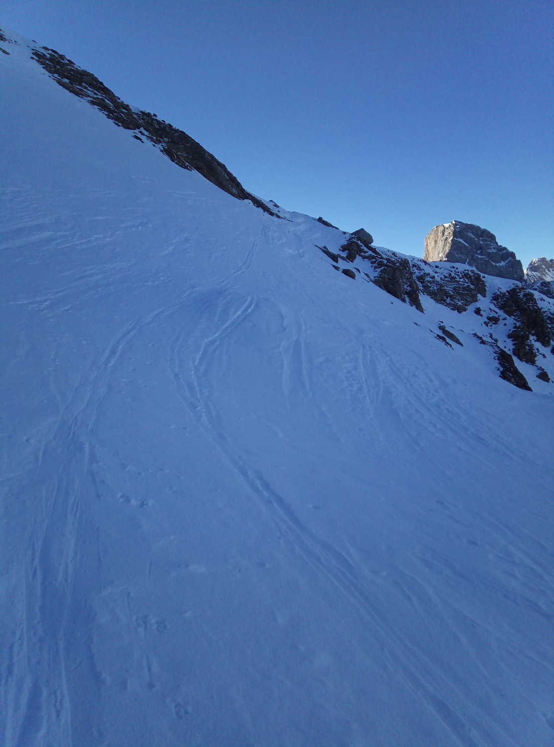 Lauchernstock-Traverse nicht gespurt. Gipfelhang und Seehang sehen wenig einladend aus.