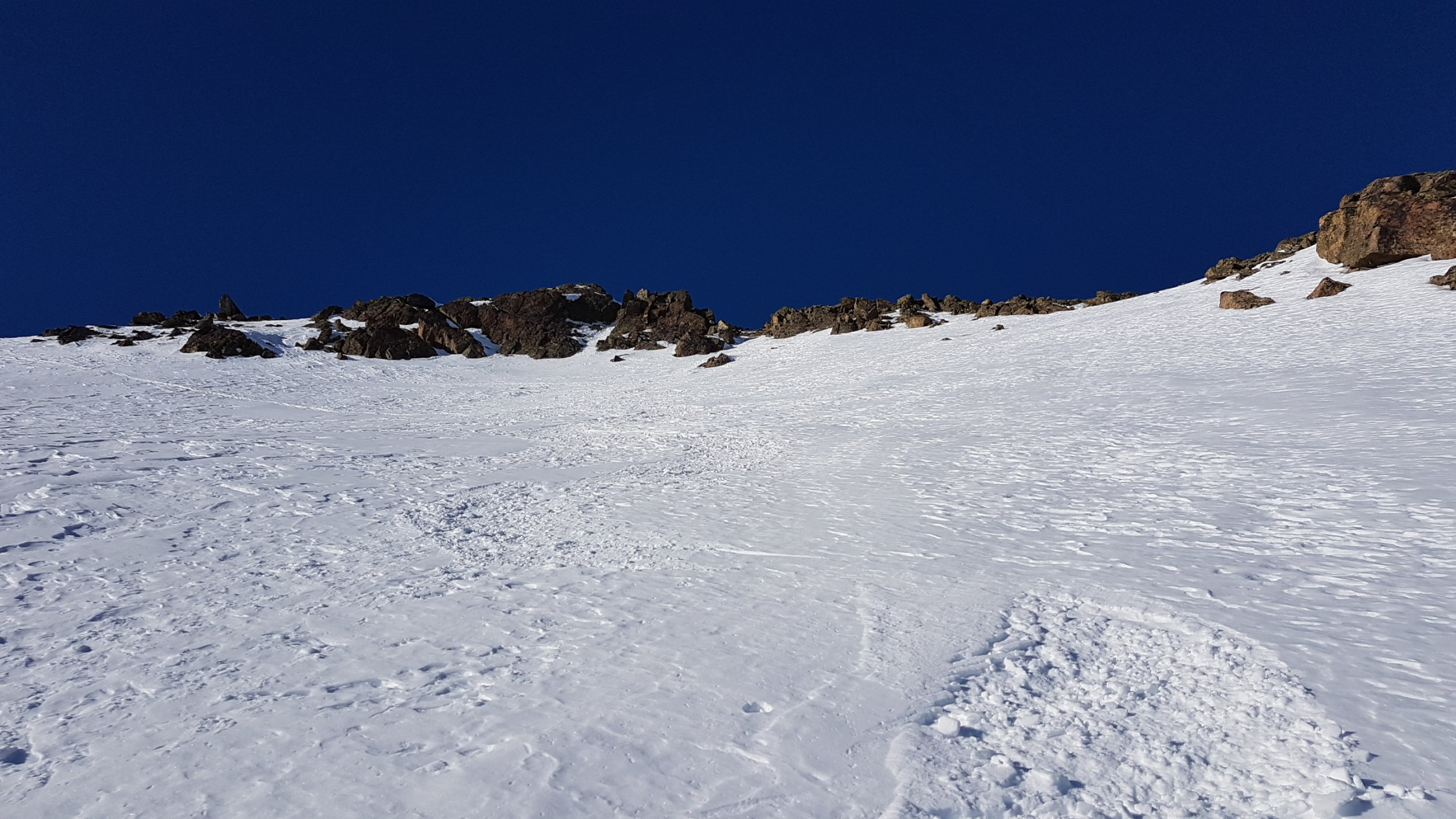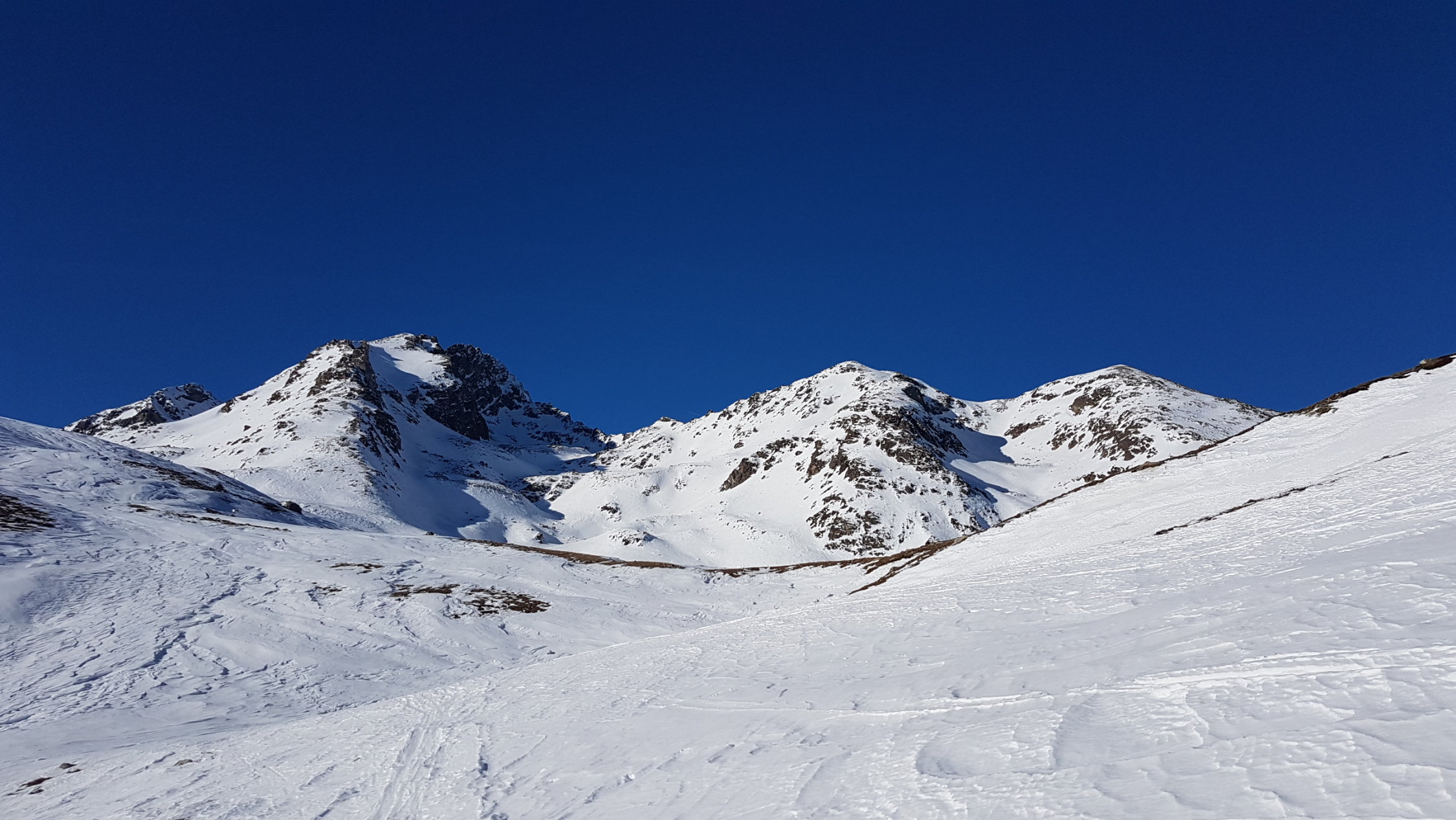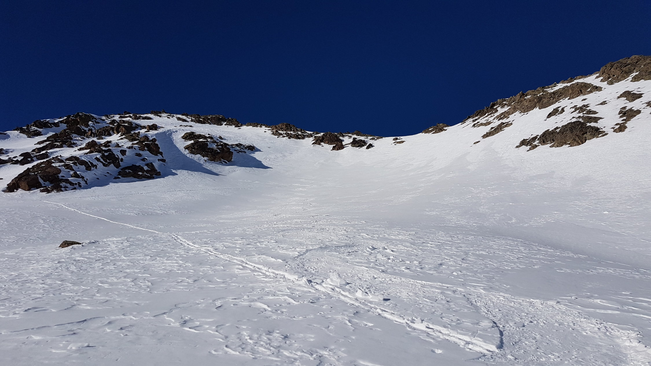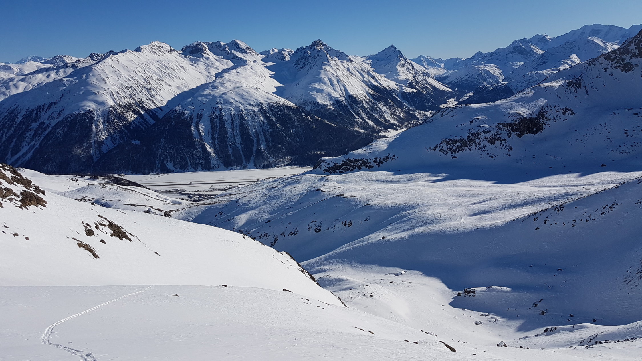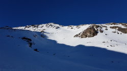 Zuoberst etwa der Aufstiegsspur entlang runter, da muss man den Weg zwischen den Steinen etwas suchen. Im SO-Hang recht gut fahrbar. Zum Teil auf tragender harter Unterlage, ab und zu ein paar Schwünge in leichterem Schnee. In der Mulde Murtiröl ins Valletta da Bever abgebogen, dort ist wieder meist windgepresster Schnee. Bin auf der rechten Seite das Baches geblieben und dann die Waldschneise runter gefahren.