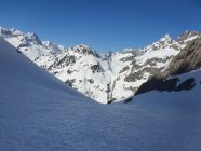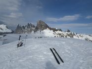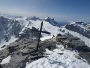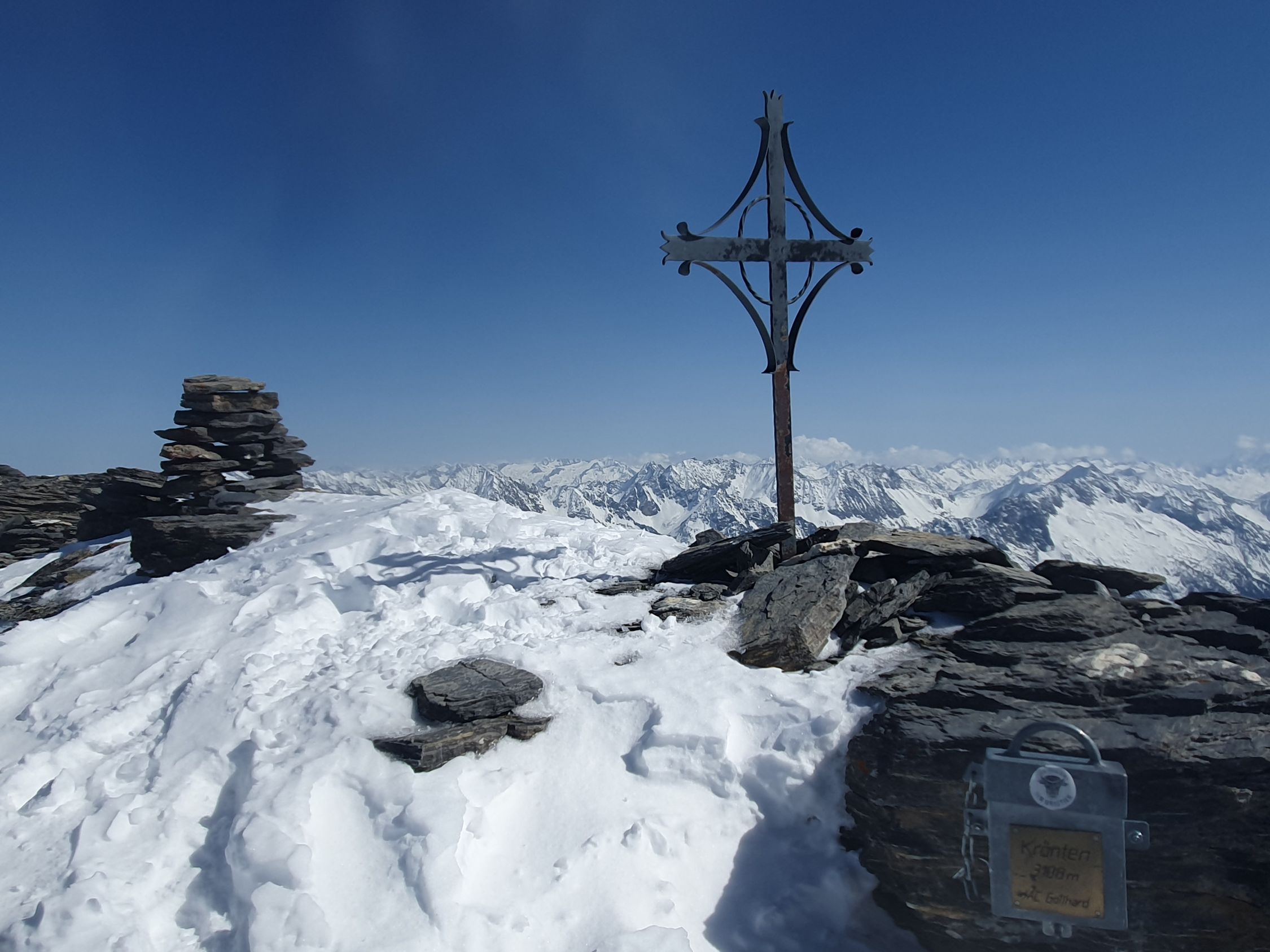 Mit den Fellen an den Ski lief oder fuhr ich leicht hinab spurlos auf dem Glatt Firn. Die Route hoch zur Kröntenlücke hatte trotz 52 Autos keine Aufstiegsspur! Das Spuren war hier mühsam, denn der Schnee war wie Styropor völlig unbefestigt. Ich war froh, bei der Kröntenlücke wenigstens eine Einpersonenspur von Süden kommend gefunden zu haben. Weiter oben auf Hartschnee griffen die Felle wieder besser. Wie die Spuren des Vorgängers aufwiesen, machte ich auch bei ca. 2950hm Skidepot. Anders als er bin ich jedoch ohne Steigeisen und Pickel weiter auf dem W-Grat des Krönten gelaufen. Der Hauptgipfel auf dem Felsen erreicht man einfach, wenn man diesen kurz östlich durch ein Couloir hochsteigt und den Gipfel von hinten angeht. Da auch ein Sicherungsring gesichtet.