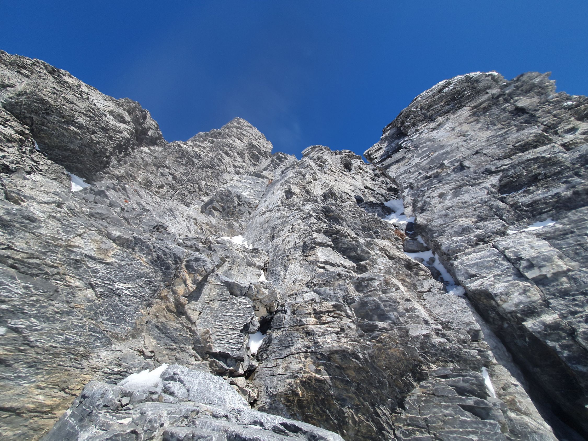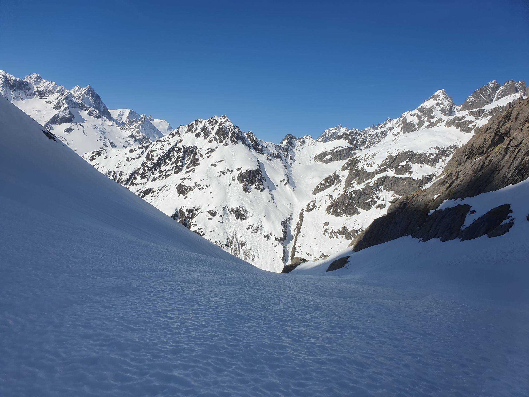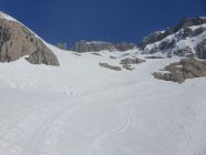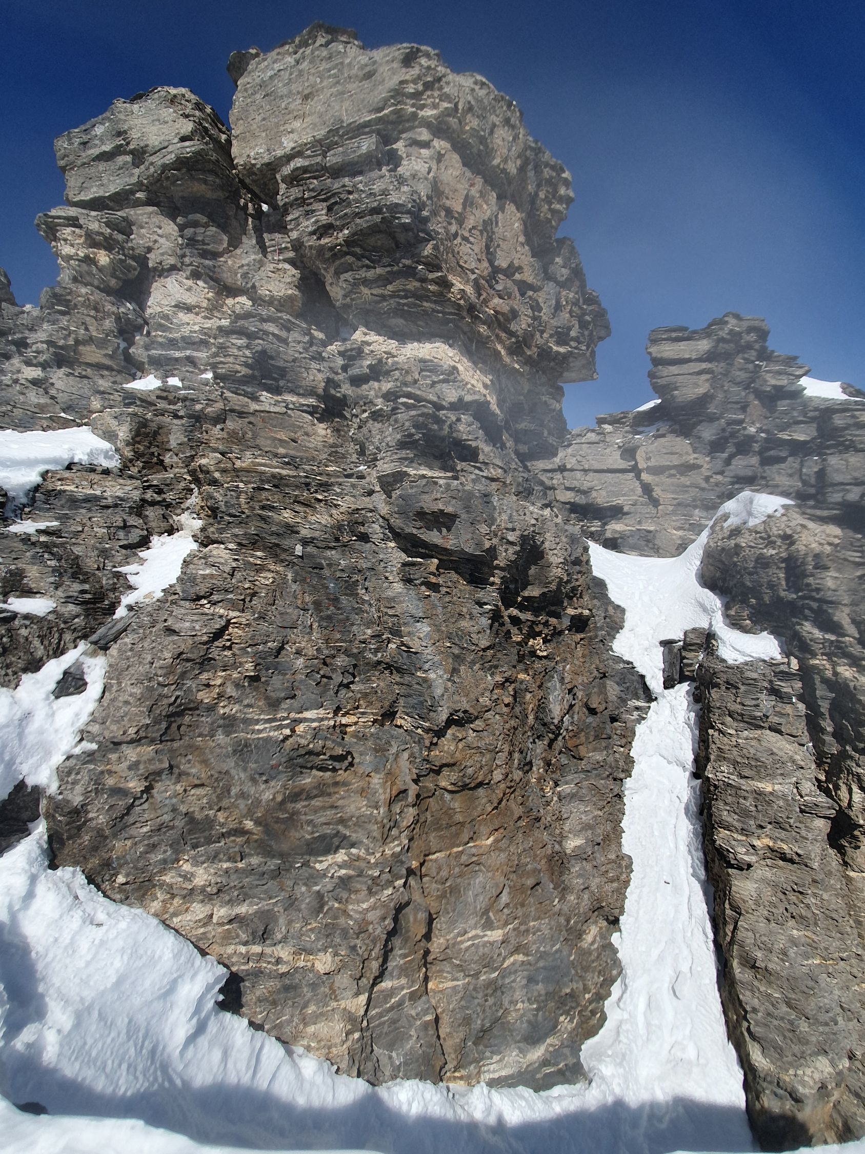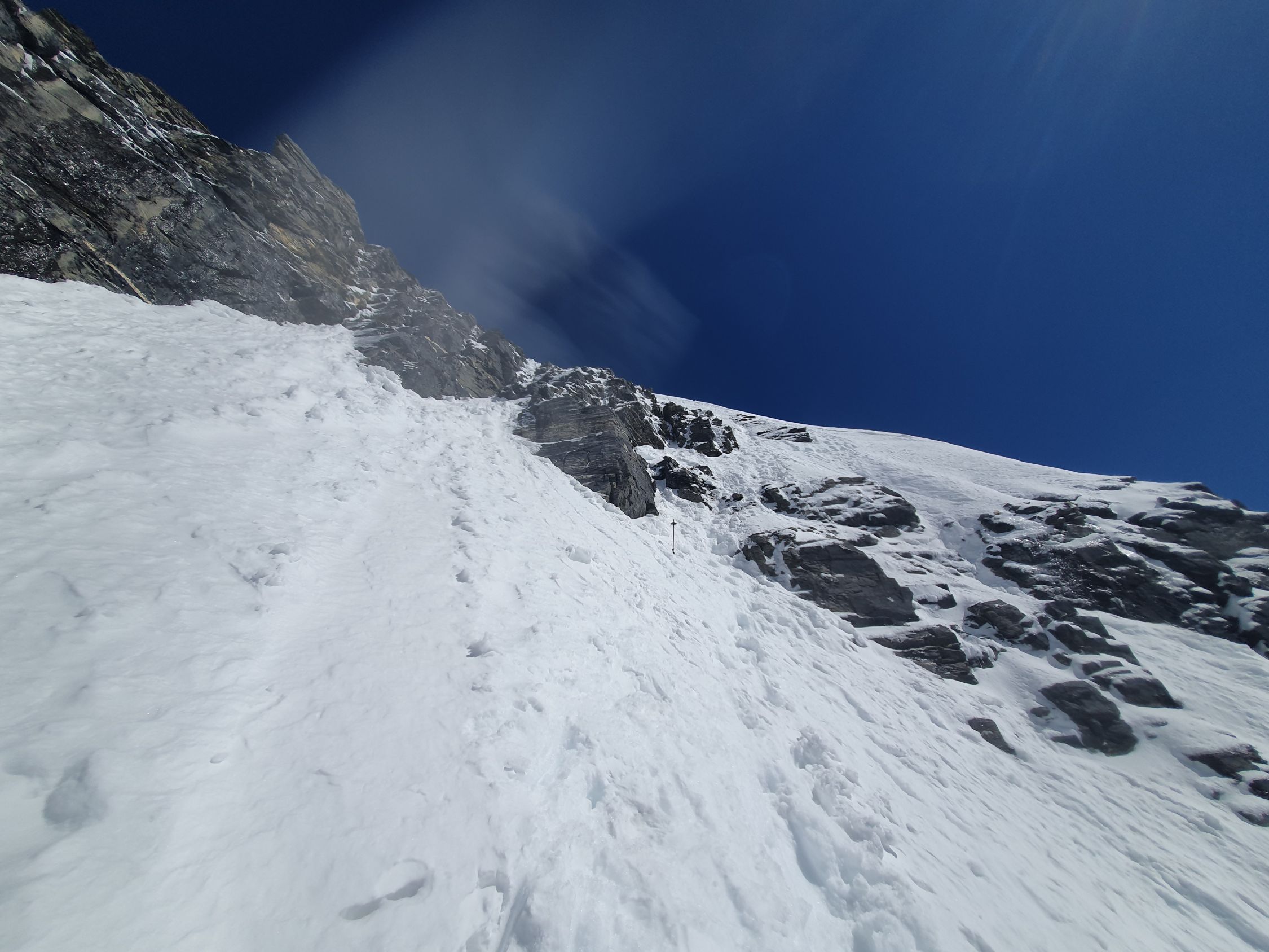 Die längere Felspassage bereitete auch keine Probleme. Ich hatte mehr Respekt von der untersten Stelle, da die Zeit dafür eigentlich schon viel zu spät war. Nanu, Schritt für Schritt ging es rückwärts hinab. Jeder 3-4 Tritt brach durch zum nächsten, was nervenaufreibend war. Den Pickel habe ich versorgt und benutzte nur noch beide Stöcke, die bis zur Handschlaufe durchbrachen, aber so mir wenigstens etwas Stabilität gaben. Unten angekommen machte ich mir etwas sorgen um den Italiener oben...