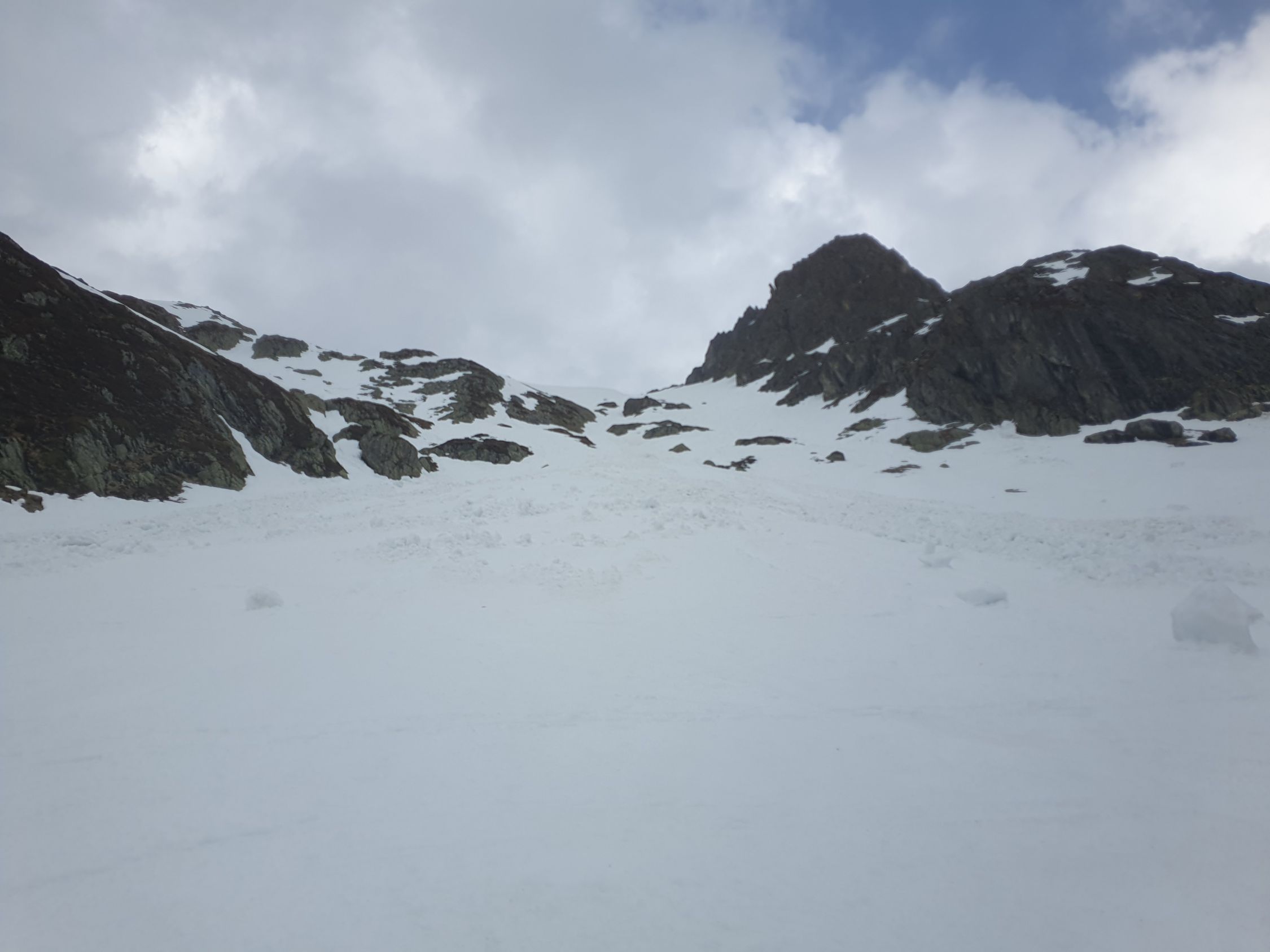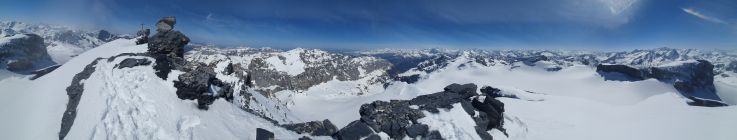 Mit gemischten Gefühlen stieg ich mit Stock und Pickel die erste Passage hoch. Der Schnee war bereits durchfeuchtet und meine Stöcke waren da aufgrund der Länge viel hilfreicher als der Pickel. Einige Schritte brachen bereits durch, so, dass ich nebenan neue einschlagen musste. Nach dieser mühsamen Passage lief ich zu den Felsen und war erstaunt, wie einfach diese zu erklettern sind (II-). Zuletzt kommt nochmals eine kleine Felspassage (I+) und schon stand ich auf dem Gross Spannort. Etwas genervt war ich, dass ich heute das Seil dabei hatte und es wirklich nicht brauchte.