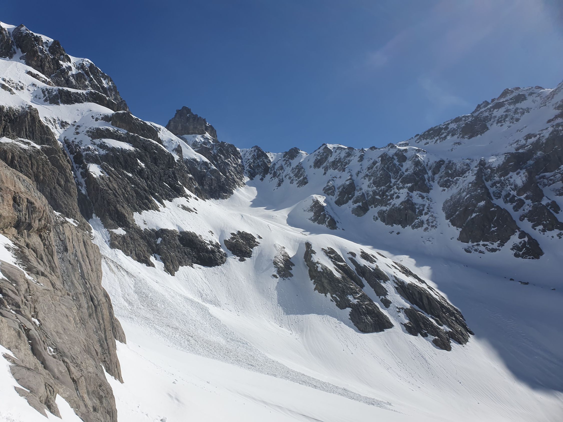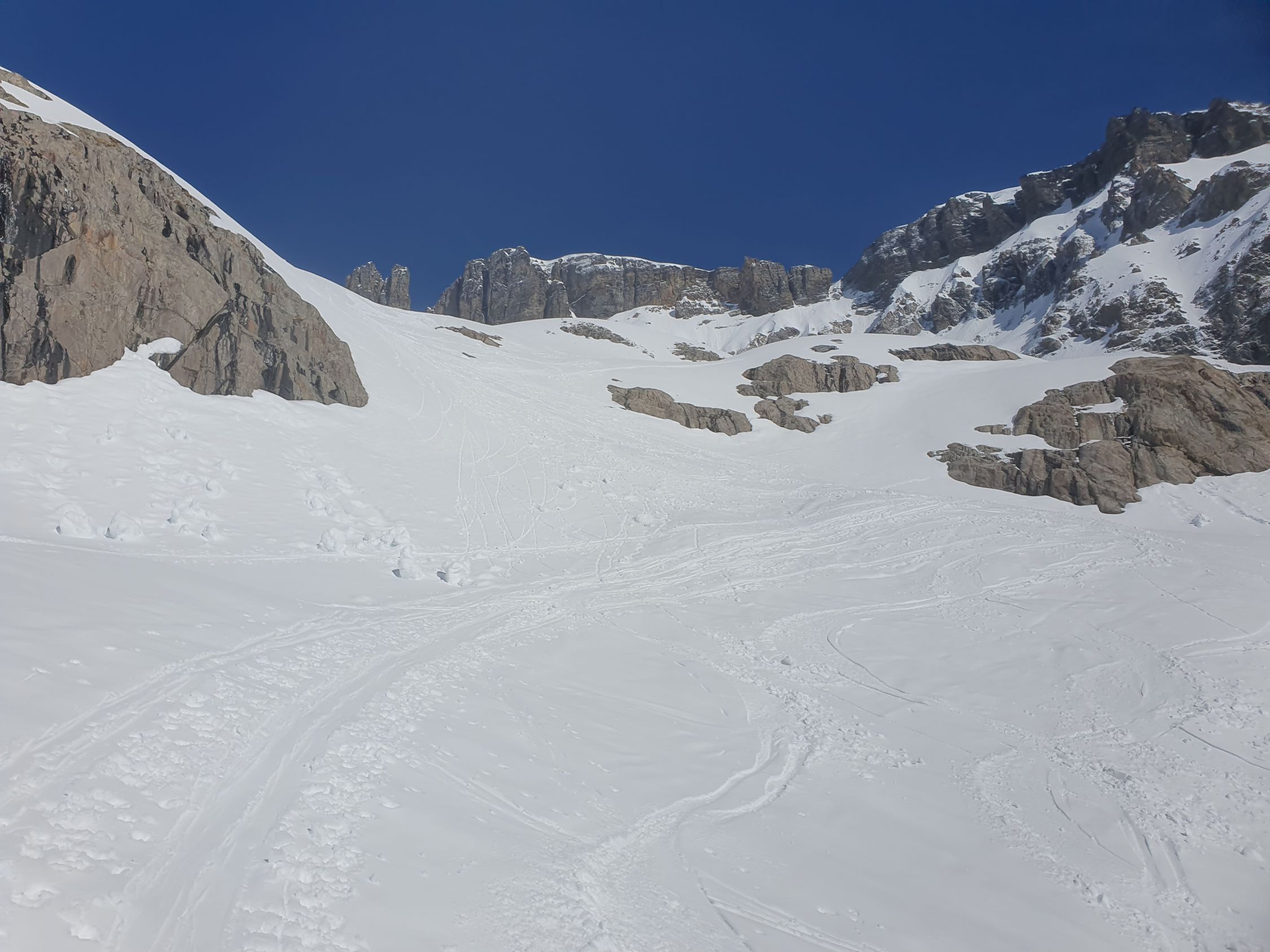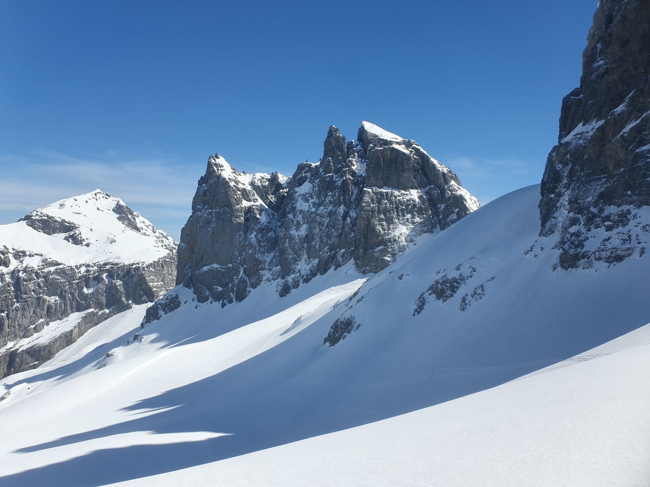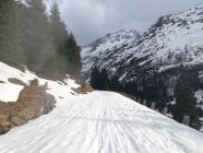 Ich fuhr durch das Chüefadfien. Zuoberst noch immer sehr schöner Sulzschnee. Mittig musste ich aufpassen, dass ich keine Nassschneelawinen auslöse, resp. ich fuhr sehe schnell hinab. Unten im Tal war der Schnee klebrig und ich musste viel Stockeinsatz bis zum Ausgangspunkt leisten.