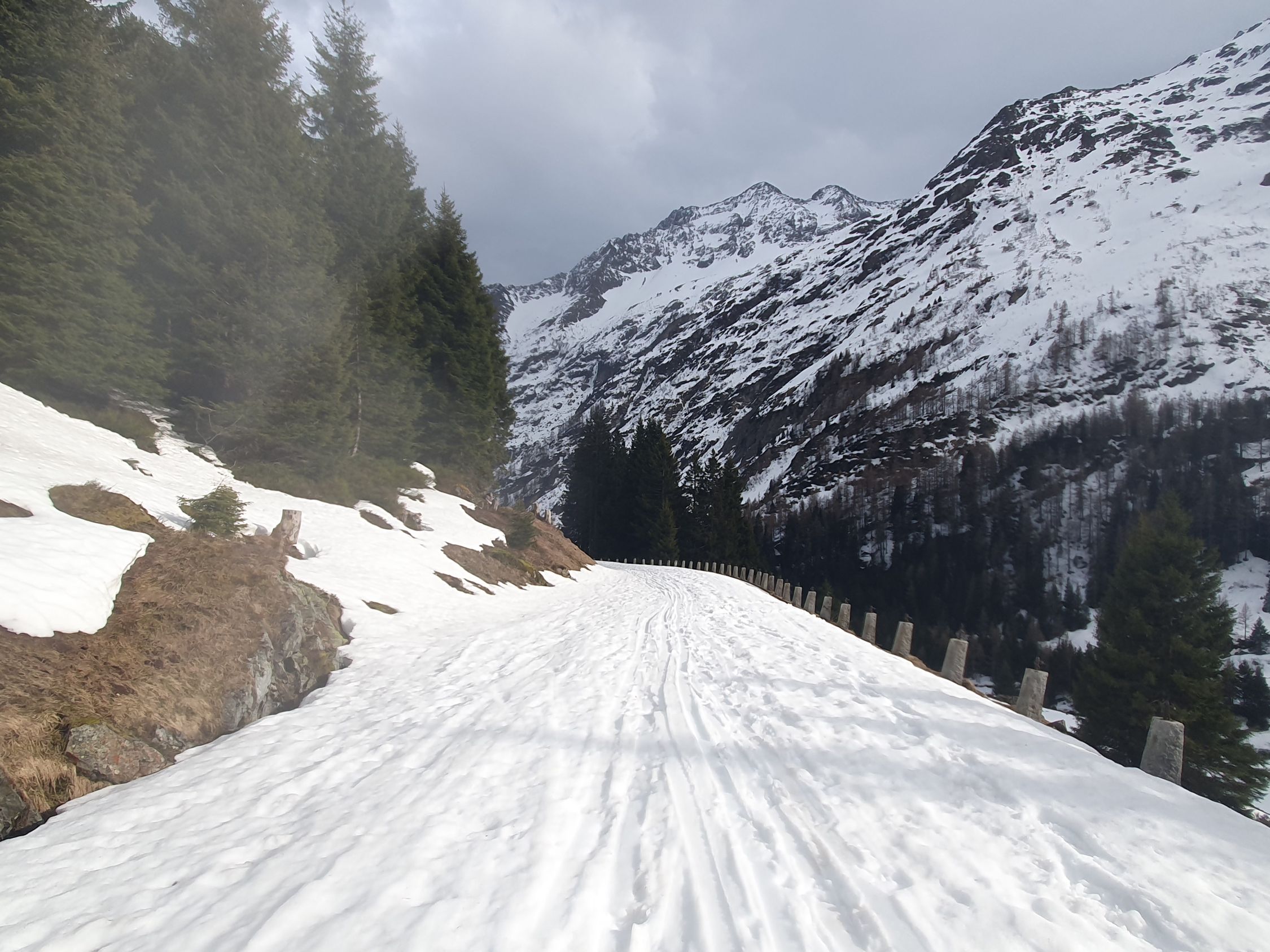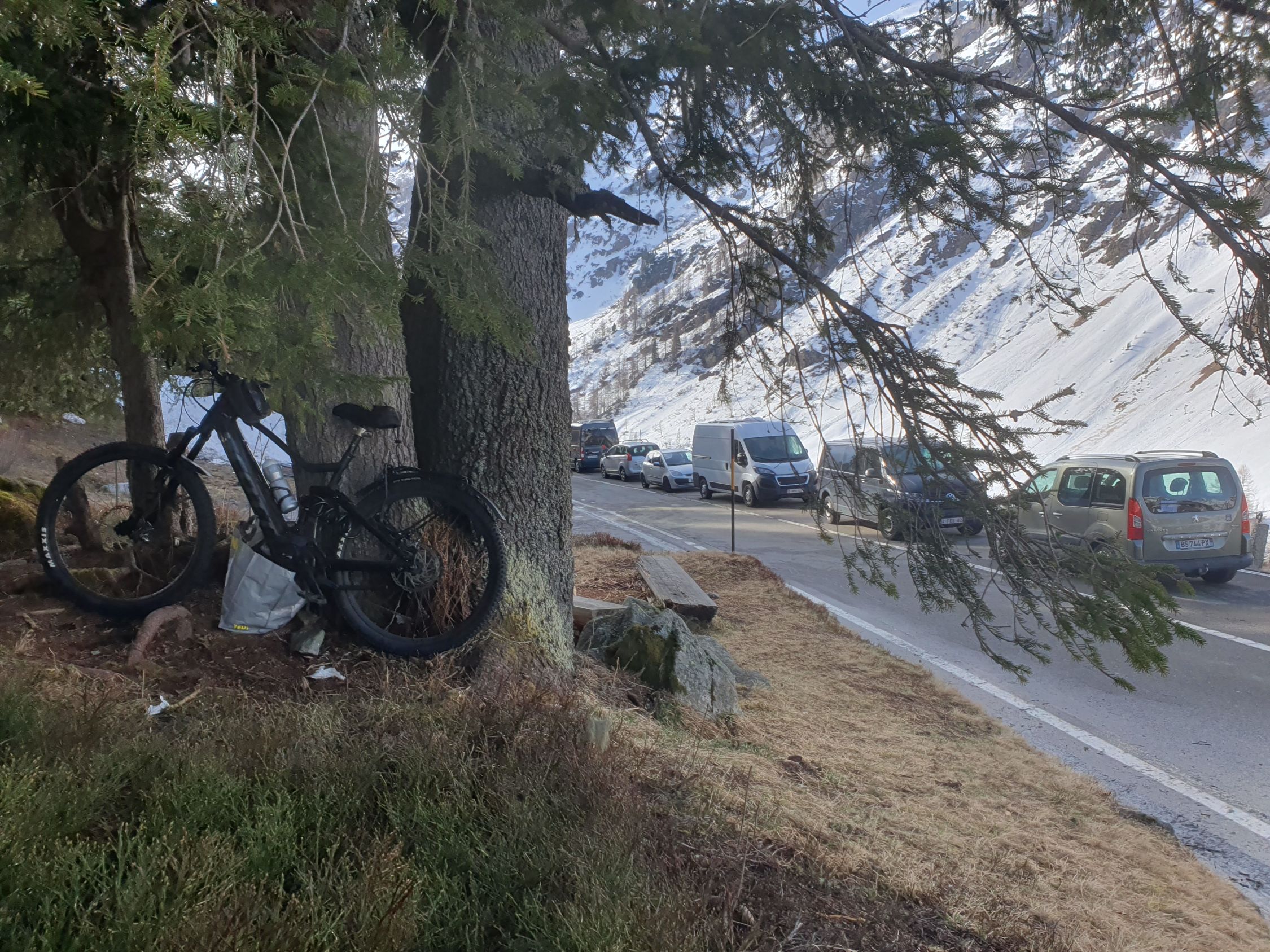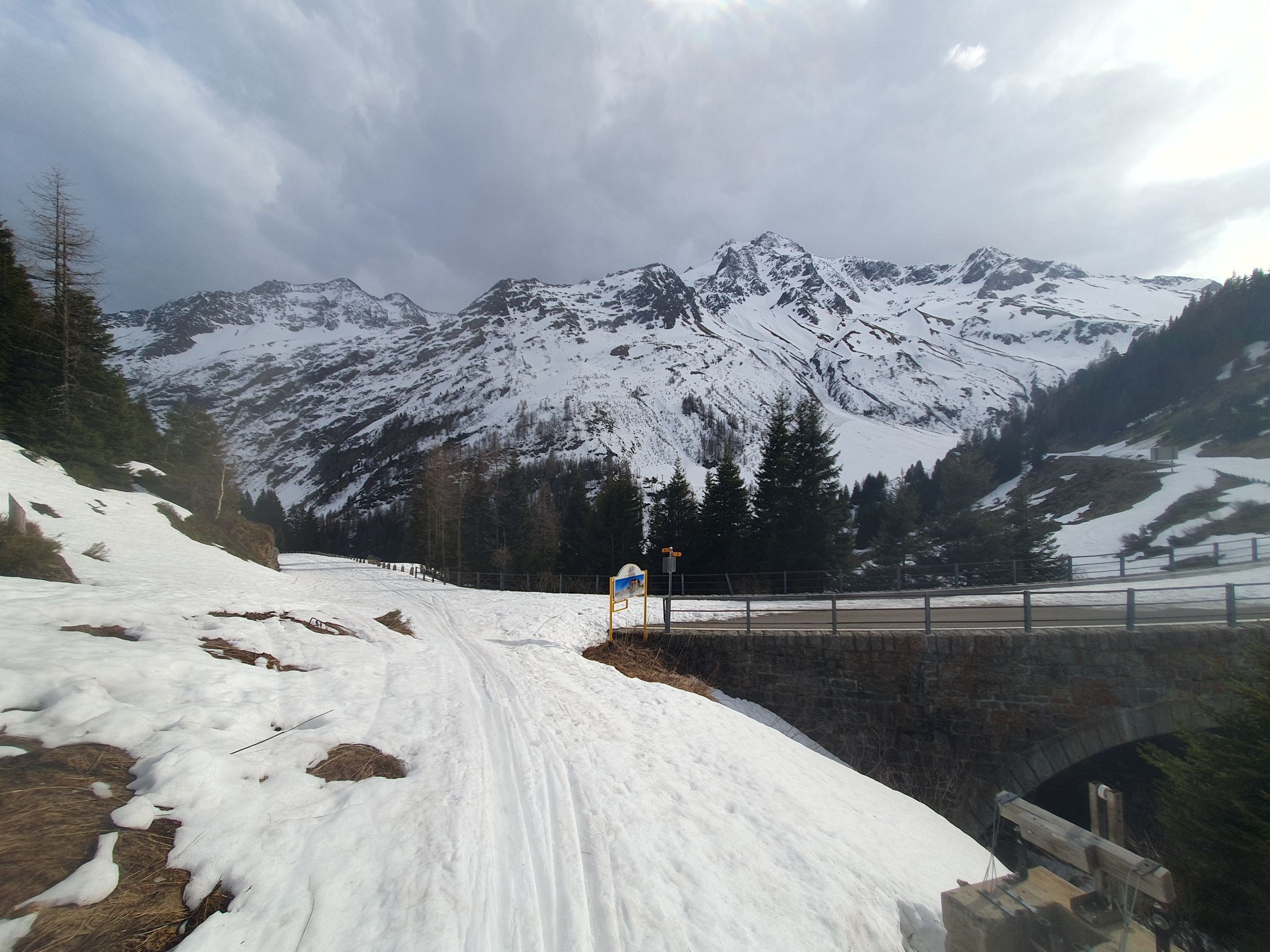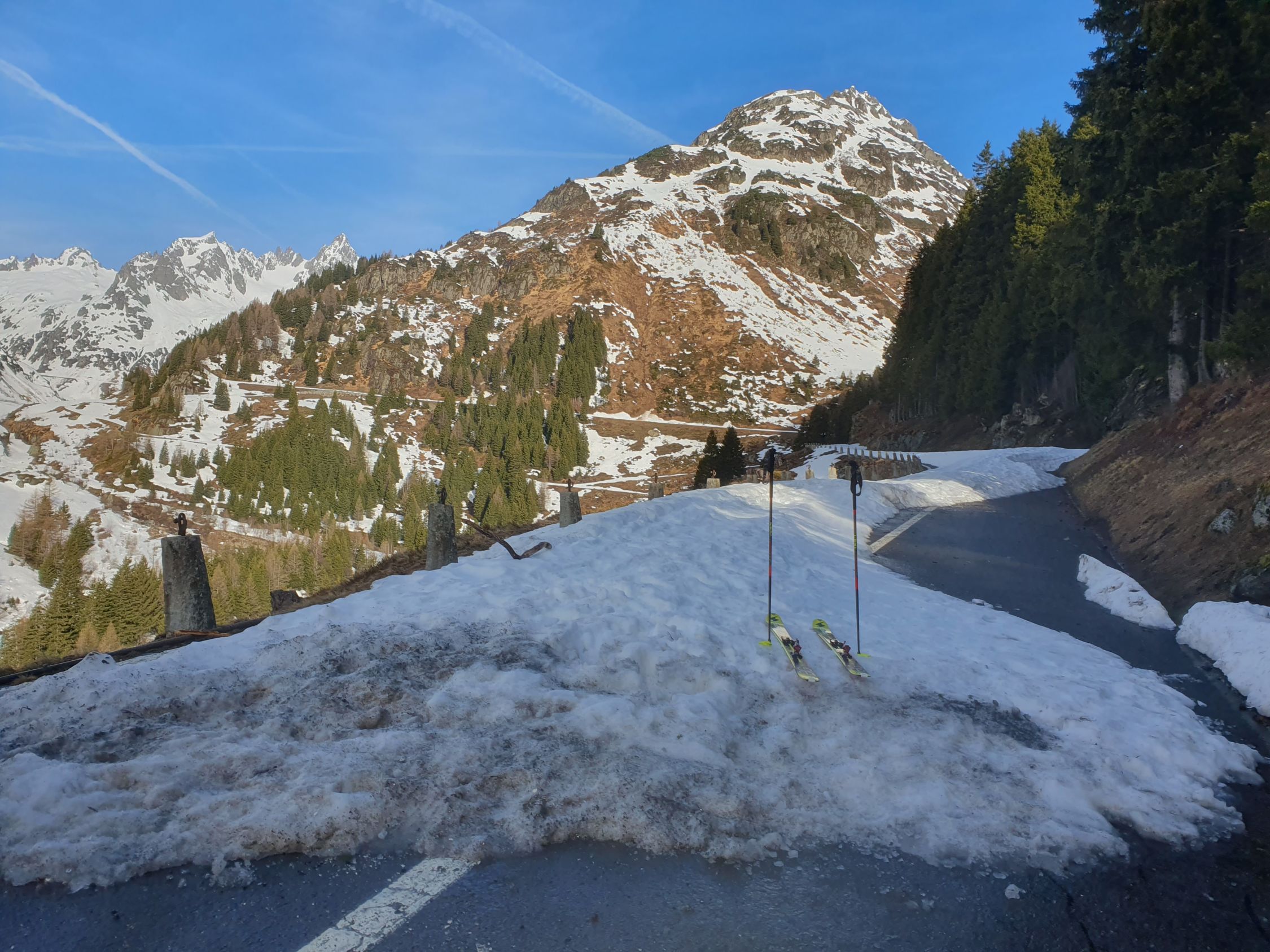 Start um 09:00 mit T-Shirt bei warmen Temperaturen von 5 Grad bei P1566 auf der schneebedeckten Sustenpassstrasse.