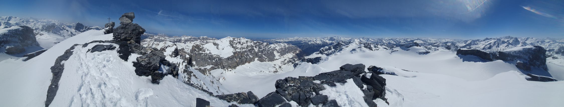Der Hang nach Rotgand war um 10:00 noch immer gefroren, wies aber eine griffige Spur auf. Weiter oben bis 2300Hm hätte ich jedoch fast die Schlittschuhe gebraucht, resp. trotz geringer Steigung war es extrem glasig und rutschig, jedoch mit Harscheisen wäre es ein leichtes gewesen. Ich war jedoch etwas unter Zeitdruck und hatte keine Zeit dafür. Der Schlussaufstieg zum Gross Spannort ist stark sonnenexponiert und sollte möglichst früh angegangen werden. Somit bin ich da mit dem Turbo-Modus hochgestiegen und habe insgesamt ganze 16 Tourengänger überholt. Die Kommentare zu meinen hochgezogenen Hosen habe ich ignoriert.