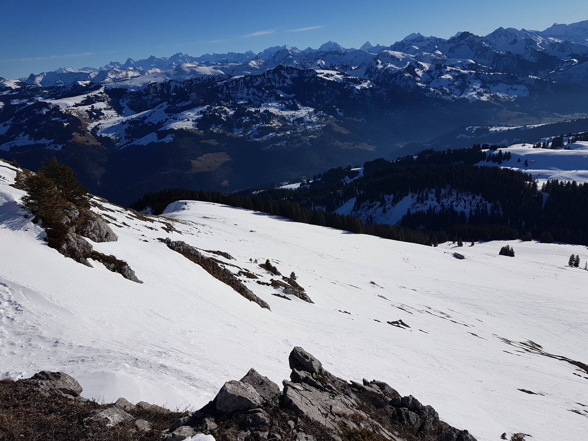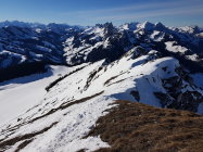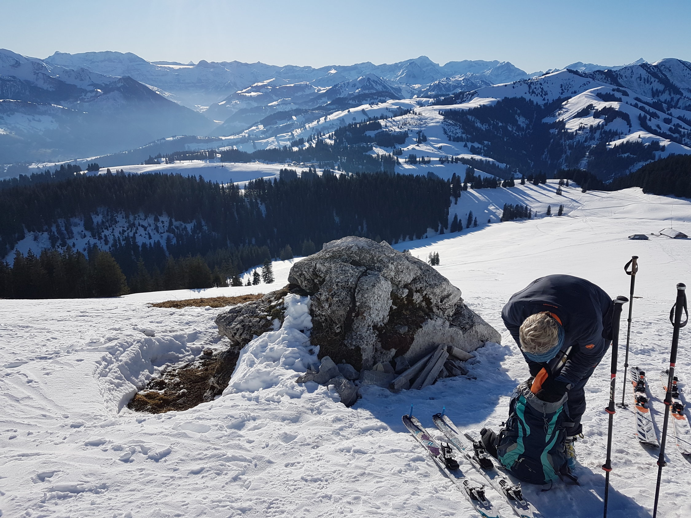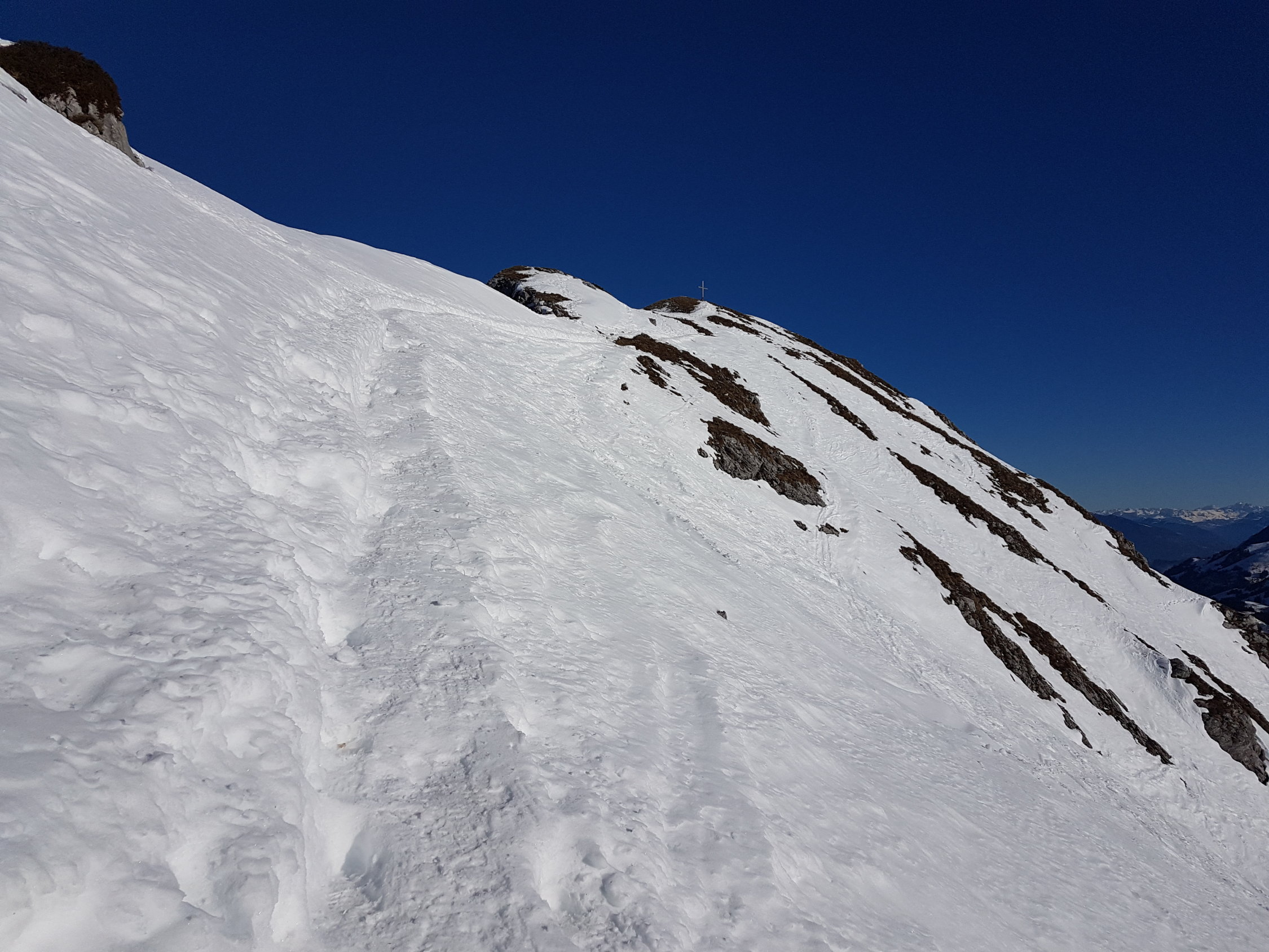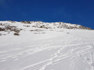 Genügend Schnee ab Jaunpass, auf einer guten Spur weiträumig zum Sattel auf 1880 MüM. Von da entlang dem Südwestgrat wo nach kurzer Zeit die Ski aufgebunden werden müssen.