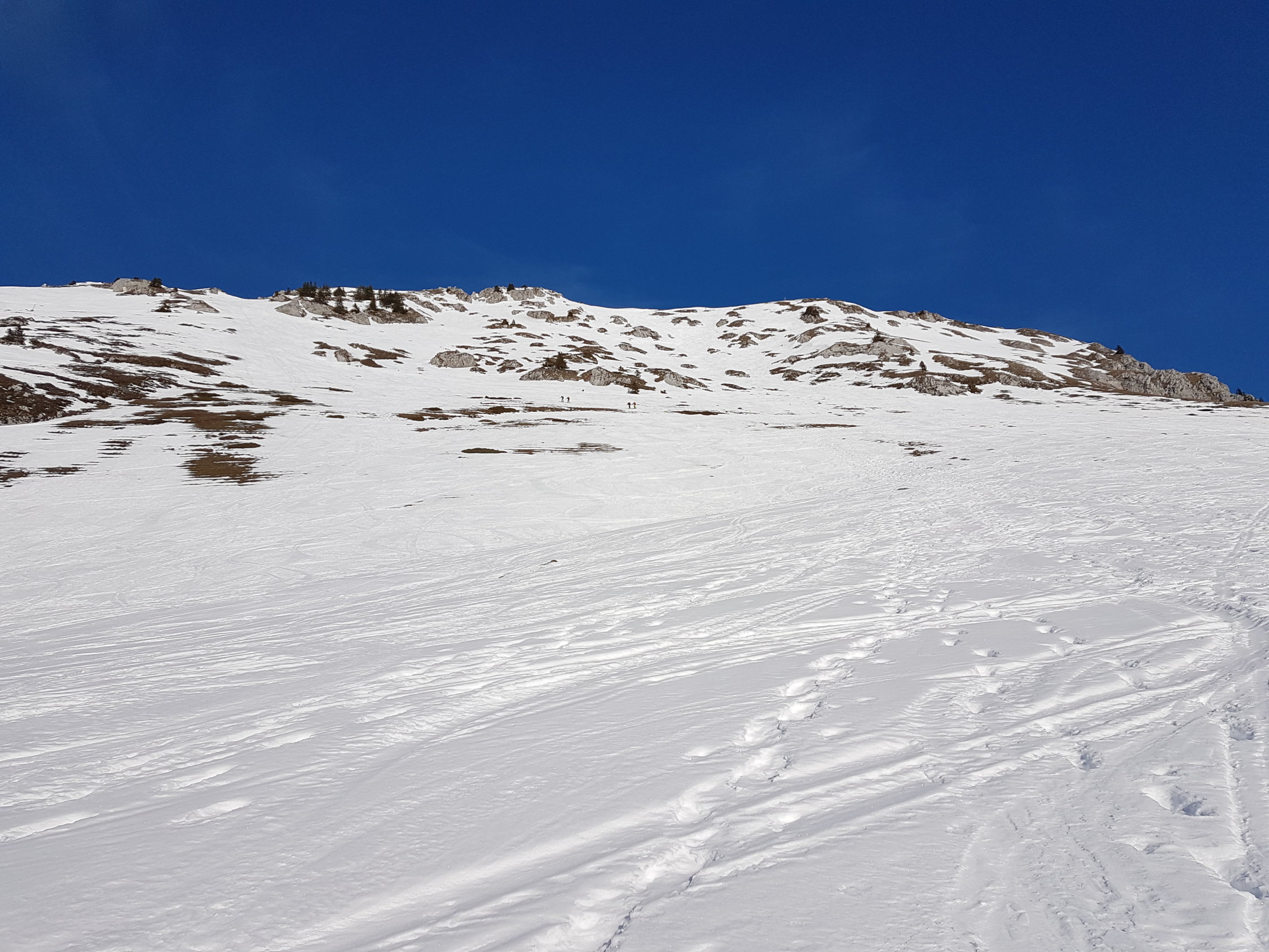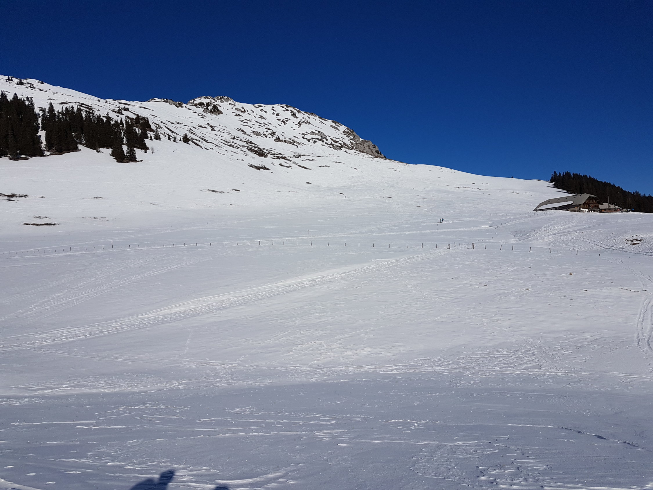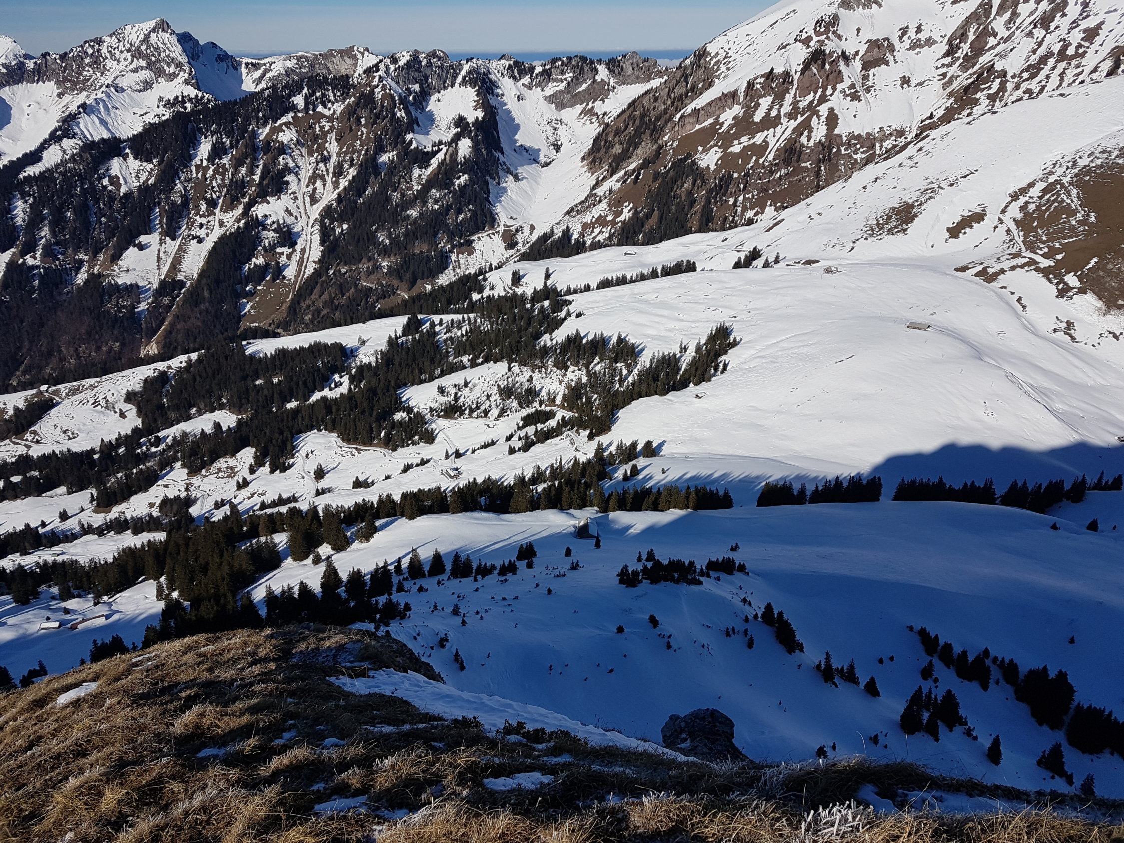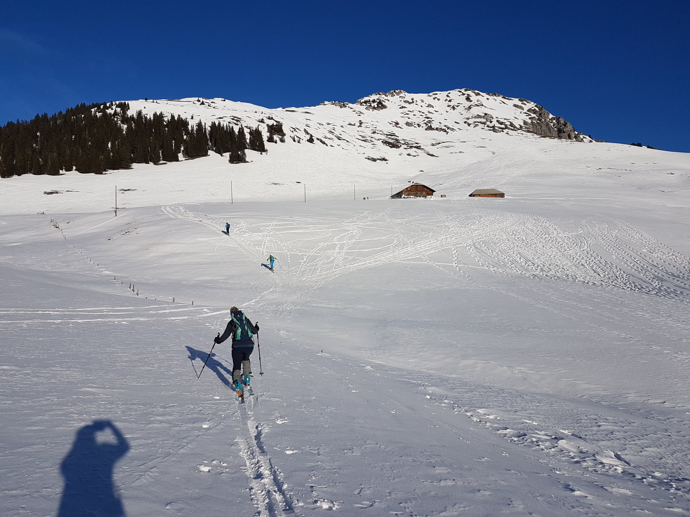 Genügend Schnee ab Jaunpass, auf einer guten Spur weiträumig zum Sattel auf 1880 MüM. Von da entlang dem Südwestgrat wo nach kurzer Zeit die Ski aufgebunden werden müssen.