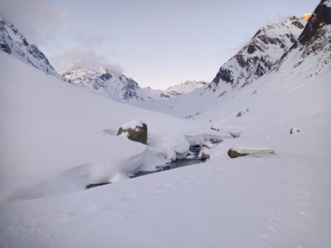 Schneedecke sehr hart, Windharsch, dafür lawinentechnisch sicher.