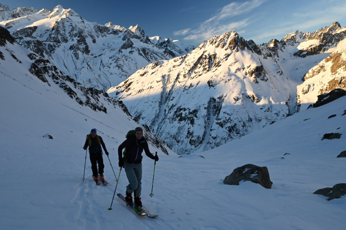 Verhältnisse den speziellen Wetterbedingungen entsprechend. In der Abfahrt mehrheitlich tragend. Im unteren steilen, südexponierten Teil unterhalb des Chüefadfirn ganz leicht aufgefirnt