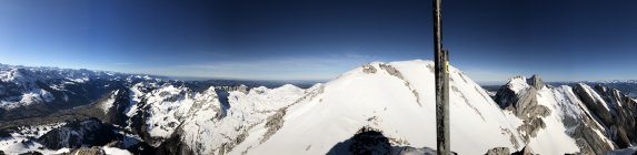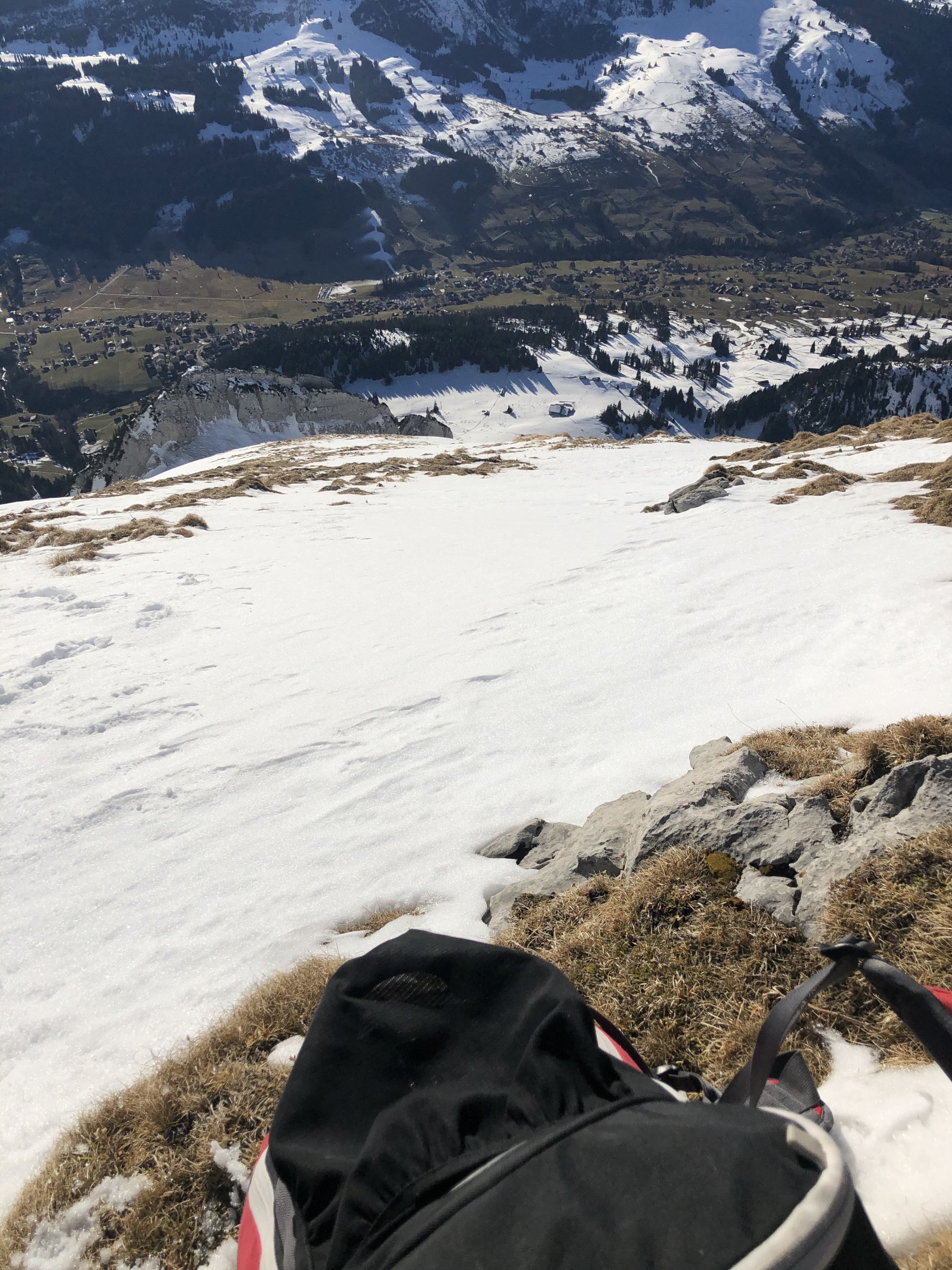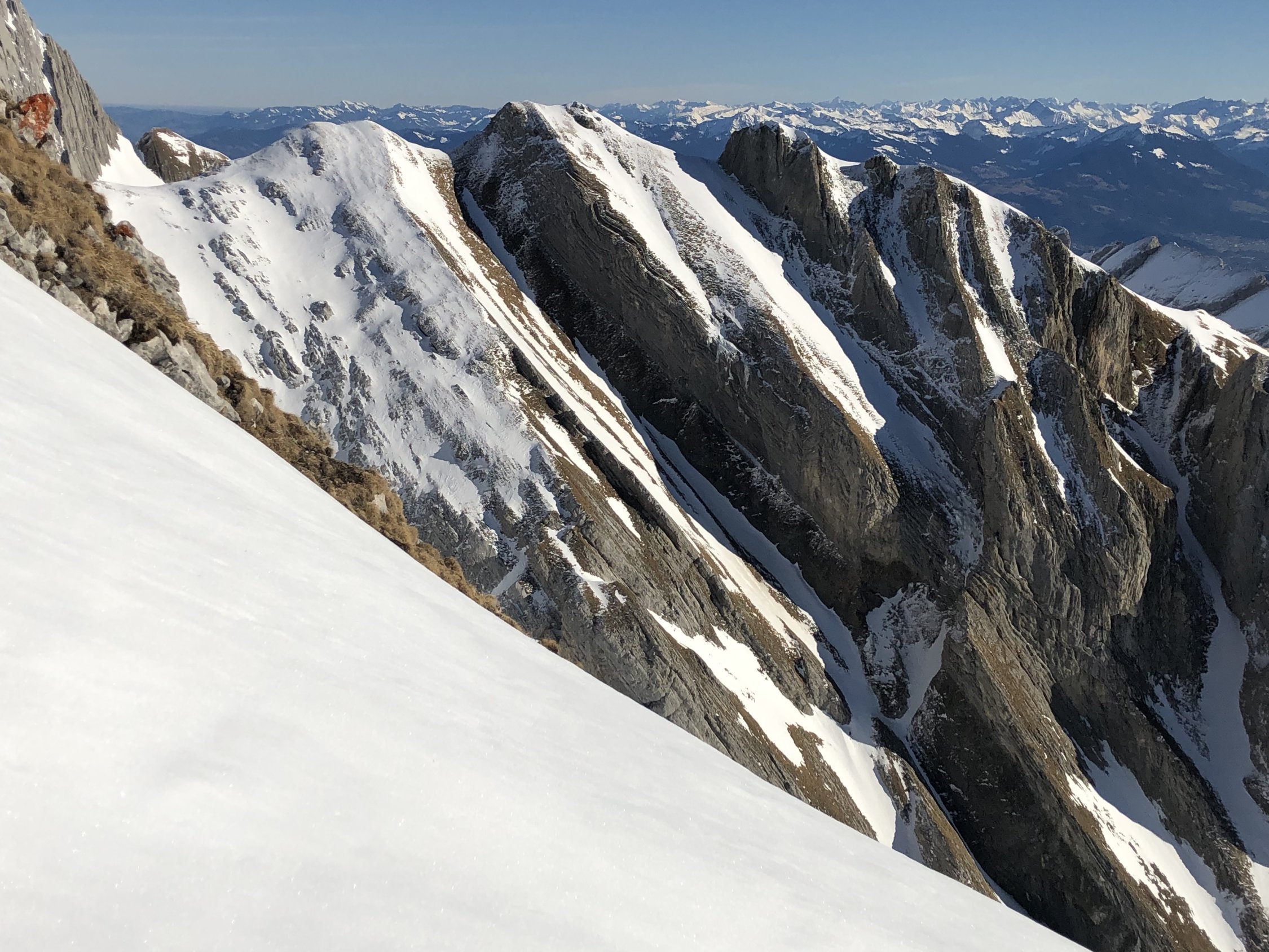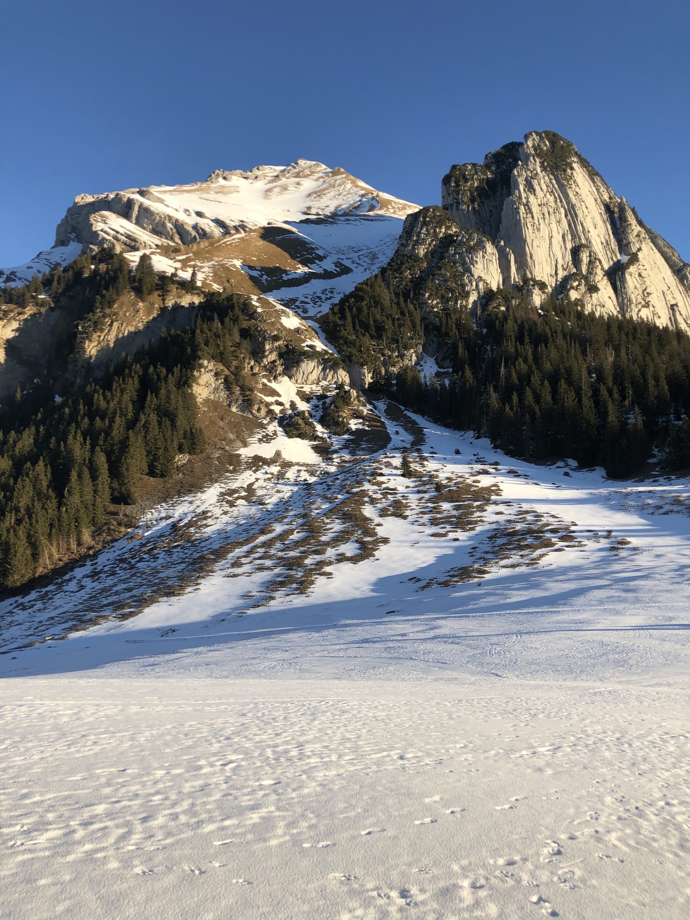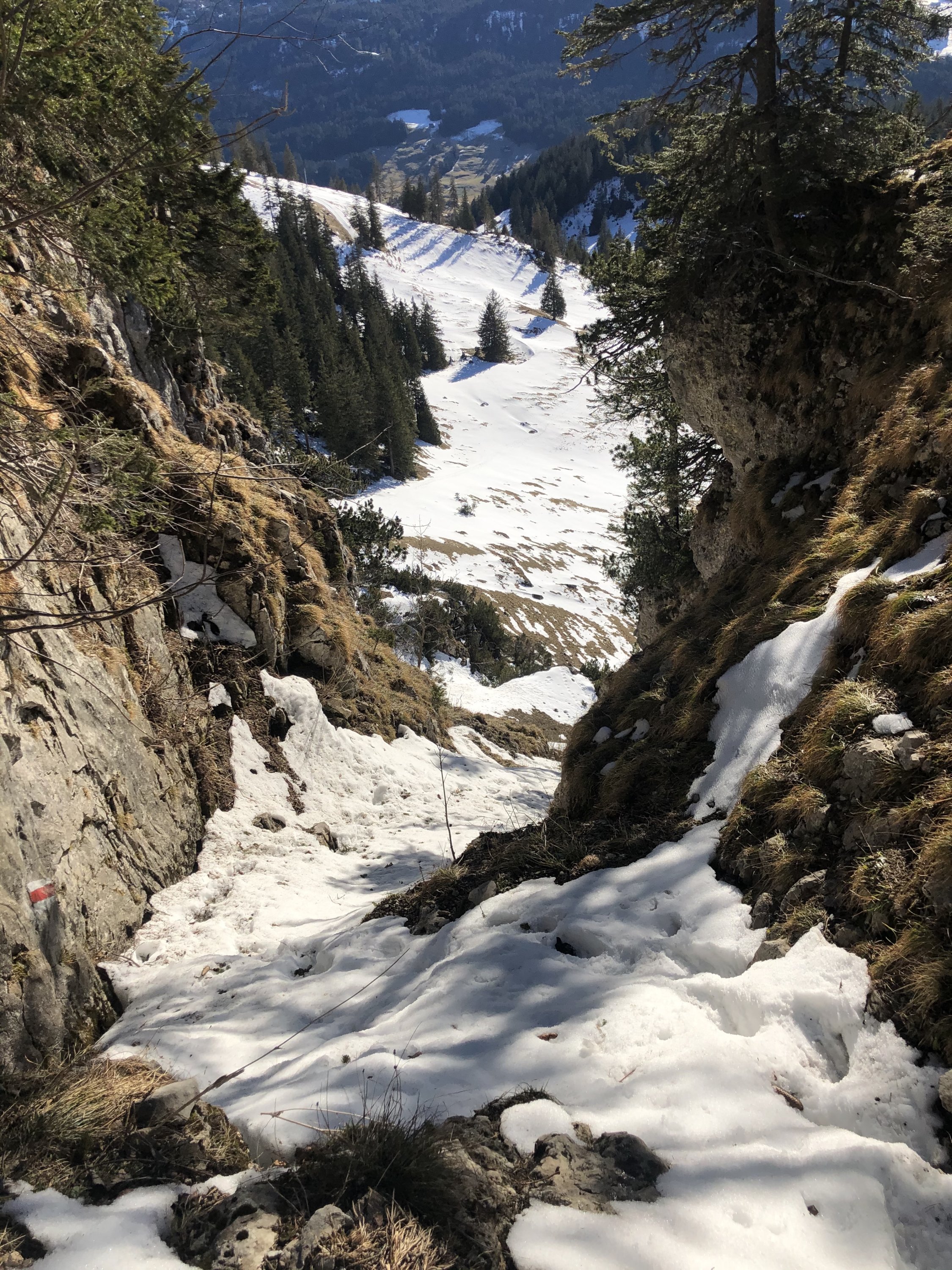 Bin zuerst um 9 Uhr mit der Bahn von Wildhaus (1080m) auf die Alp Gamplüt gefahren da Schneegrenze bei ca. 1200m (kostet CHF 15.- hin und zurück). Während andere Skitourengeher wegen Schneemangel und Steilheit abwinken, mache ich mich um 9.15 Uhr auf den Weg zum Schafberg und steige mit Fellen auf ca. 1450m rauf, wo eine Steilstufe mich zum Umstieg auf Steigeisen zwingt. Nach knapp 100Hm ist diese Stufe problemlos überwunden. Da das Gelände weiterhin um die 35° steil bleibt, steige ich in gutem Trittschnee bis zum Vorgipfel (2360m) alles mit den Eisen hoch und erreiche diesen nach 130 Minuten. Fahre nur wenige Meter unter dem Vorgipfel mit den Skis ab und geniesse ab ca 2150m feinsten Butterfirn bis zur Schäferhütte und ebenso während der letzten 100Hm zur Gamplüt.
