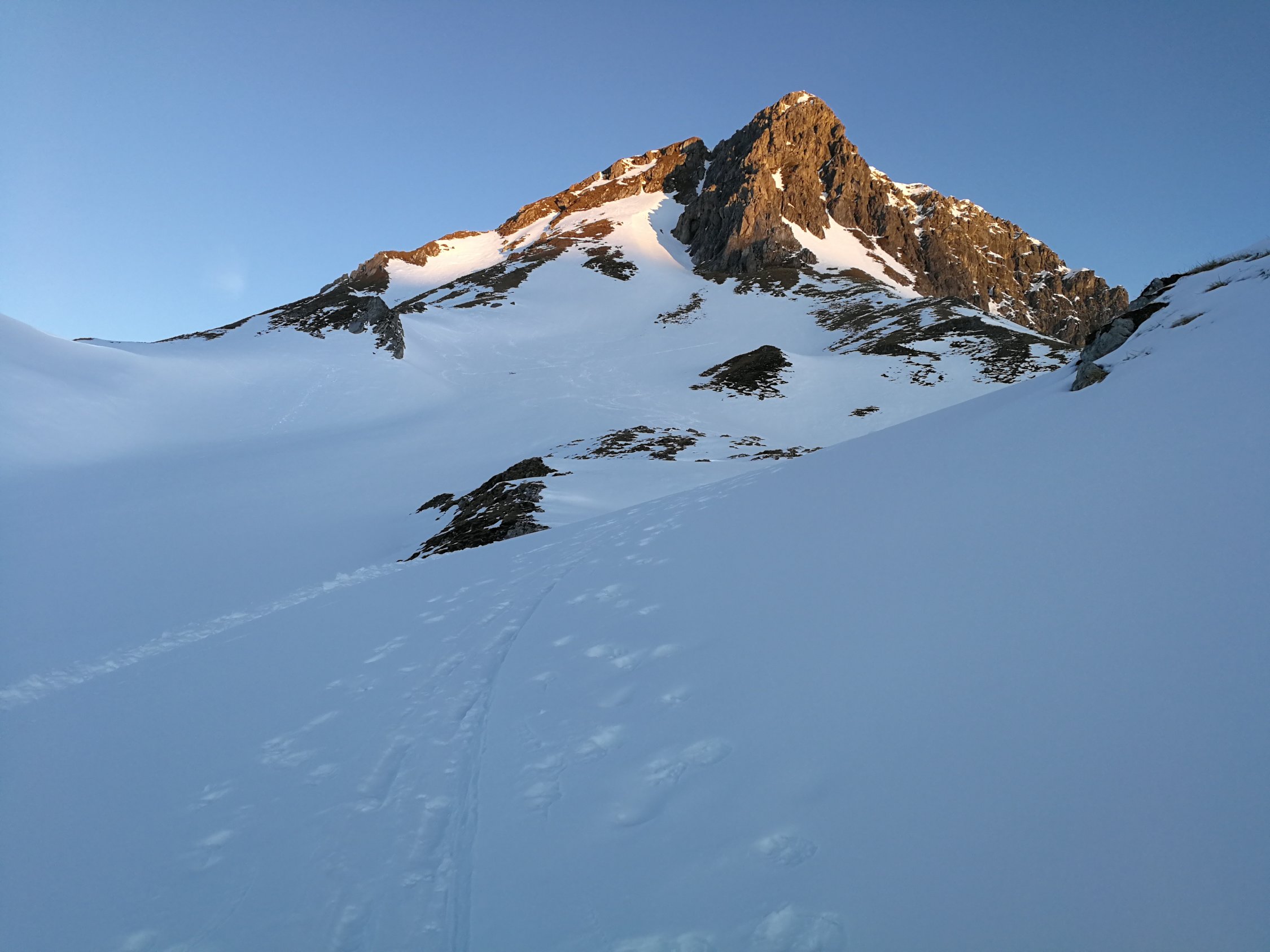 Ziehweg eisig, Teilweise Pulver. Oben Firn. Für den Gipfel Steigeisen empfehlenswert