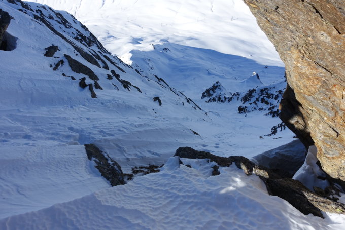Ganze Route gut eingeschneit. Teilweise sehr hart, Harscheisen sind von Vorteil. Abfahrt durch den Canalone del Marchhorn grad noch ok, stellenweise sehr hart gepresster Schnee, aber kein Eis. Die ersten 20m sind felsdurchsetzt, können aber gut abgestiegen werden. Dort gute Gelegenheit zu Skianlegen.