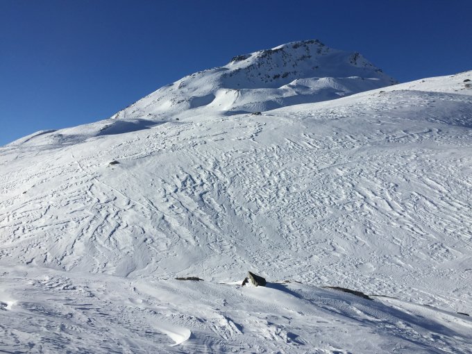 Der Wind hat auch auf den Nordseiten des San Bernardinopasses ganze Arbeit geleistet: Der Schnee hat je nach Exposition ein lustige Mischung aus Wind- und Schmelzharschkurste, grösstenteils tragend. Losen Schnee gab es noch für zwei, drei Schwünge in gechützten Mulden Richtung Passstrasse und am Schlusshang, der ist aber schon richtig durchgepflügt.