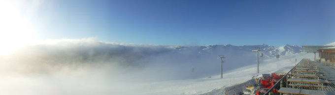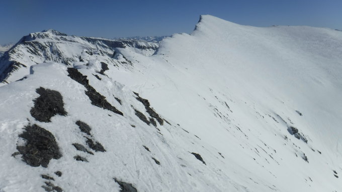 Tourenbeginn an der Bergstation Nagiens um 08:50 Uhr bei -2°C im Hochnebel, der sich mit Höhersteigen nach halber Stunde auflöste. Über den NW-Grat zum Hauptgipfel waren 2 Skispuren vorhanden, eine sehr nah am bröseligen Grat, andere 1 m tiefer. Der Grat war an manchen Stellen schneefrei. Bin den NW-Grat hinüber zum Hauptgipfel und Südwestflanke hinab mit Steigeisen und Pickel (letzterer jedoch nicht zum Einsatz kommend) gelaufen. In der SW-Flanke waren 4 Abfahrtspuren vorhanden. Die steile Bergflanke war m.E. nicht mehr schneebrettgefährdet, allerdings stark überfirnt, jedoch nicht pickelhart, so dass die Steigeisen noch gut griffen.