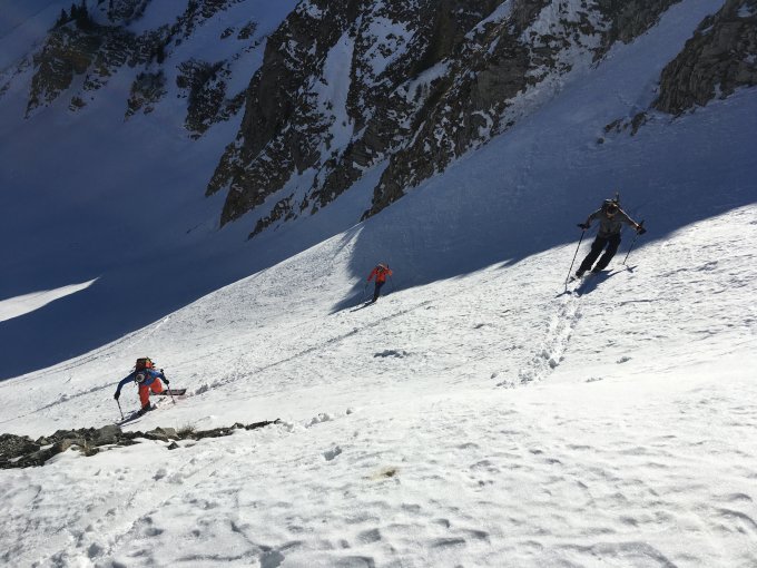 Abfahrt durch die Nordwand bis auf den Engpass fahrbar, dort muss kurz sehr steil zu Fuss abgestiegen werden.