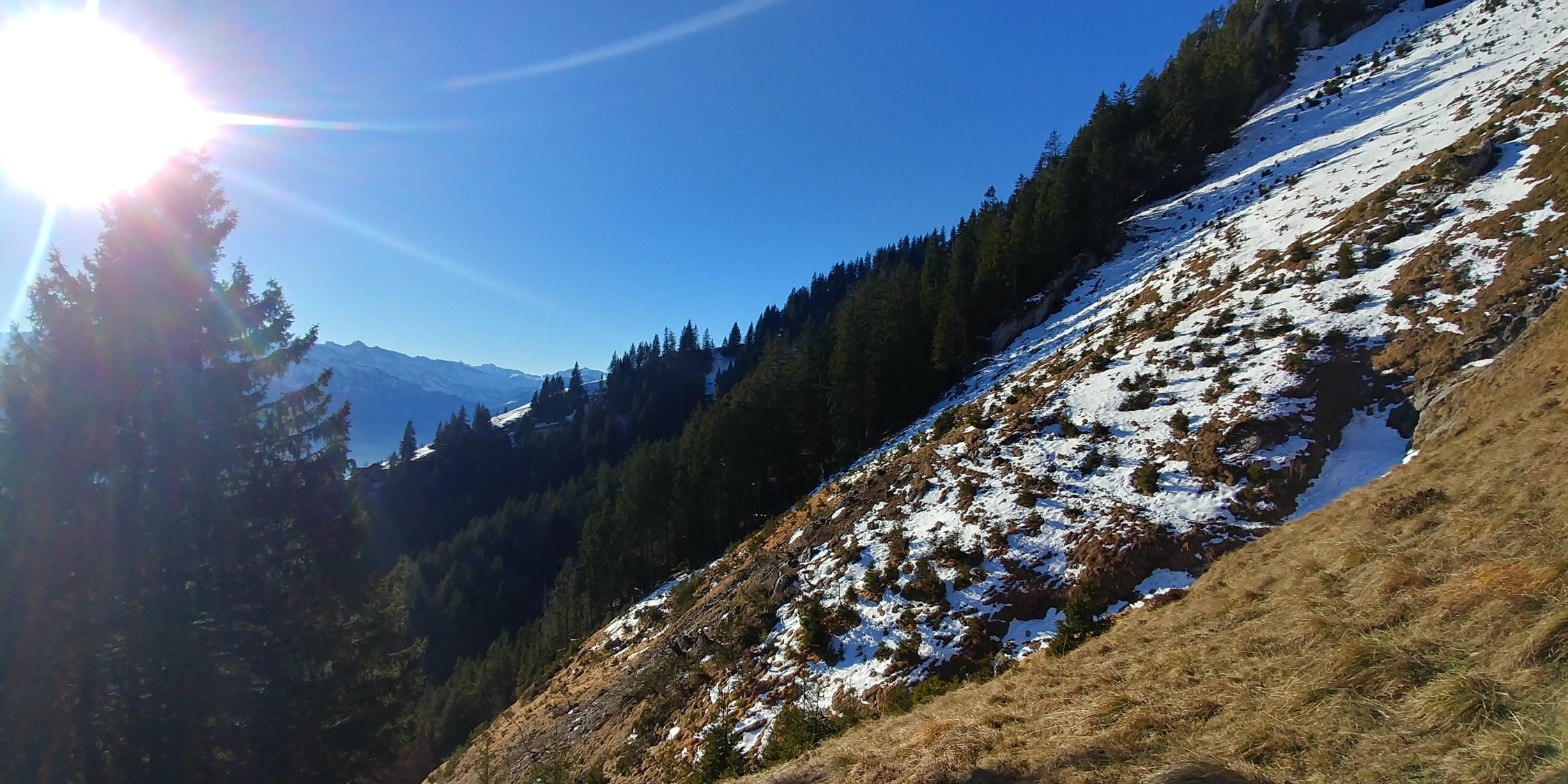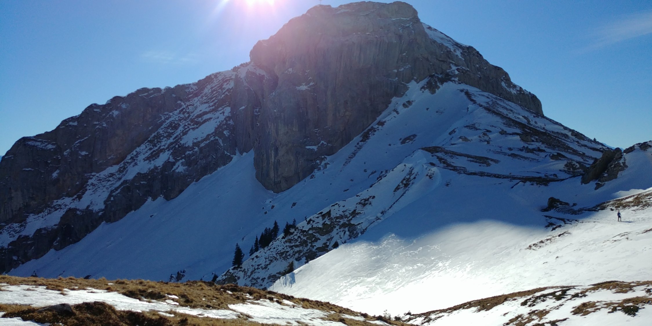 Kurz bevor der Weg in den Kessel bei Chlingen einbiegt, haben wir uns an einer 40°+ steilen, abschüssigen Stelle mit etwa 20m Länge entschieden, die Steigeisen aufzuziehen. Es wäre m.E. knapp ohne Steigeisen gegangen, aber wir haben uns doch deutlich wohler mit gefühlt. Auf dem restlichen Weg bis zum Gipfel dann hautpsächlich Trittschnee. Grödeln oder Microspikes sind für diesen Teil aber auch zu empfehlen.