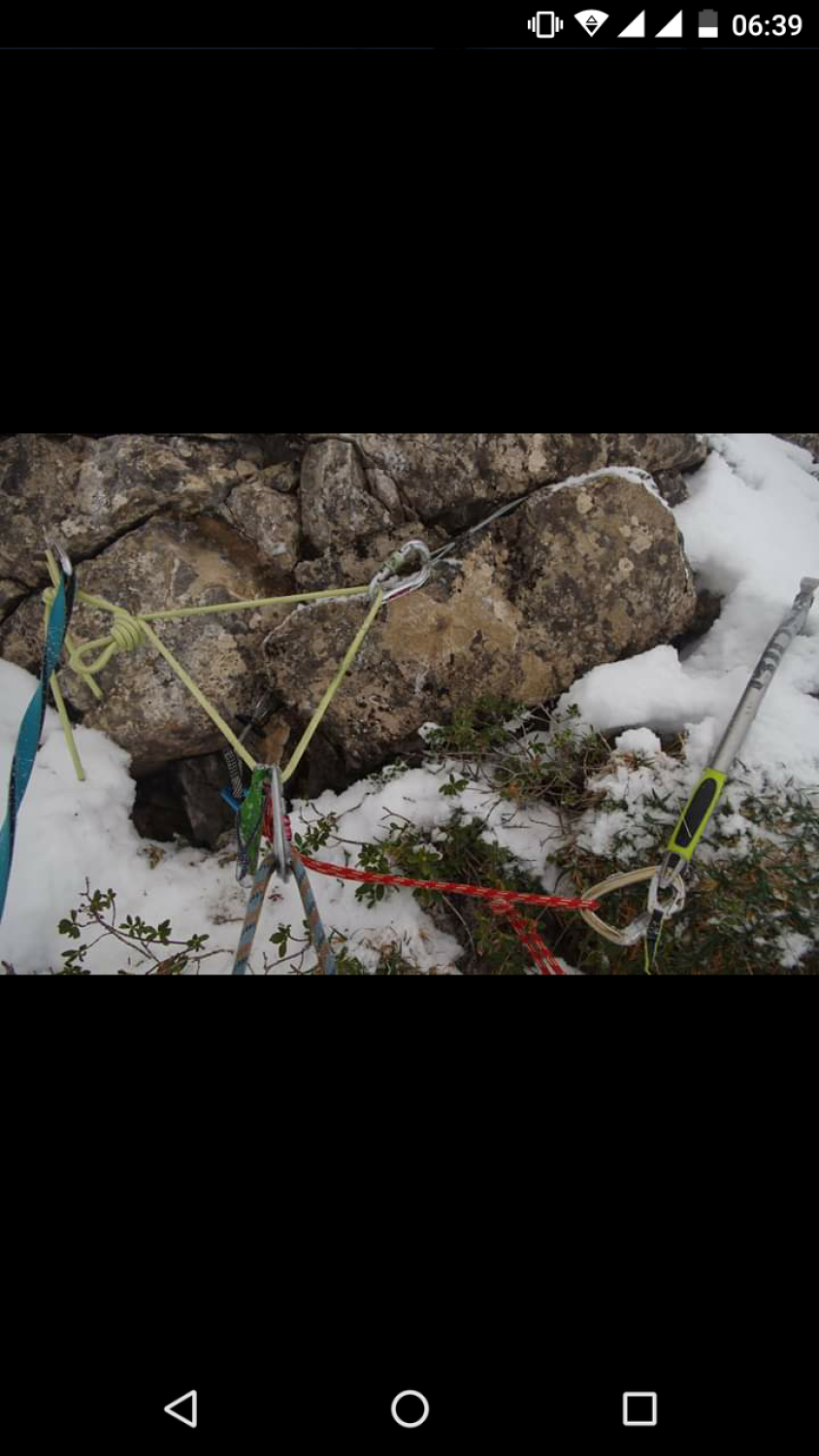 Einer von 2 Schlaghaken am Stand nach der 4.SL ausgebrochen. Schwer einen neuen guten Platz dafür zu finden. Wir haben mit einem mittleren Friend, einem KK und einem Eisgerät ergänzt, trotzdem möchte ich in den noch verbliebenen Haken nicht stürzen ;).