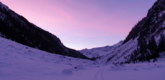 Im Val Russein hat es noch vereinzelt Pulver ansonsten hart bis sehr hart. Die Übergänge sowie der Glatscher da Gliems sind die Ausnahme und eine Mischung zwischen Sulz und aufgeweichtem Harsch. Rechts an der Porta da Gliems sind Ketten angebracht um den Bergschrund zu umgehen. Bis Malpass ist die Strasse mehrheitlich schneefrei und es darf zu Fuss eingelaufen werden.