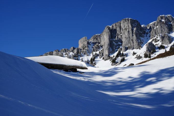Um 10 Uhr im Meniggrund -4°C. Die Tour ist durchgehend mit Schi begeh- und befahrbar. Die Alpstrasse ist bis zum Brätliplatz hart mit einigen eisigen Stellen. Danach gute Schneeauflage und angenehmer zu gehen. In dem engen Tälchen welches in die Chäle führt eher wenig Schnee aber im Aufstieg gut zu gehen. Durch die Chäle Piste bis zum Gipfel. Da ungemütlich kühler und mässig starker Wind aus westlicher Richtung. Abfahrt: Durch die Chäle Piste. Nach der Querung zu den Hütten bei Luegle etwa 100 hm Windharst meist tragend und gut zu fahren. Danach in dem Graben des Bächleins bis zur Alpstrasse schöner Pulverschnee. Danach der Alpstrasse entlang und kurz nach Pkt. 1792 durch ein enges steiles Couloir mit super Pulver. Von da kleiner Gegenanstieg zur unteren Guetmatt Hütte. Pulver bis zum Menigbach. Der Alpstrasse entlang mehrheitlich Hartschnee und ab Brätliplatz hart und etwas eisig bis zum Parkplatz.