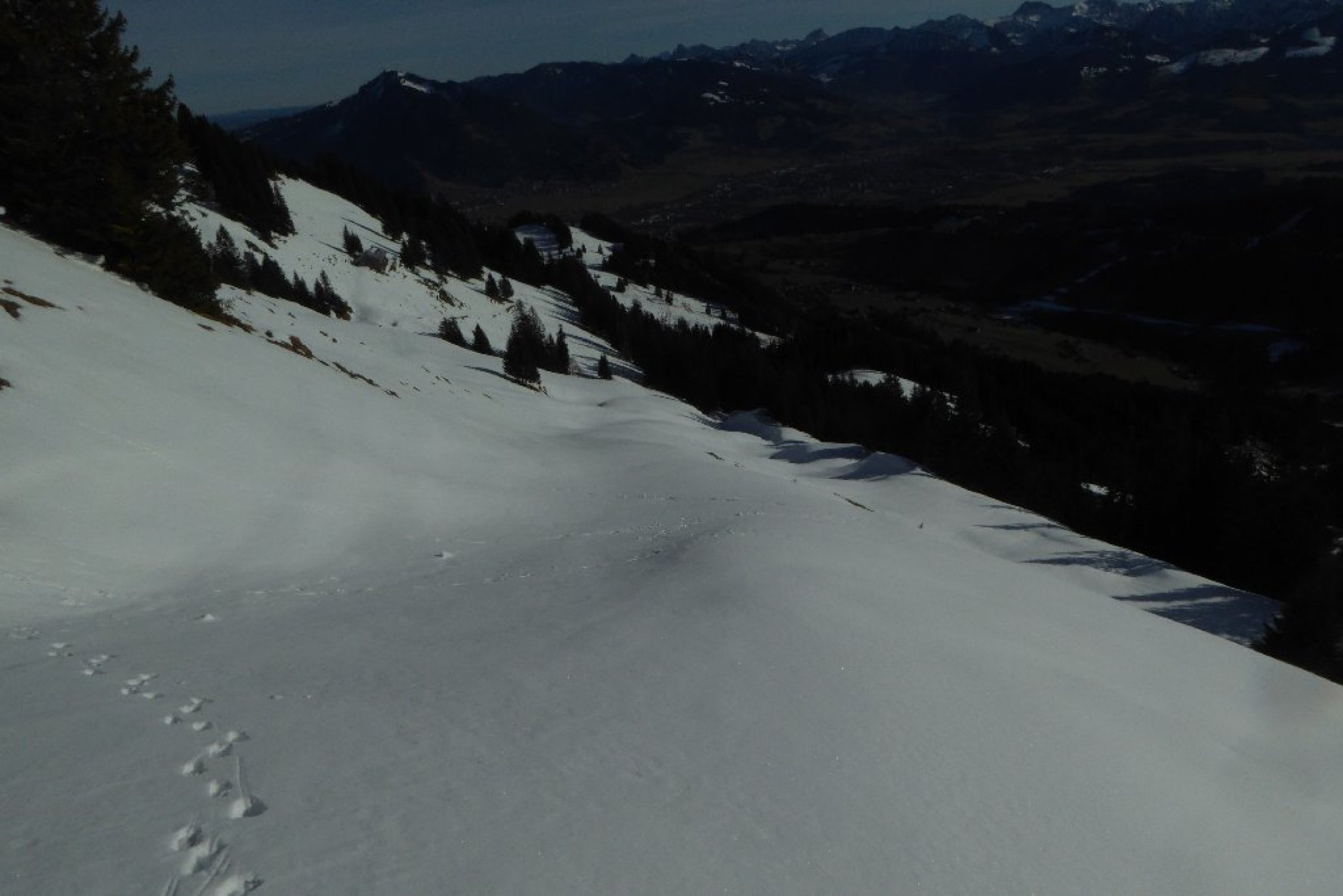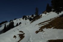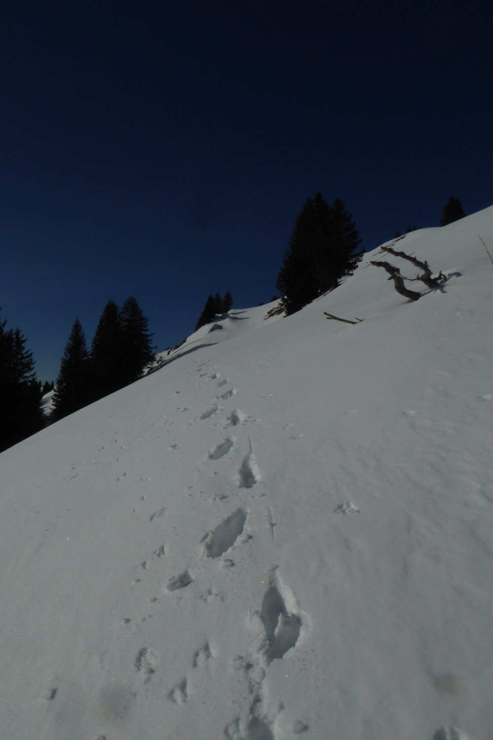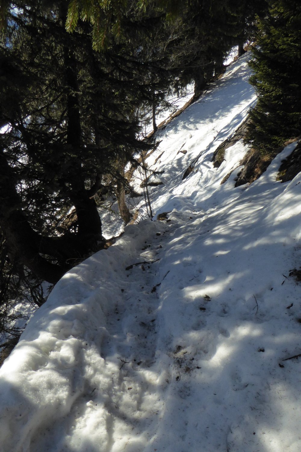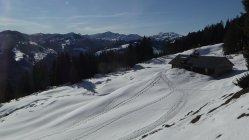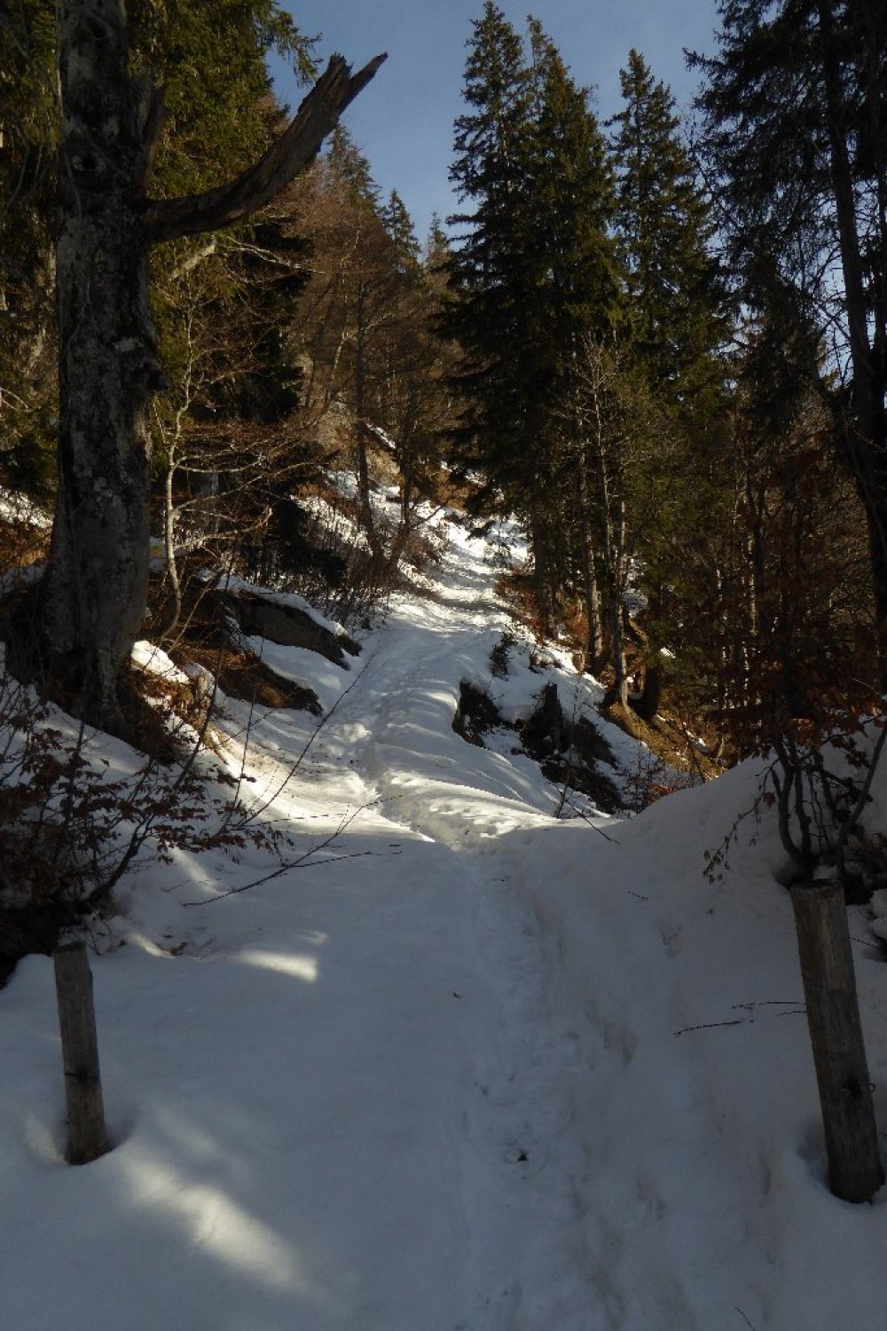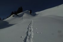 Von dort alles gespurt und tragend (Morgens). Habe bis oben keine Gamaschne benutzt. Erst im Abstieg wo ich neu eingespurt habe bis zum Durchschlag oberhalb der Unterkirche Alp. Der dortige Direktabstieg nach Winkelwiesen ist verlockend bis zum Wald eingespurt. Achtung: der Abstieg im Hochwald ist fast gänzlich Schneefrei. Nicht ausgeprägt und kaum markiert, hier sind Vorkenntnisse vorteilhaft.