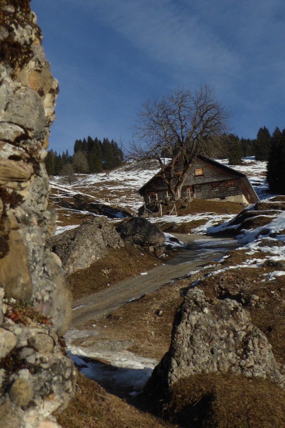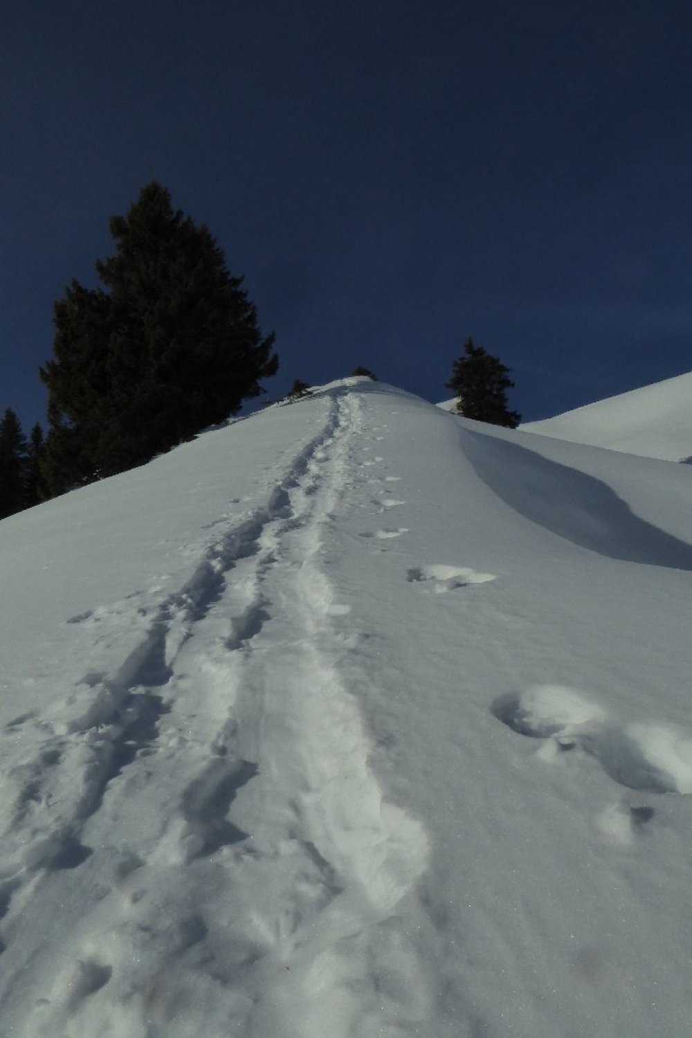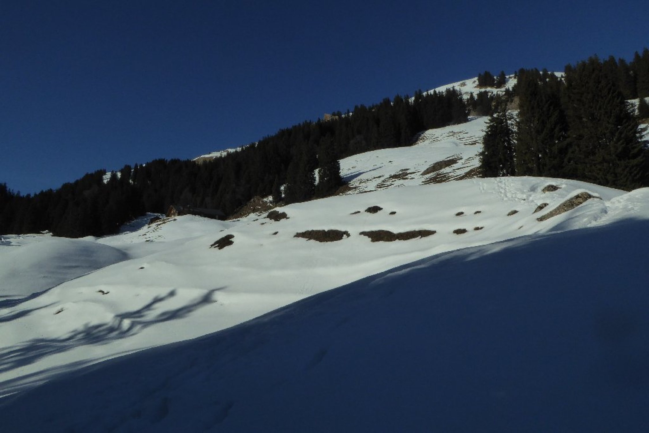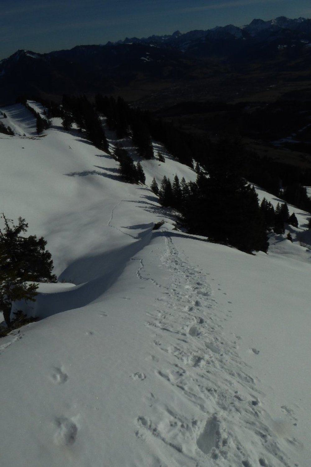 Von dort alles gespurt und tragend (Morgens). Habe bis oben keine Gamaschne benutzt. Erst im Abstieg wo ich neu eingespurt habe bis zum Durchschlag oberhalb der Unterkirche Alp. Der dortige Direktabstieg nach Winkelwiesen ist verlockend bis zum Wald eingespurt. Achtung: der Abstieg im Hochwald ist fast gänzlich Schneefrei. Nicht ausgeprägt und kaum markiert, hier sind Vorkenntnisse vorteilhaft.