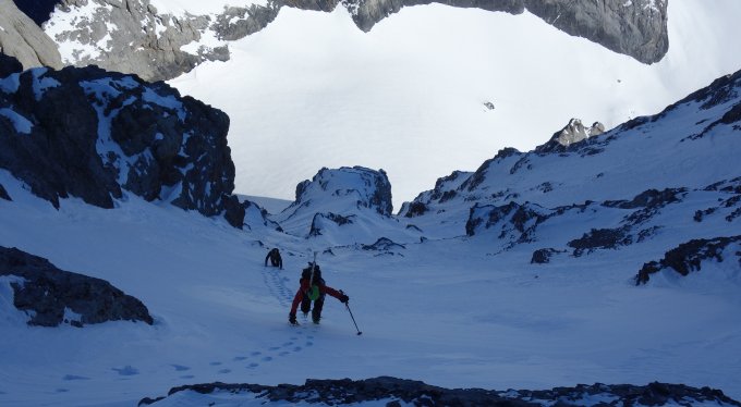 Die NE Wand mager aber mit gutem Schnee, die Randspalte ist komplett zu.