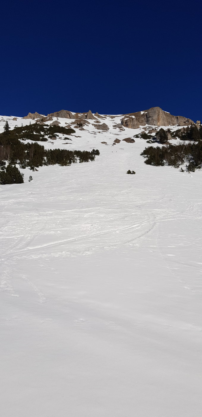 Im Aufstieg über Piste nix spektakuläres. Ab der Ifenmulde schöner gepresster Powder. Erste Spur angelegt hoch zum Durchschlupf. Ging ohne Steigeisen, kompakter Trittschnee. In der Rinne selbst kaum Schnee und viel Fels. Seil hängt drin, somit wenig Schwierigkeiten. Südseitige Abfahrt im weichen Firn tip top. Unten minimal sulzig aber gut zu fahren.