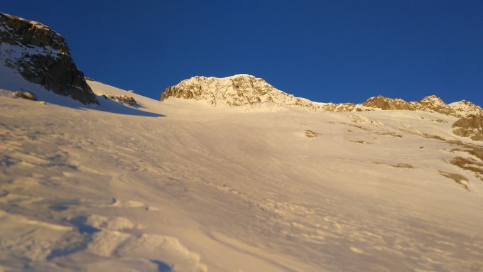 Super Verhältnisse zum Skihochtouren, zum Skifahren wohl eher nicht. Alles hart abgeblasen vom Wind. Bergschrund gut zu passieren, Wechtendurchschlupf beim direkten Einstieg zum Gipfel schwer passierbar, hab im Abstieg den Sommerweg genommen, welcher wohl auch für den Aufstieg momentan besser geeignet ist.