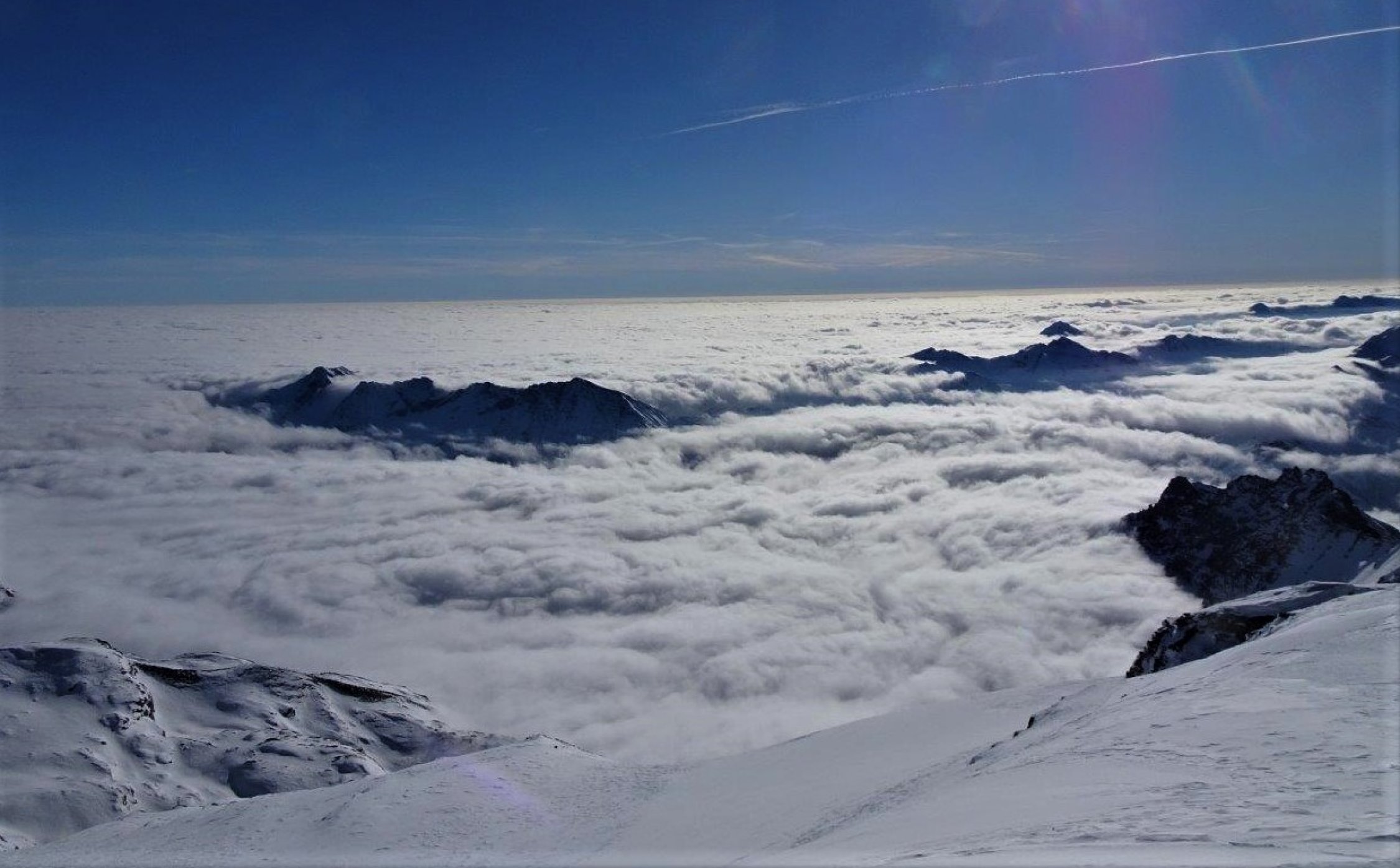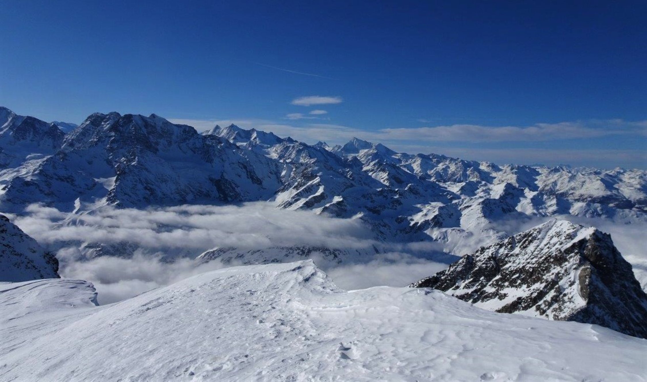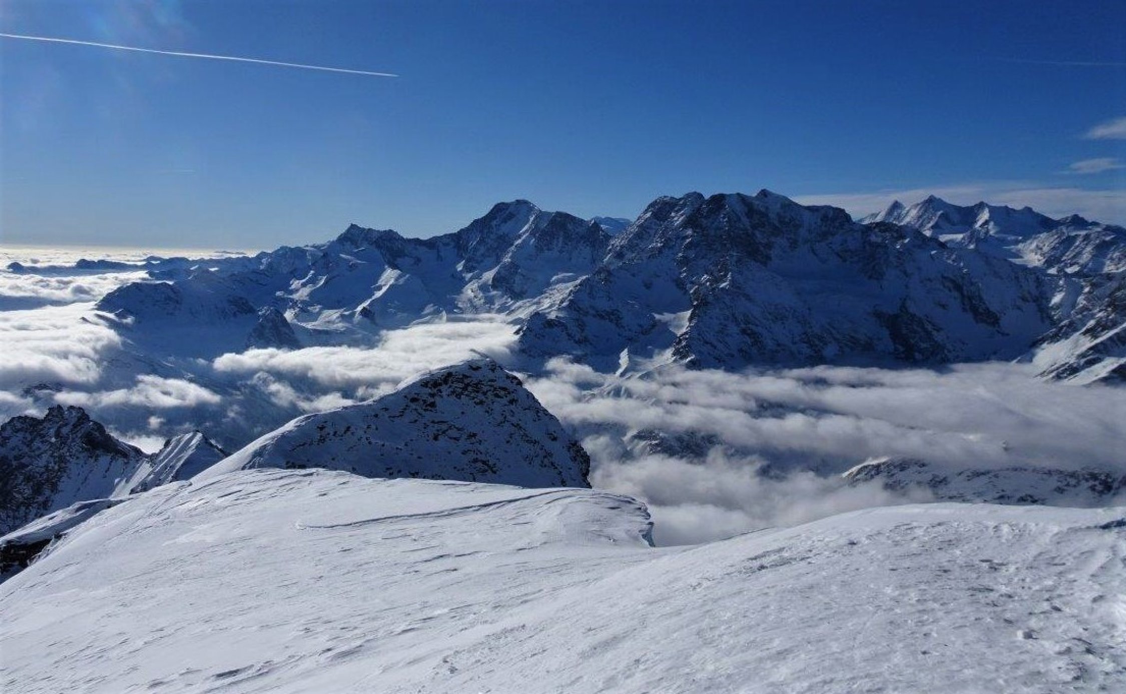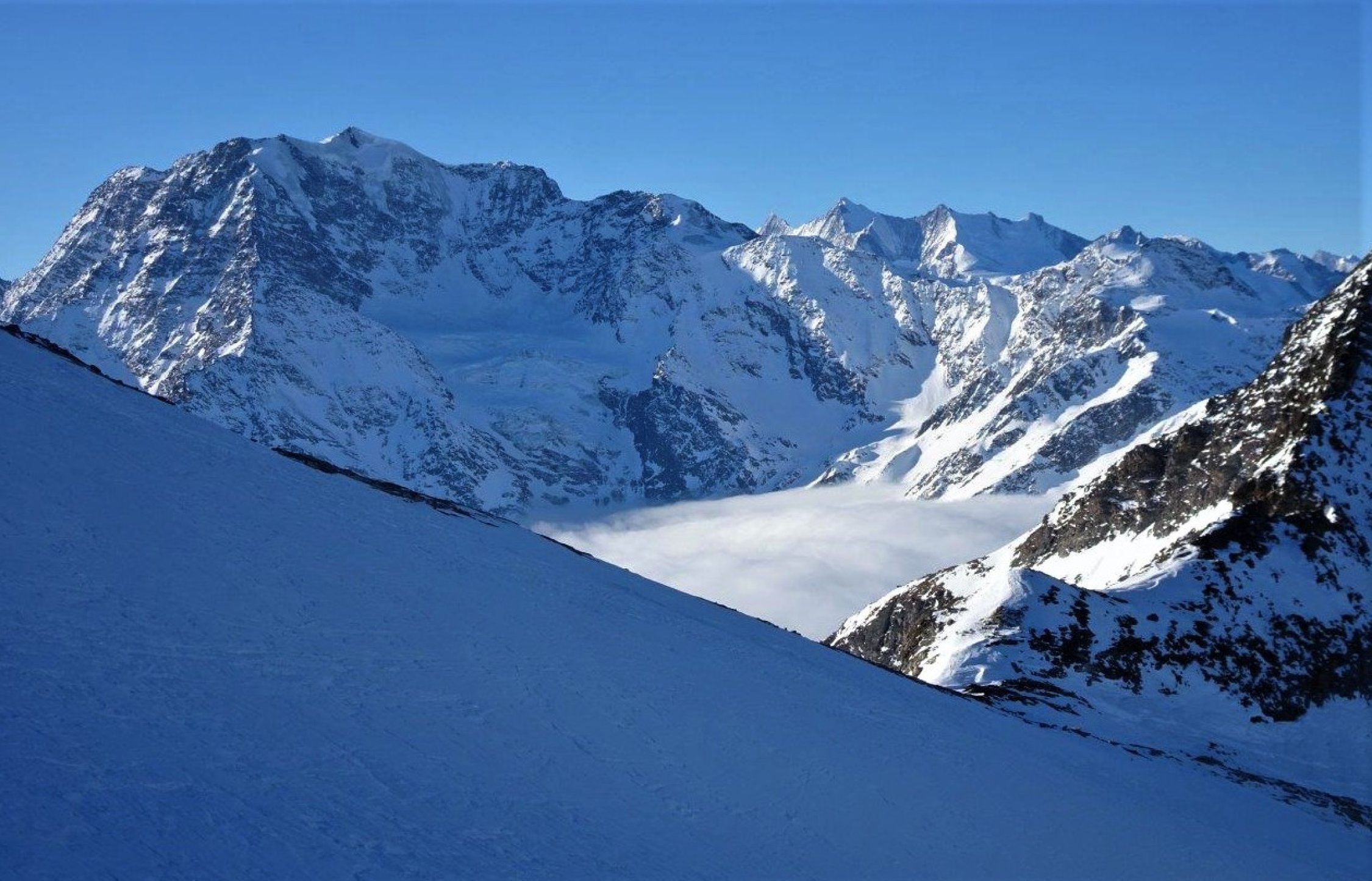 Ankunft um 8 Uhr bei -6°. Auf dem Pass sehr starker Wind aus SW mit harten Böen. Hinter dem Hübschhorn windgeschützt bis zum Pass und auf dem Gipfel eine Stunde Pause mit moderatem Wind. Bei der Rückkehr auf dem Pass immer noch starker Wind bei -3°.