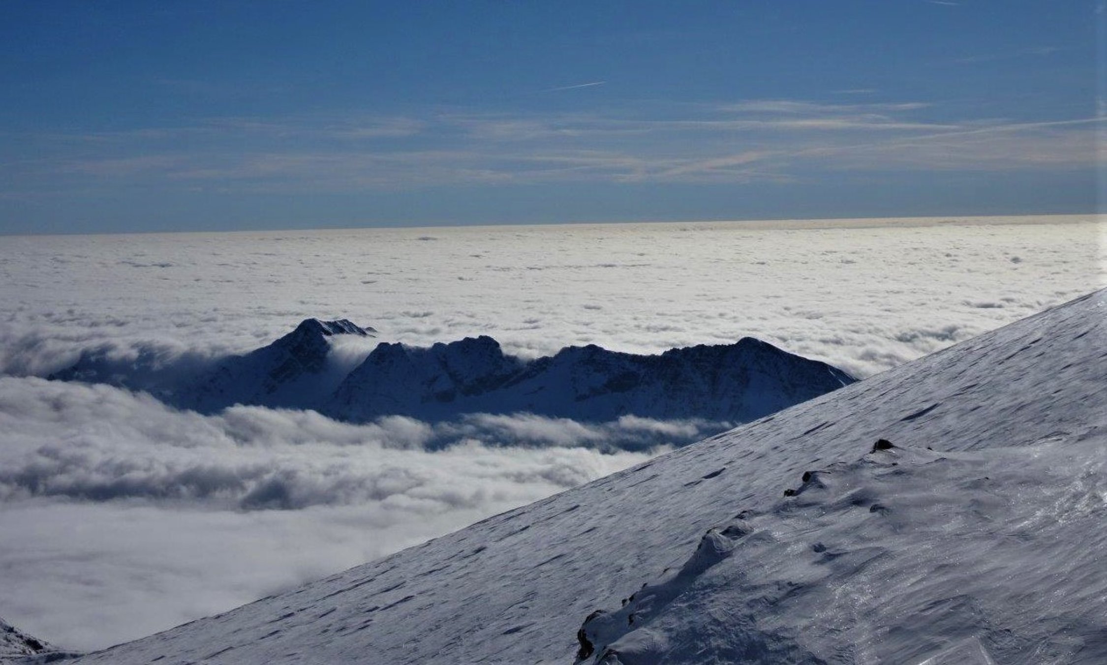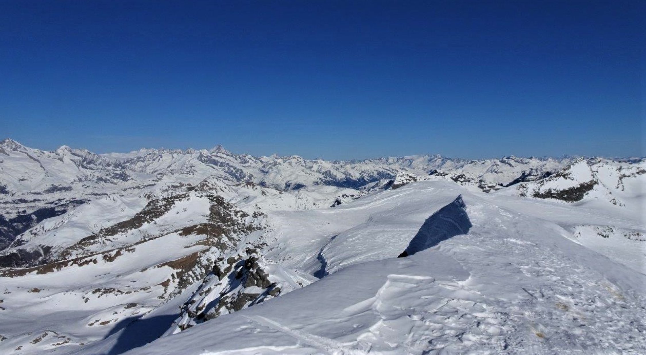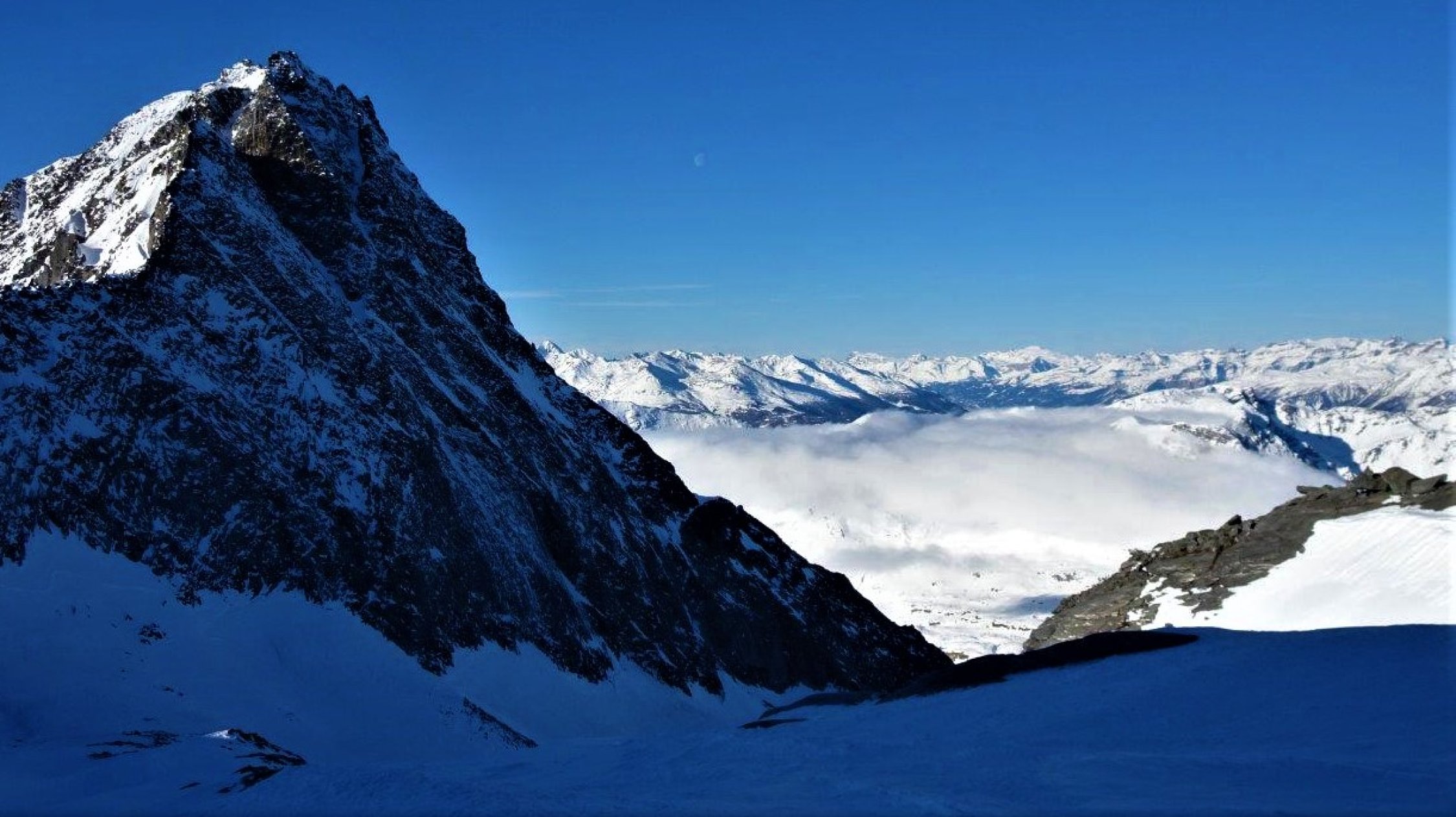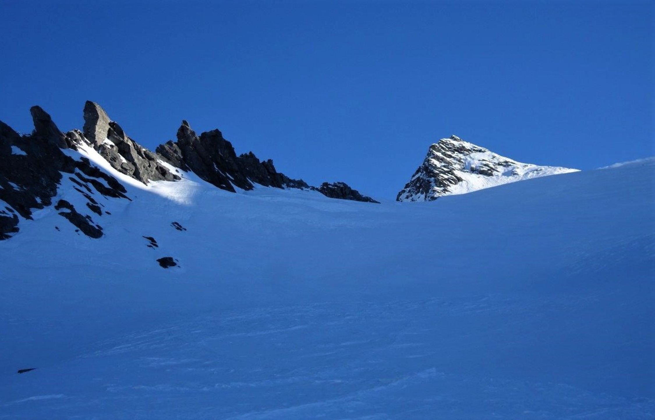 Piste gut - hart, tragend und überraschend flott zum abfahren. Habe ich so nicht erwartet. In der vergangenen Schönwetterperiode ohne Schneefall sind ziemlich viele Türeler zum Gipfel hochgestiegen. Harsteisen waren angenehm zum hochsteigen. Die Querung unter dem Hübschhorn hart aber gut passierbar.