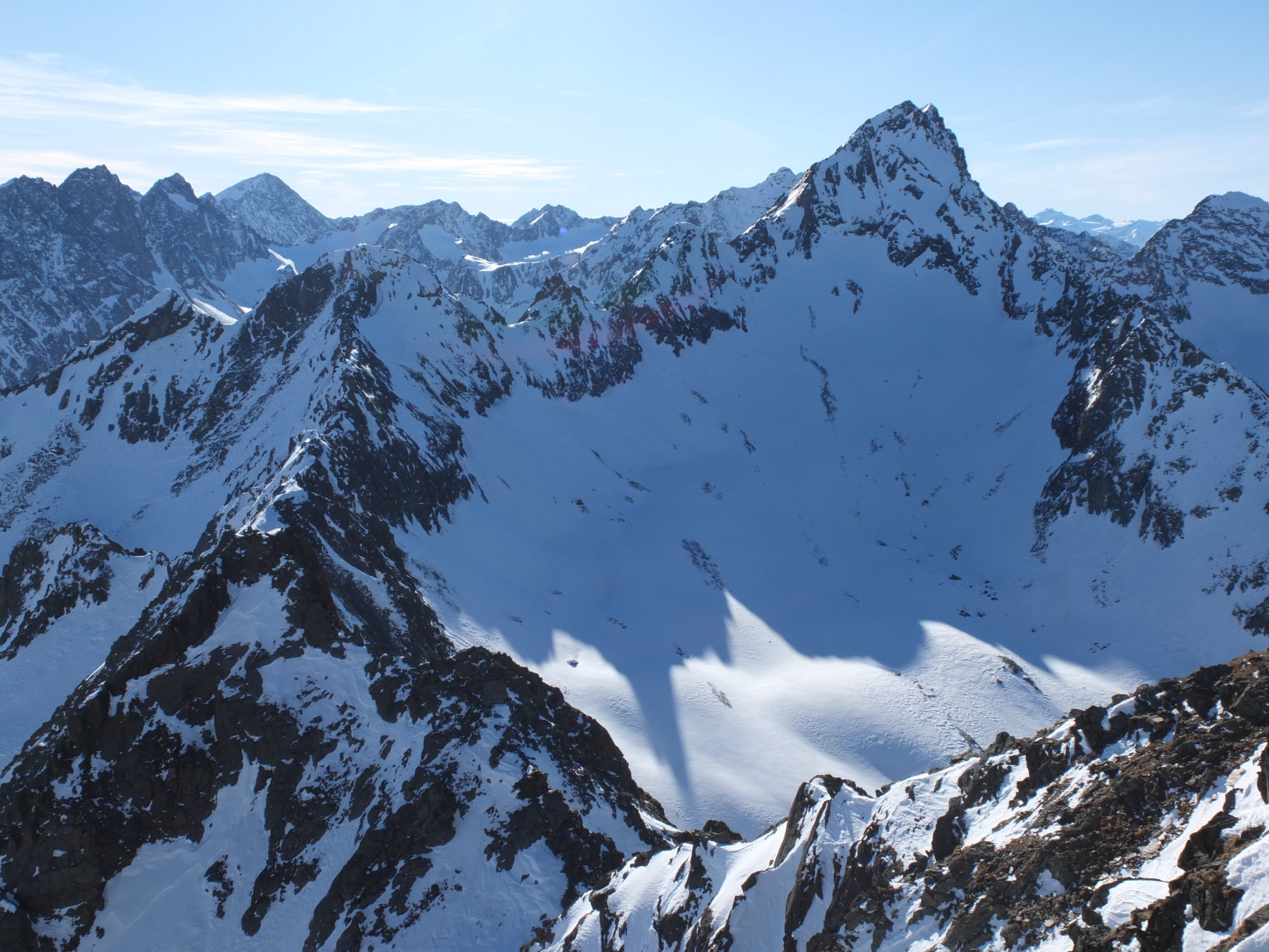 die Berge in dieser Region sind gut eingeschneit, Pulverhänge gibt's nach dem letzten Wochenende kaum noch, Anstieg und Abfahrt führen grösstenteils über Pisten, aber trotzdem schön zu gehen. Der Fussaufstieg auf den Zischgeles ist gut zu machen, mit Steigeisen aber entspannter.