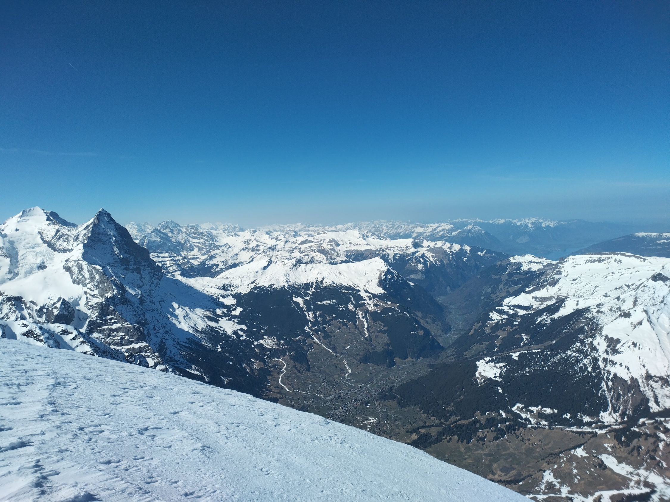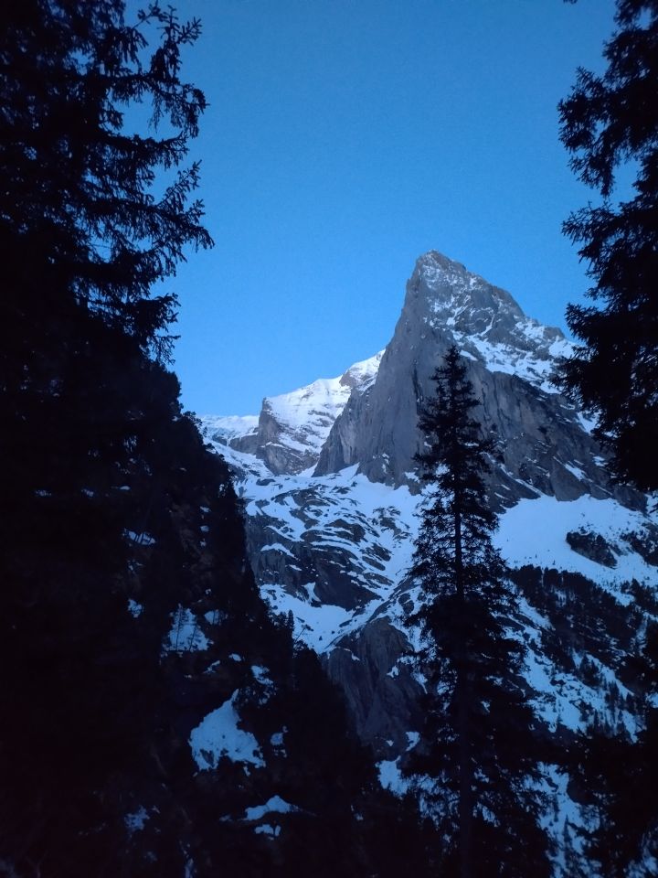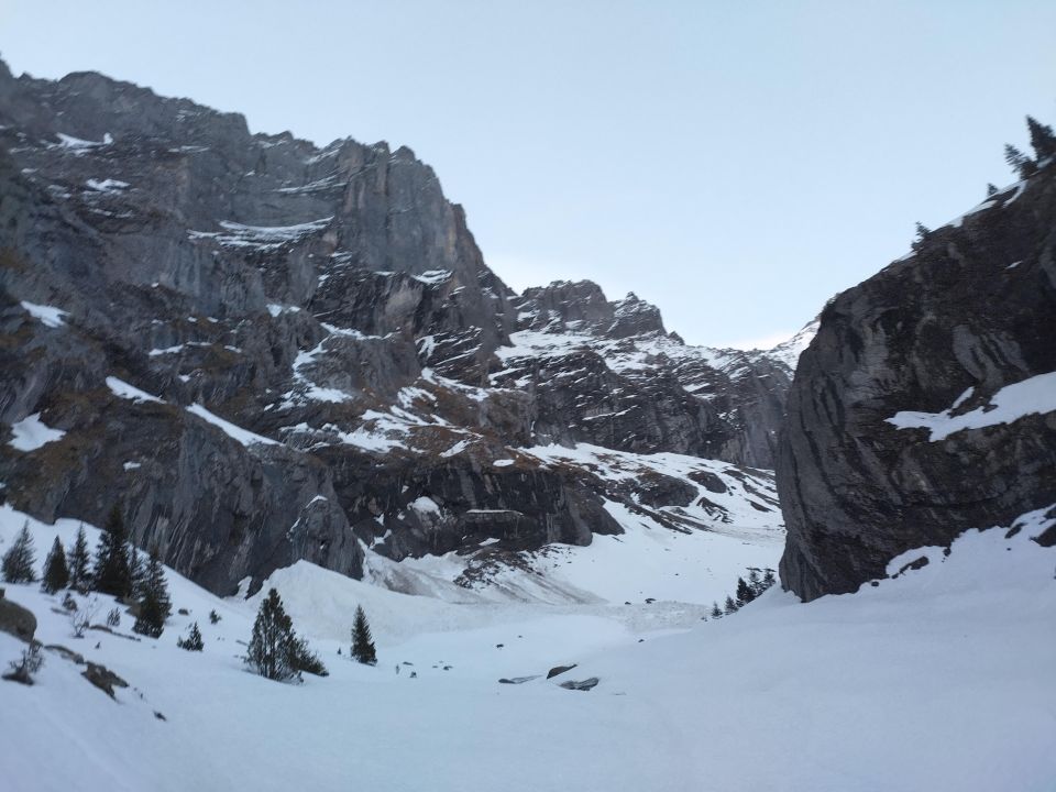 Auf den unteren Platten hat es diverse kleinere frische Nassscheerutsche, und auch einen grösseren Abgang in einem Lawinenzug an der Nord-Ostseite vom Klein Wellhorn der wohl einige Tage alt war. Abfahrt bis zur Brücke ca 1460m möglich.