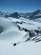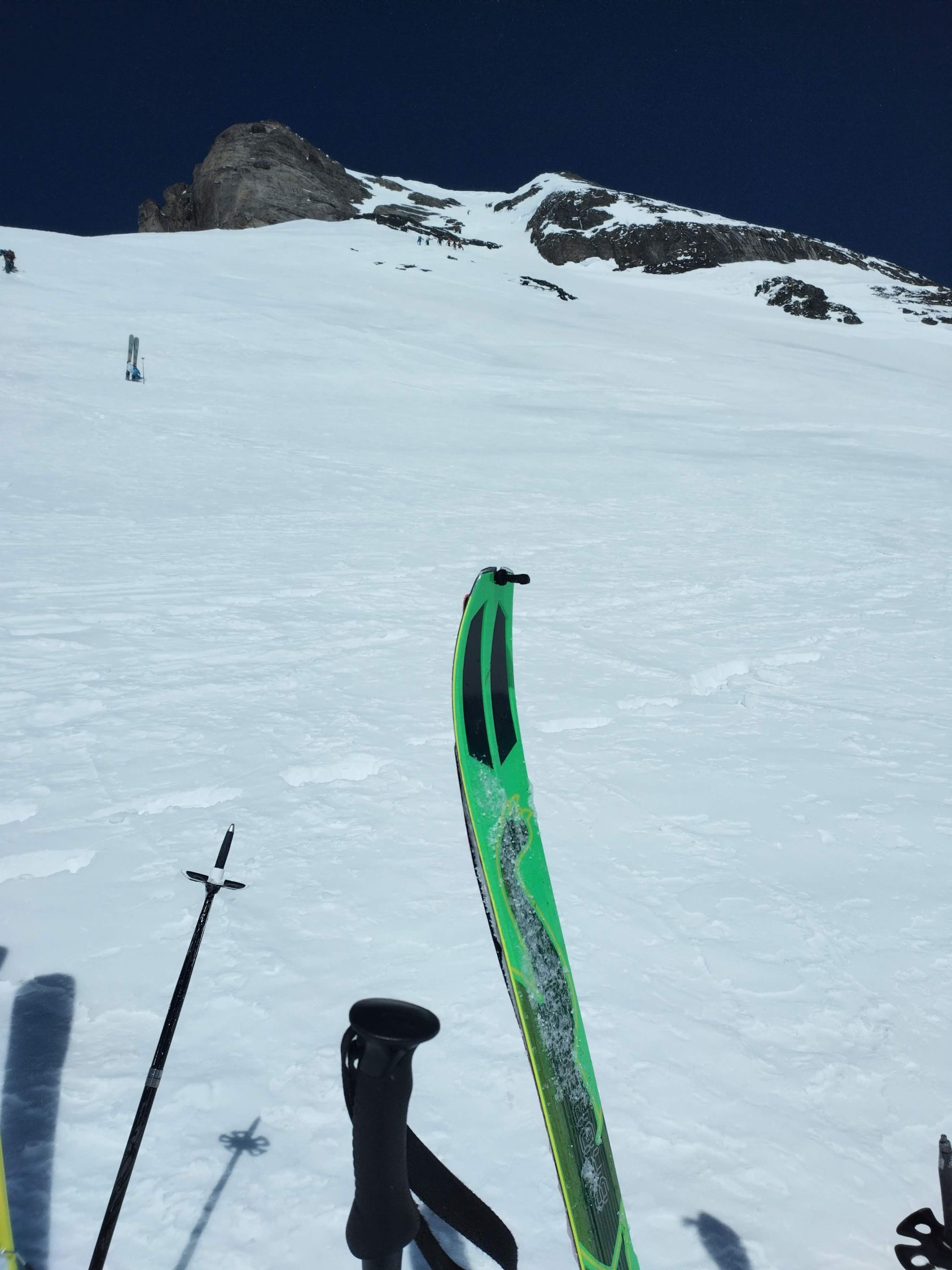 Der Schnee schmilzt im unteren Teil rasch, im Aufstieg inzwischen wohl besser zu Fuss bis ca 1680m, bis zum Tal bei Hinderem Gletscherhubel. Aufstieg ab Moräne bis kurz vor dem Gletscher mit Harscheisen, durch das couloir zum Rosenlauibiwak den letzten Teil zu Fuss den guten Trittspuren folgend.
