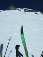 Dann in der Sonne ohne Harscheisen bis zum Skidepot am Wettersattel, Gipfelcouloir für mich zu fuss.