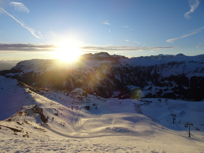 Schnee: windbearbeiteter Presspulver welcher aber gar nicht so schlecht zum fahren war, dazu auch einige harte, griffige Stellen, an sehr sonniger Lage(Südhang am Spitzmeilen) bereits aufgesulzt