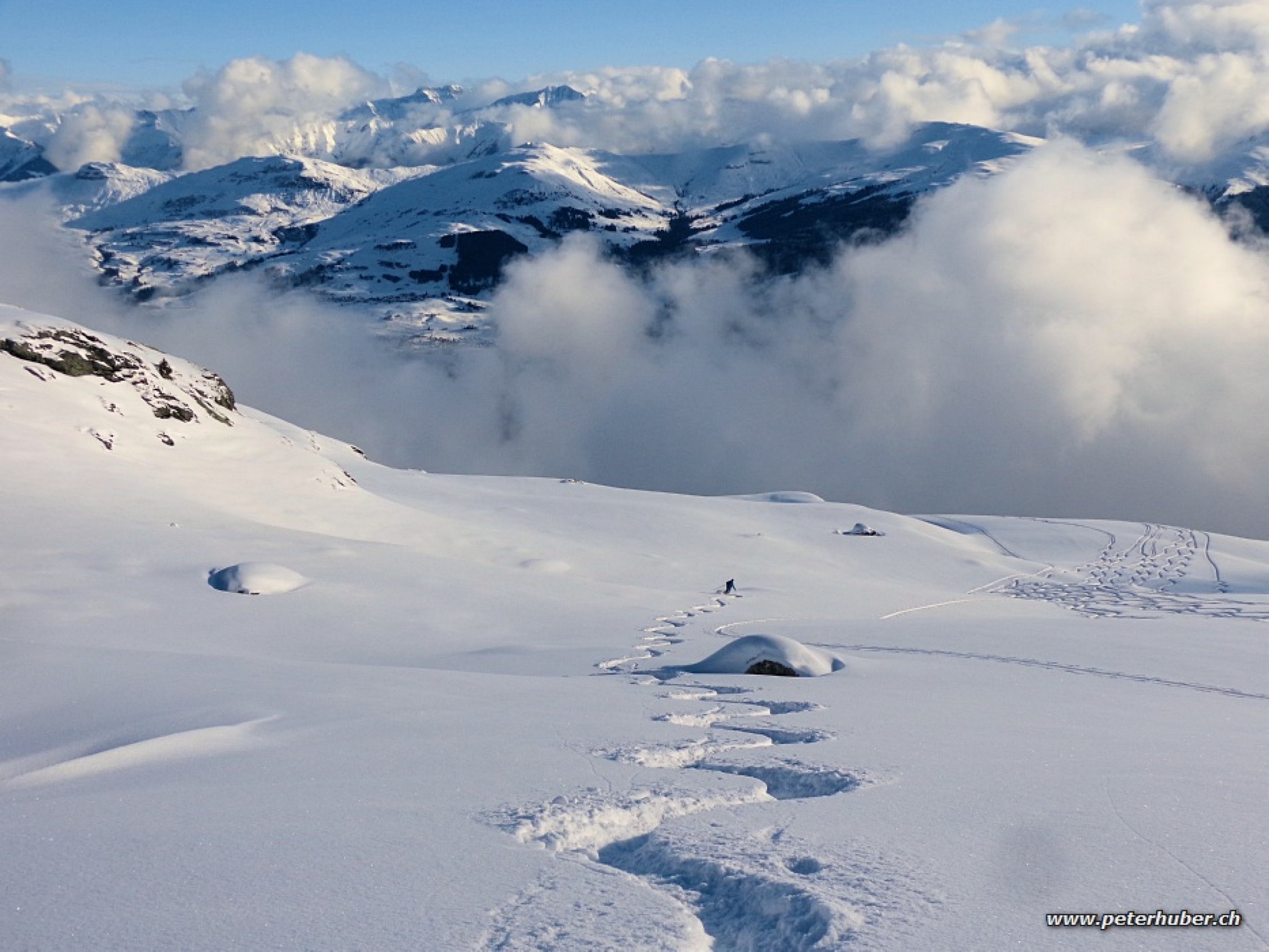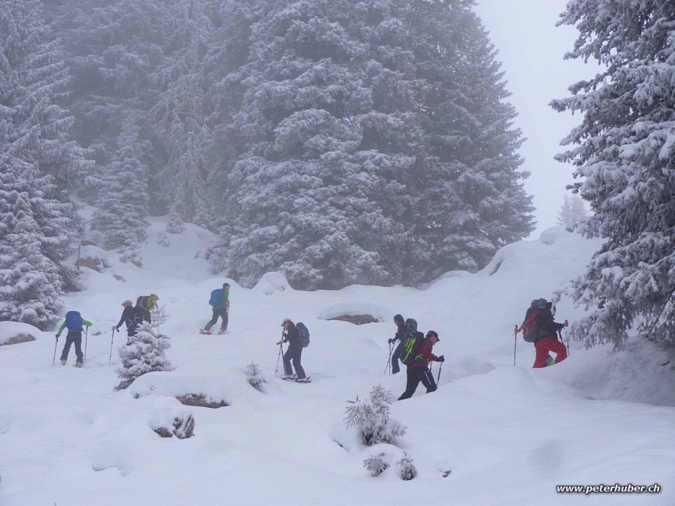 Abfahrt: Oben traumhafter Pulver bis ca. 1900 m. Im Wald selten Steinkontakt. Ganz unten sind wir auf der Waldstrasse (gut präpariert) abgefahren. Genung Schnee bis ins Dorf.
