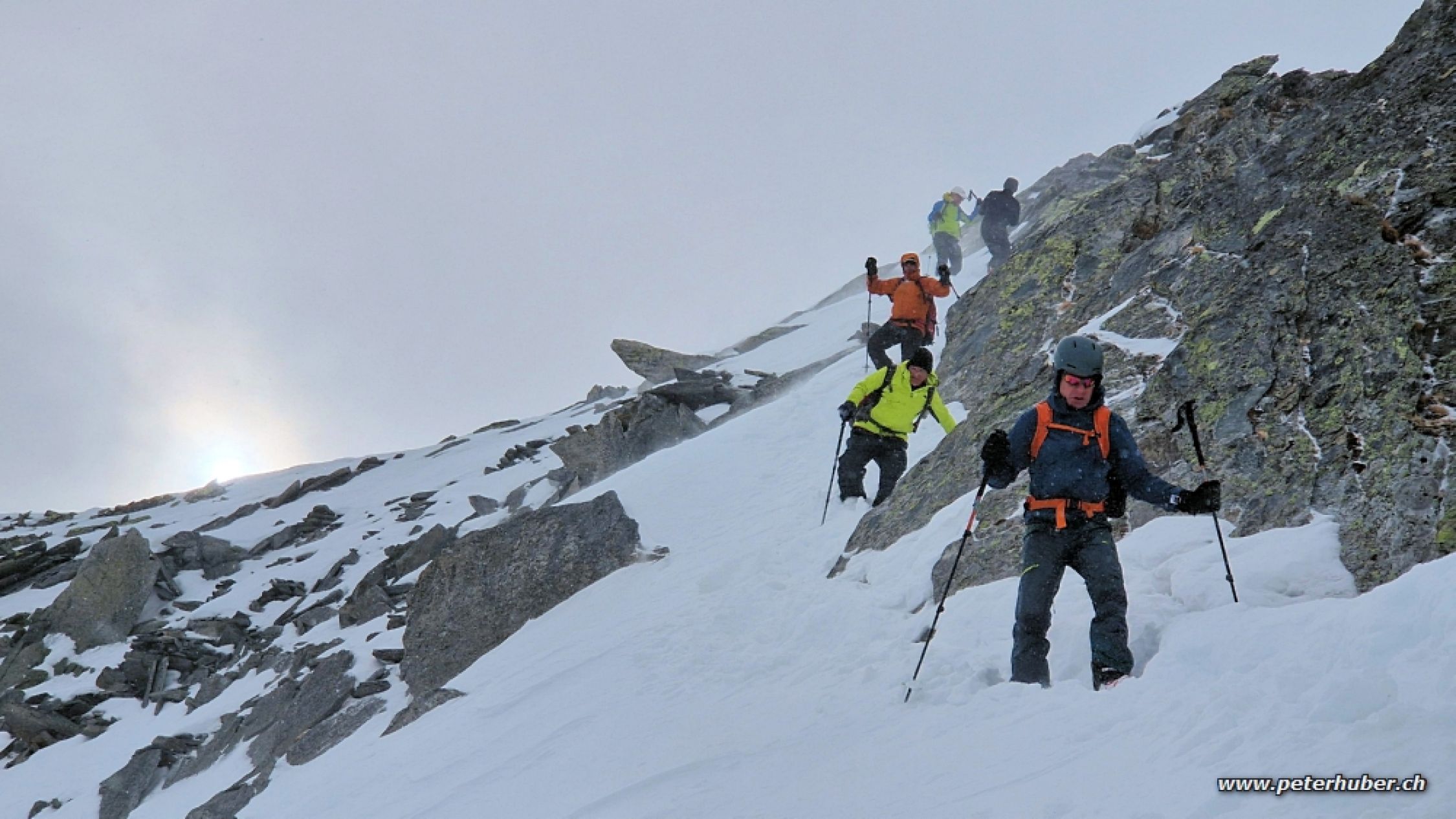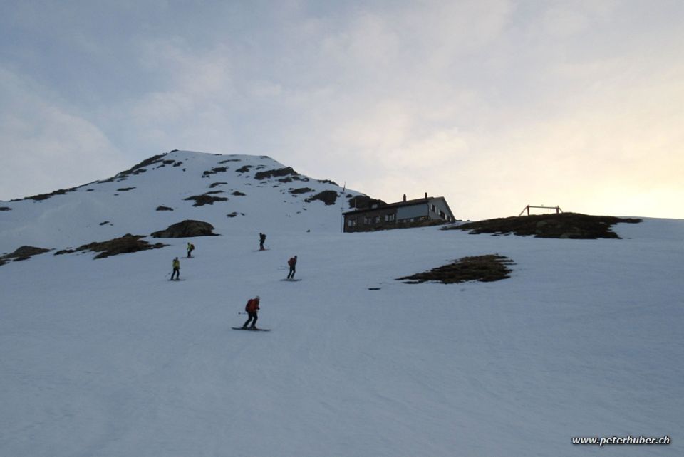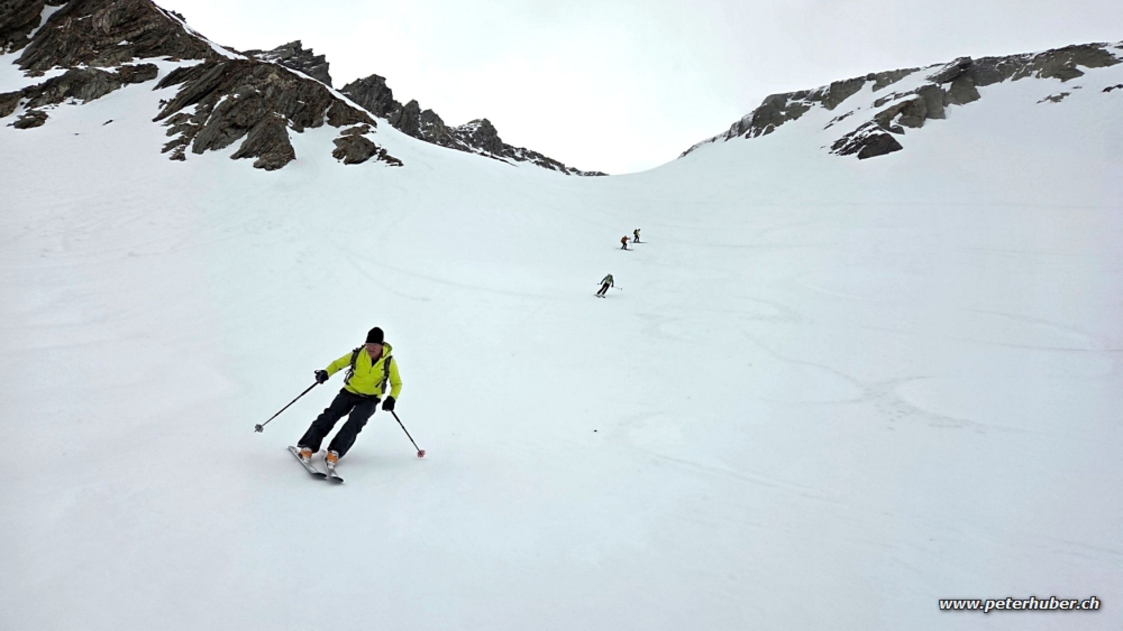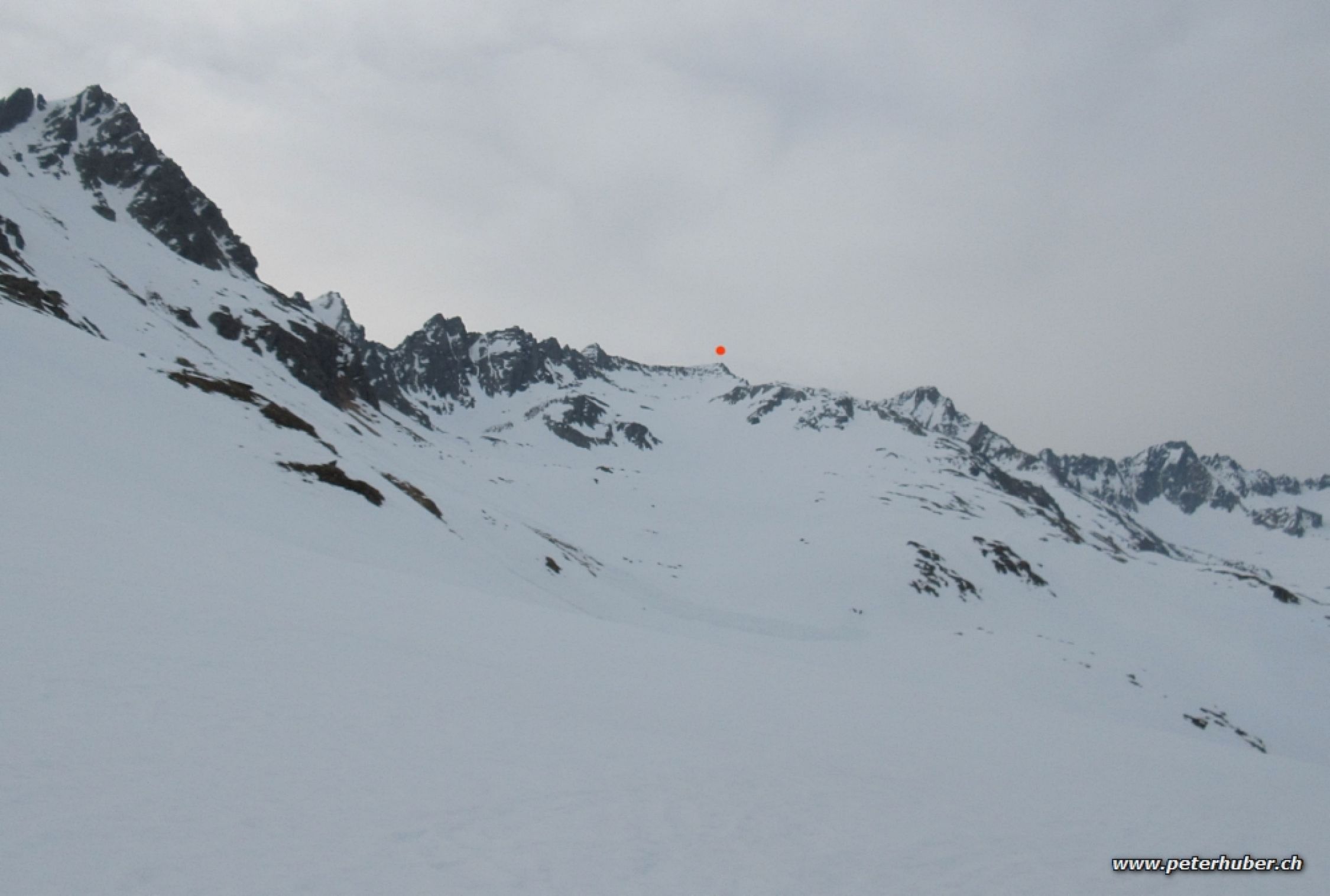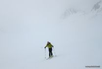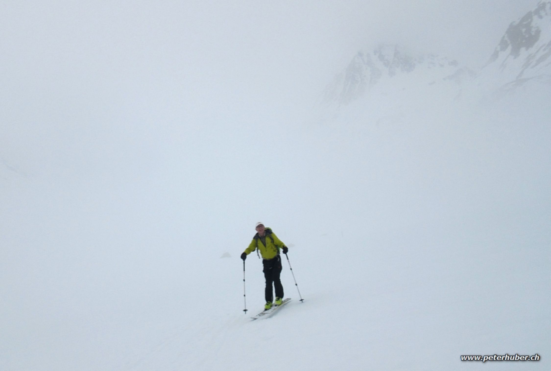 Abfahrt: Mit schlechtem Licht auf hart gefrorenem Schnee runter. Die wenigen alten Spuren gaben etwas Kontrast. Ab 2400 m tauchten wir in den Nebel ein, der sich ins Tal geschlichen hatte. Mit GPS Unterstützung zur Maighelshütte zurück. Den kurzen Aufstieg zum P 2263 machten wir ohne Felle - schieben und hochsteigen.