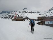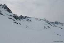 Start um 7 Uhr bei leicht bedecktem Himmel. Von Süden drücken Nebelbänke über den Bornengopass. Es hat noch viel Schnee in der Gegend. Morgens war der Schnee hart gefroren. Aufstieg über die weiten Hänge zum Tgiern hinauf. Die obere Hälfte absolvierten wir mit Harscheisen. Skidepot und mit gutem Trittschnee zum Gipfel. Dort zog es heftig und Schnee wehte herum.