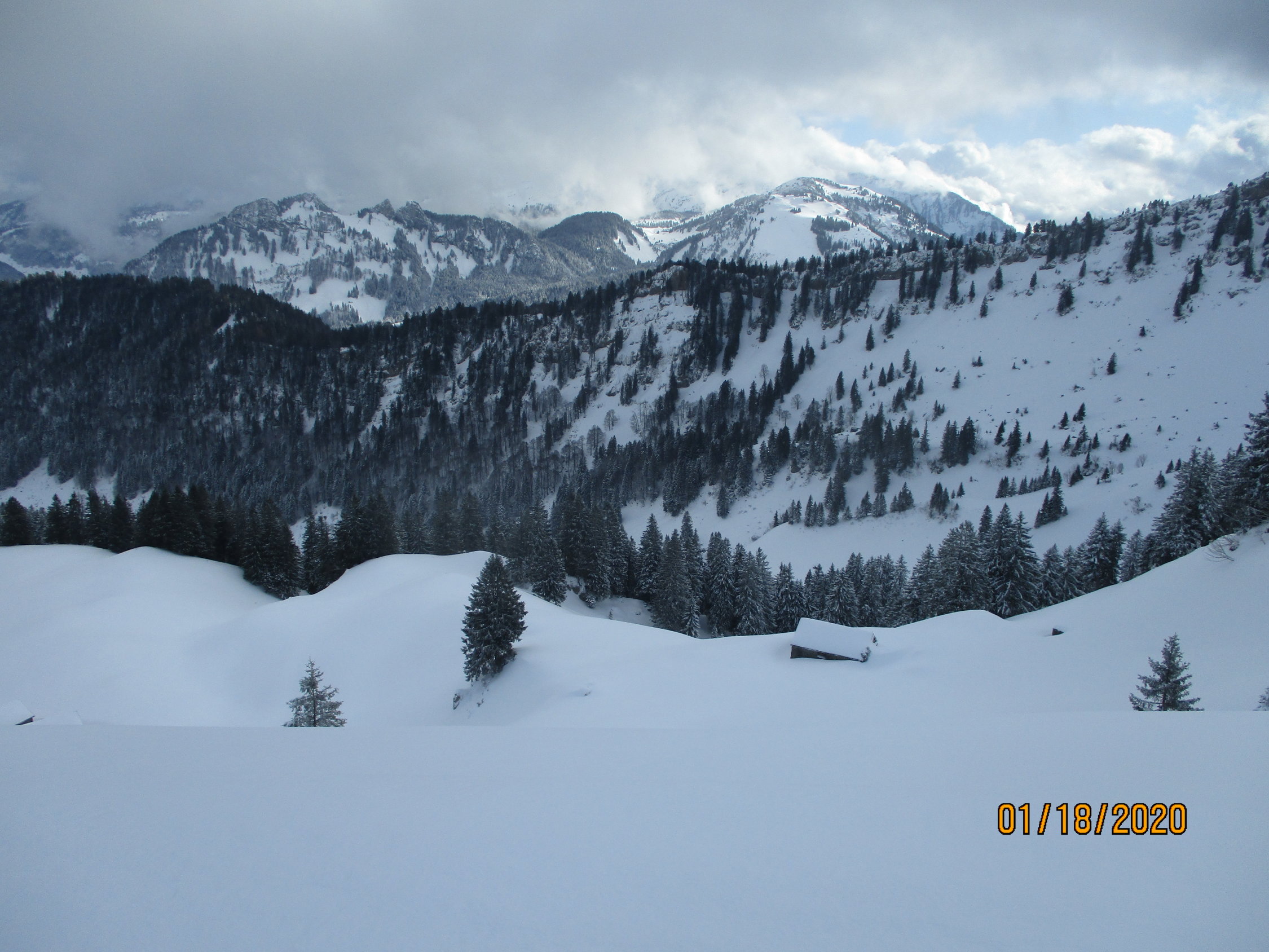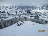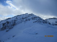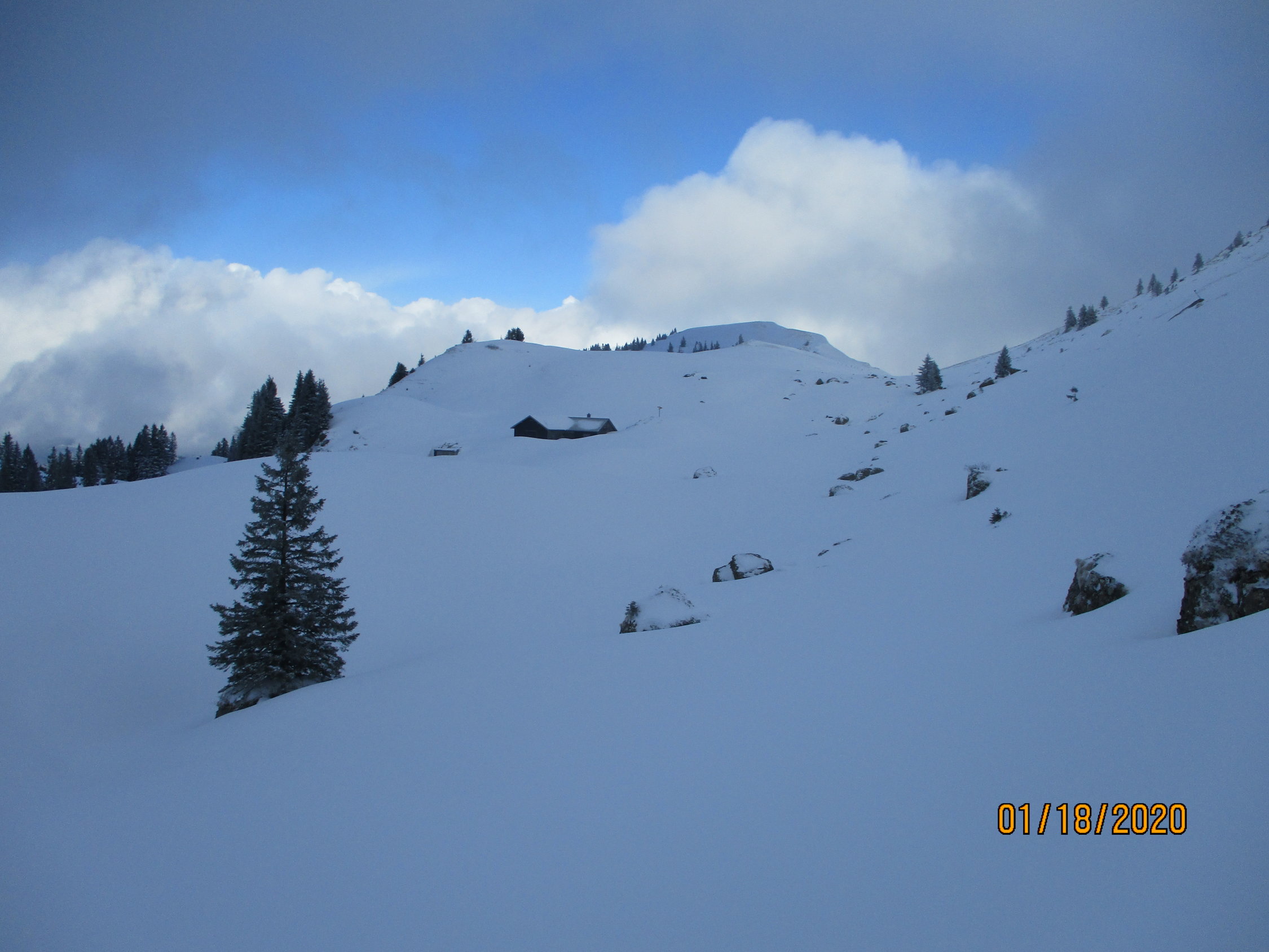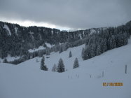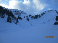 Im Schneematsch begonnen und in gut 40 cm tiefem Pulver geendet. Ab etwa 1200 m waren üppige Neuschneemengen vorhanden, die weiter oben teils auf gefrorener Unterlage zu liegen kamen. Insbesondere im Hang zwischen dem Sattel und Hengst hatten sich auch schon recht große Triebschneepakete gebildet. Dort lagen auch die Spuren eines beträchtlichen Lockerschneerutsches. Insofern schien mir die Lawinensituation vor Ort doch prekärer, als im Boulletin vorhergesagt (Stufe 2 von SW über N bis SO ab etwa 2000 m). Die Gefahrenstellen lagen bis zu 500 m tiefer und ließen eher Gefahrenstufe 3 vermuten.