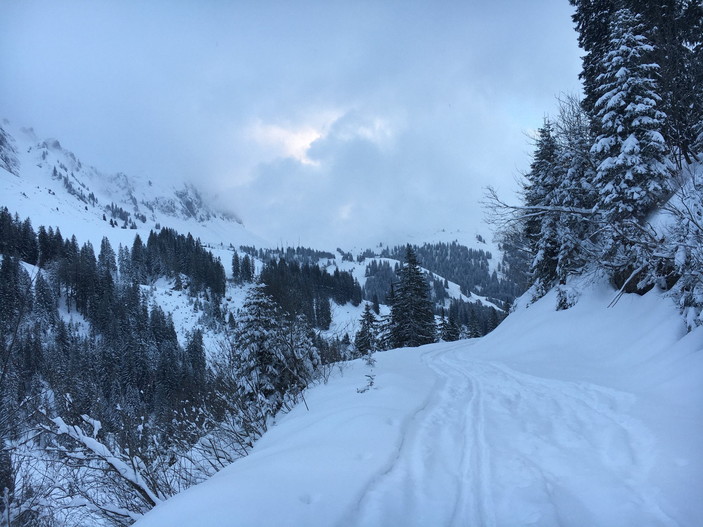 Um 07.30 bei Vorderrichisau losgelaufen entlang der verschneiten Passstrasse und dann via Butzen, Ochsenstrich zum Gipfel. Vor mir war noch keiner unterwegs an diesem Tag. Ca. 20-30cm Neuschnee, Spuren vom Vortag waren noch recht gut sichtbar, Neuschnee der letzten 24h wohl nur einige Zentimeter.