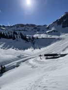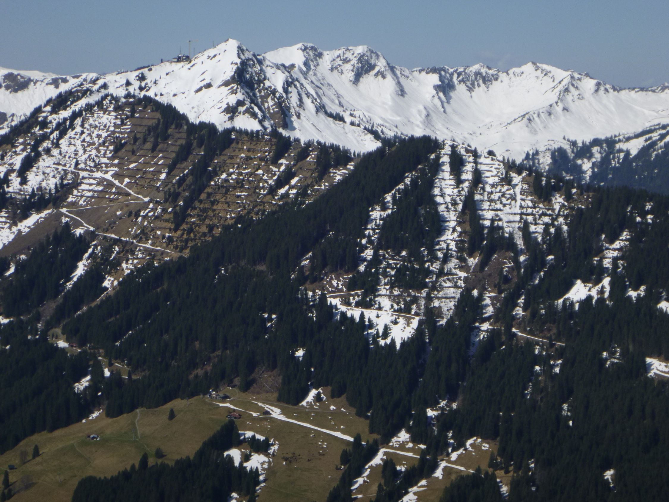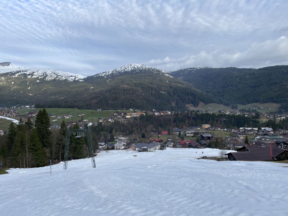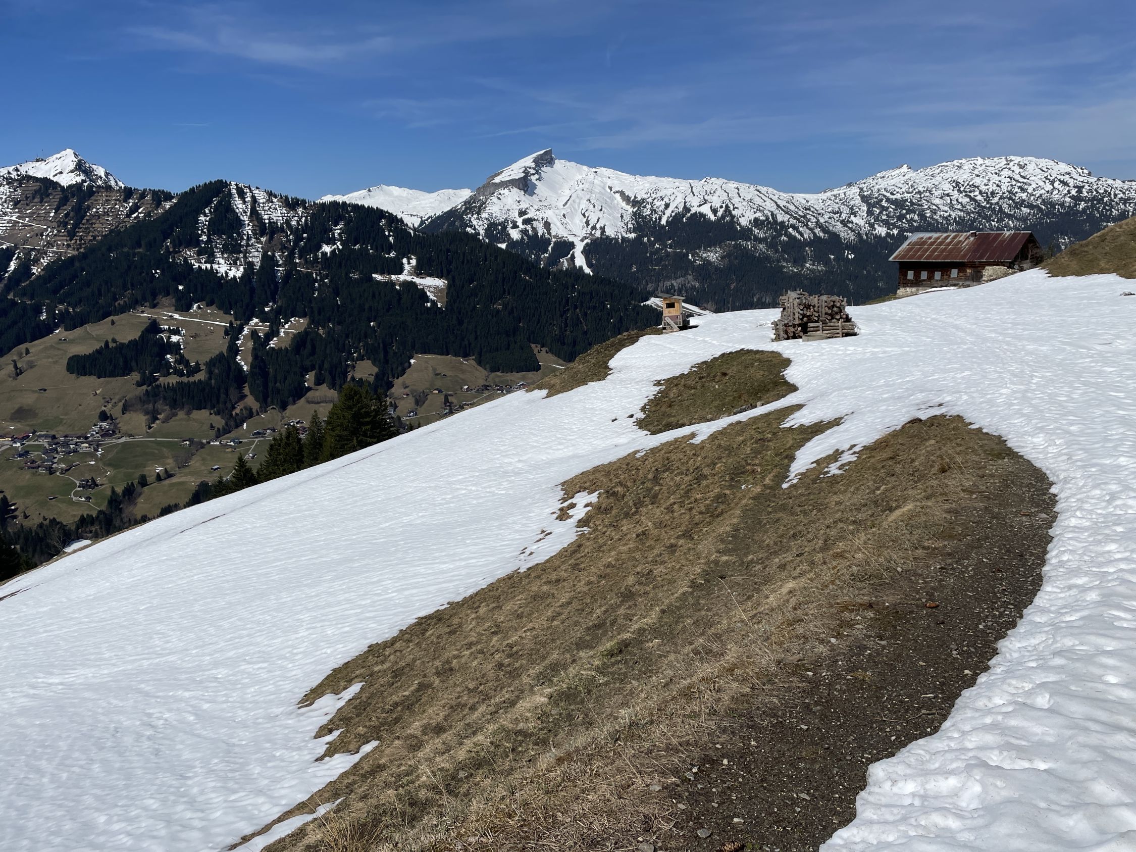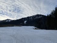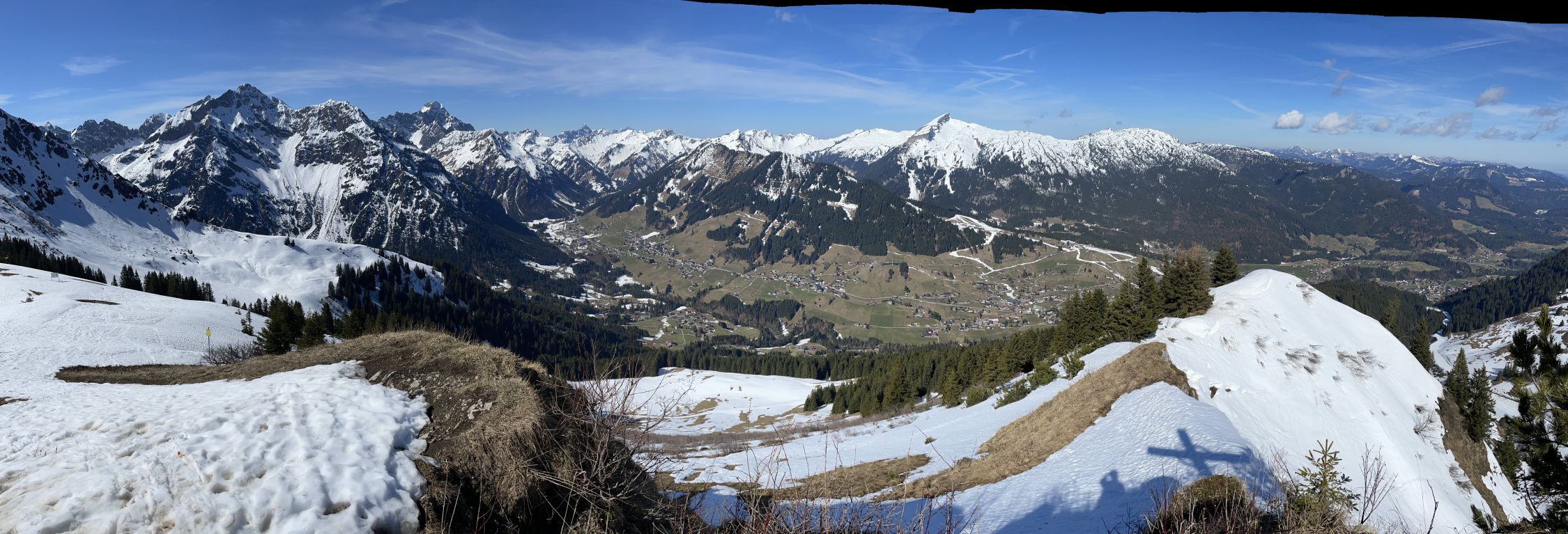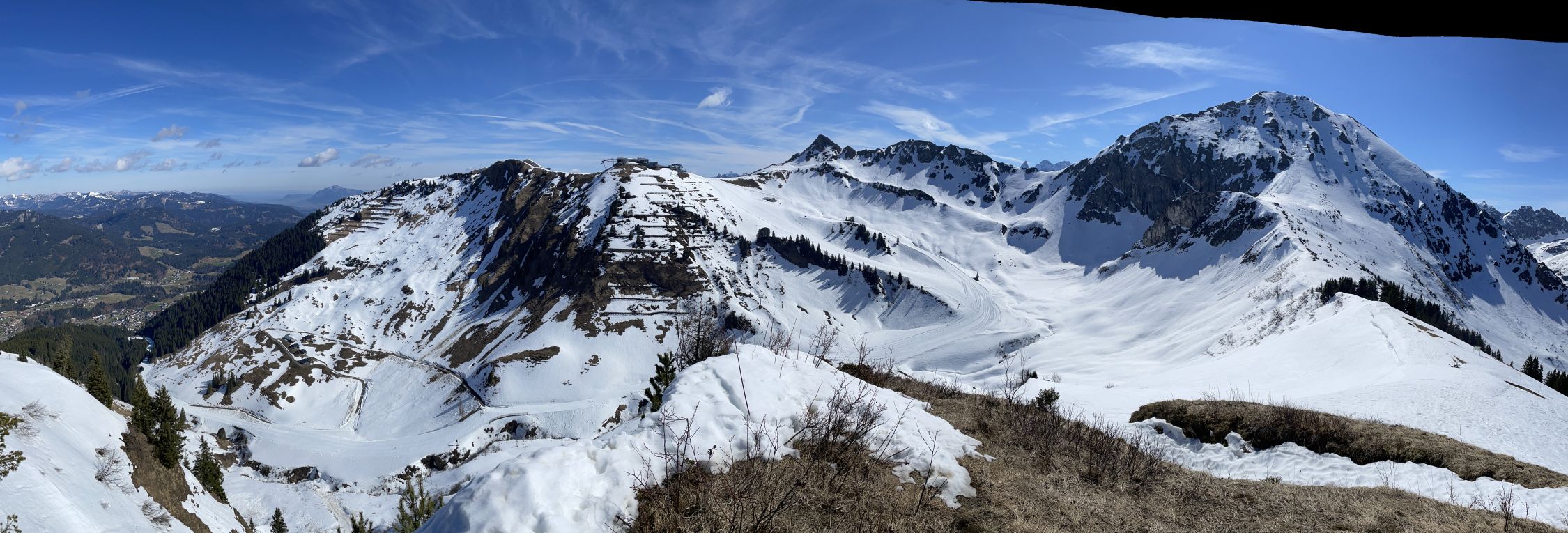Vom Gipfel hat man Aussicht auf die Kleinwalsertaler Berge. Ich wählte die Richtung der Rundtour im Uhrzeigersinn, da die Route über die Brandalpe und Kuhgehrenalpe im unteren Bereich erkennbar bereits schneefrei war und ich dann die Laufgeräte am Rucksack im Abstieg tragen konnte. Die Route über Piste 15 wird wohl noch einige Tage lang über den Kunst-Schnee funktionieren. In Höfle gibt es keine öffentlichen Parkplätze.