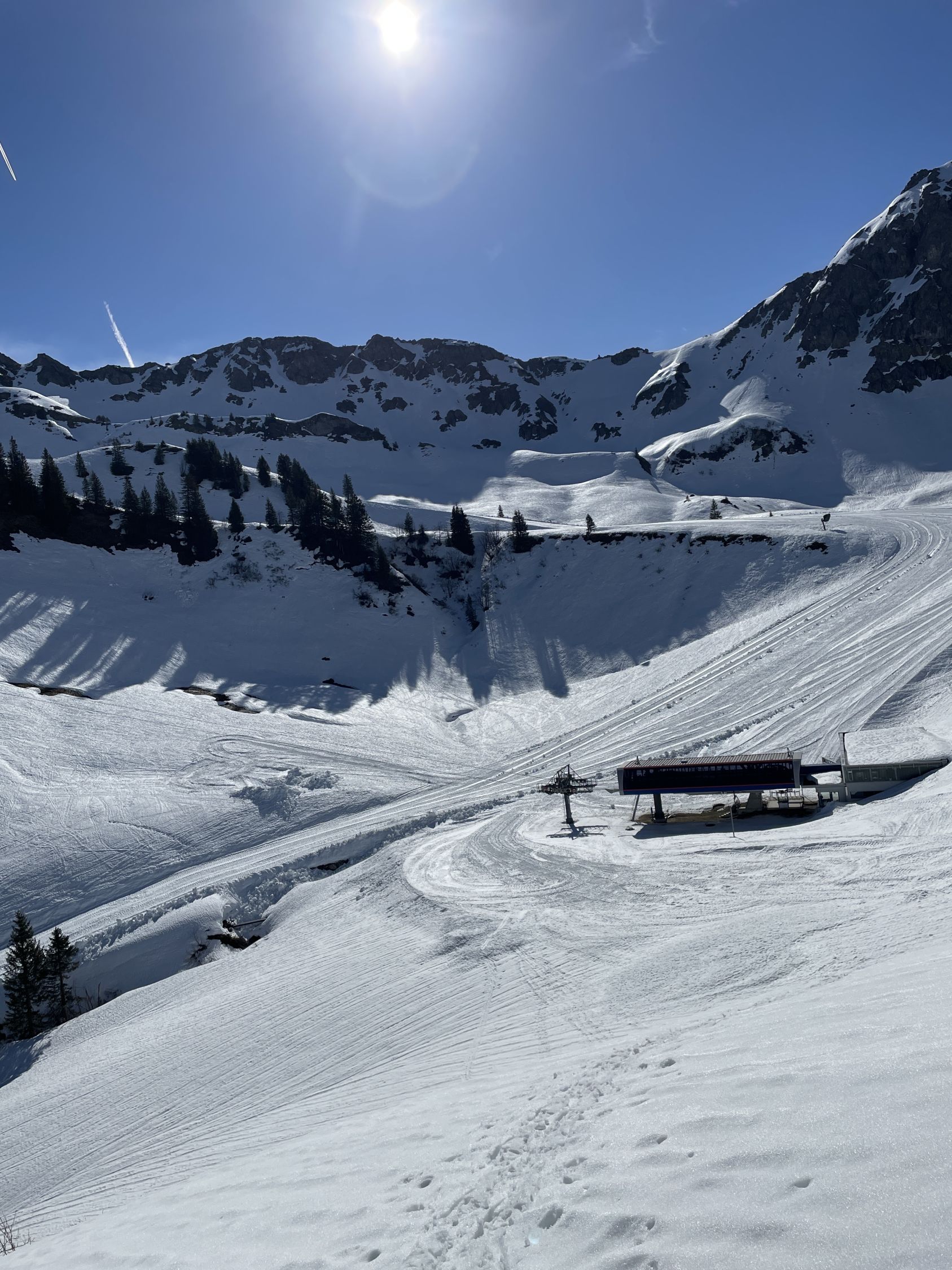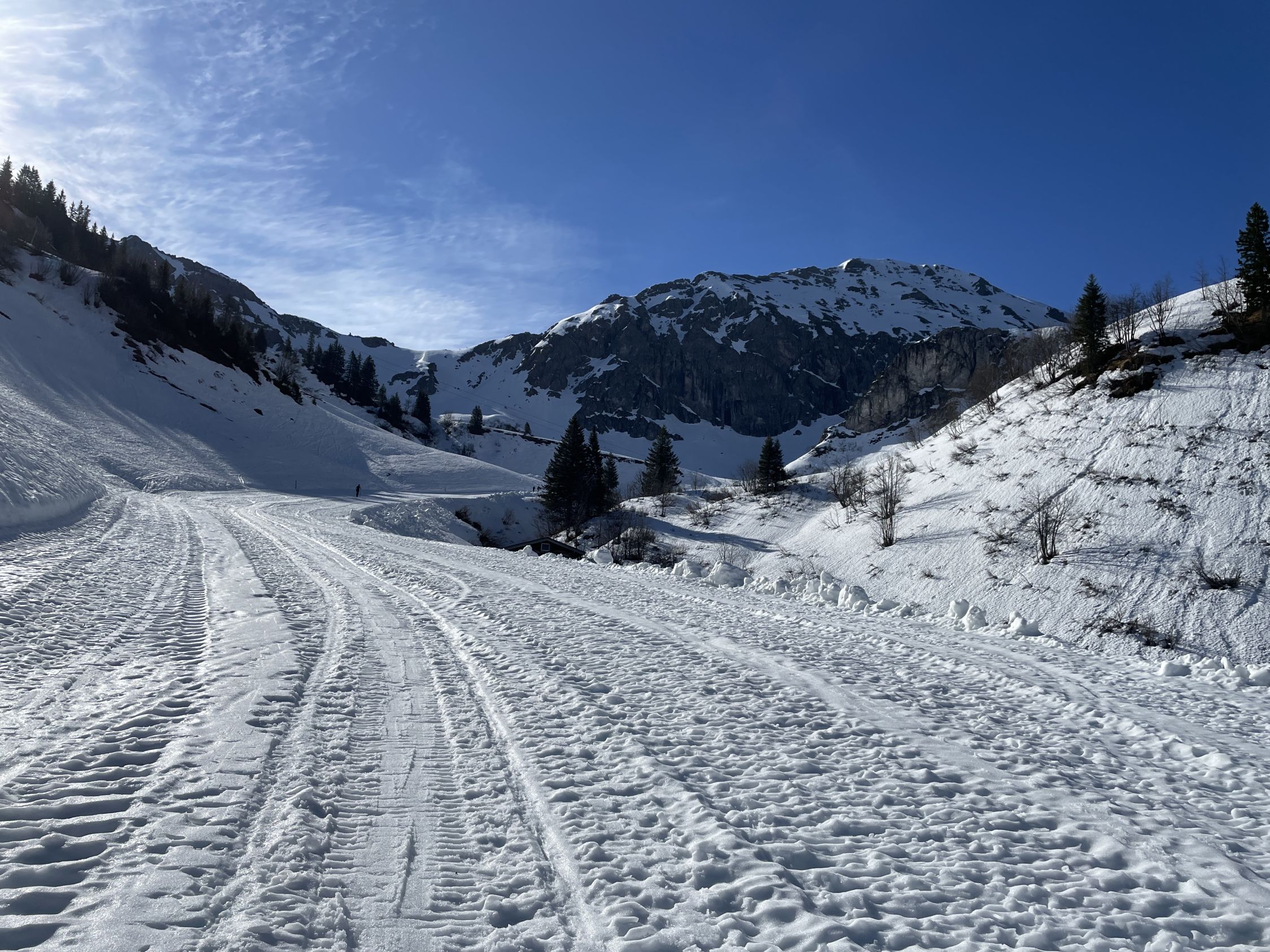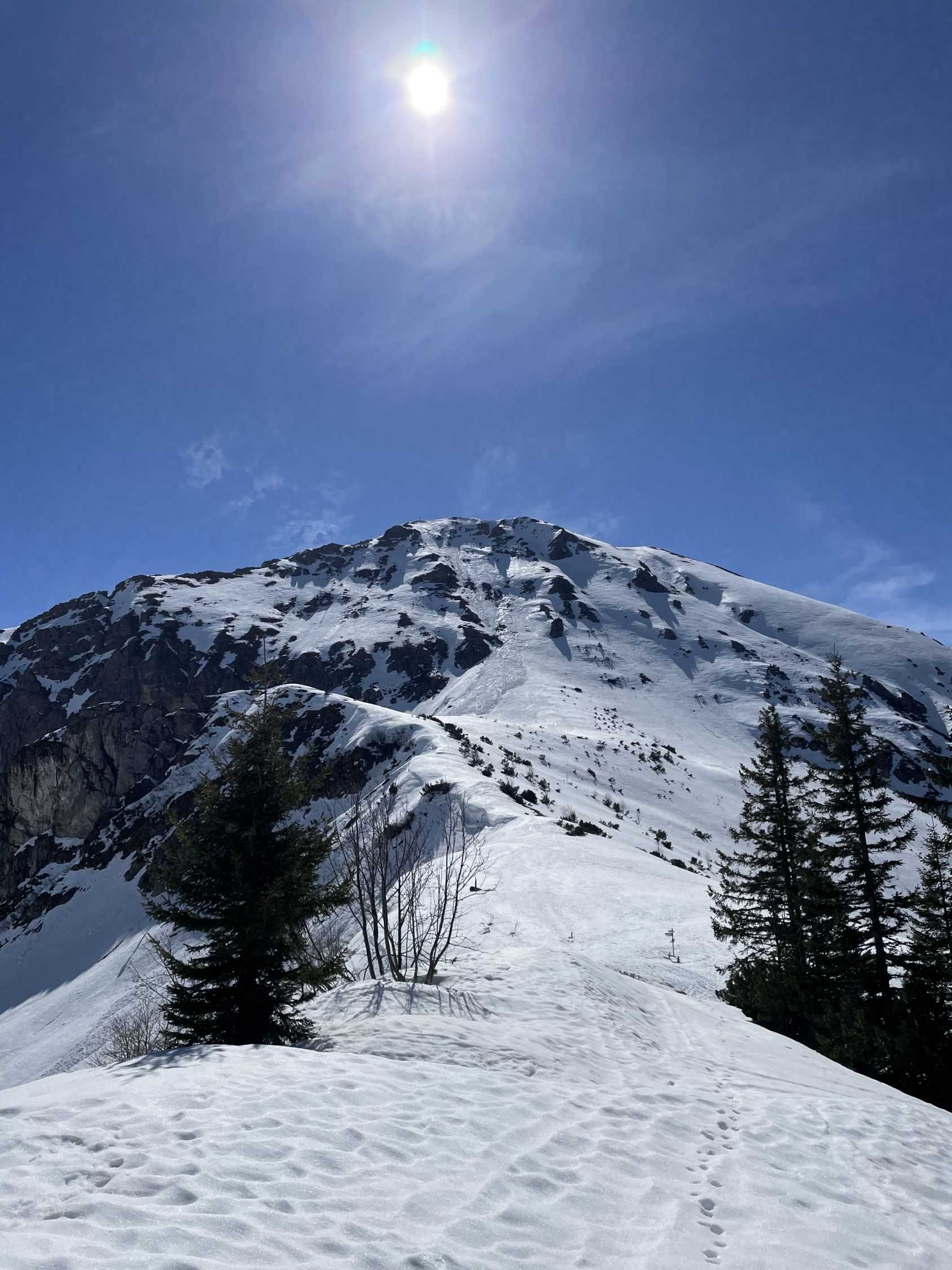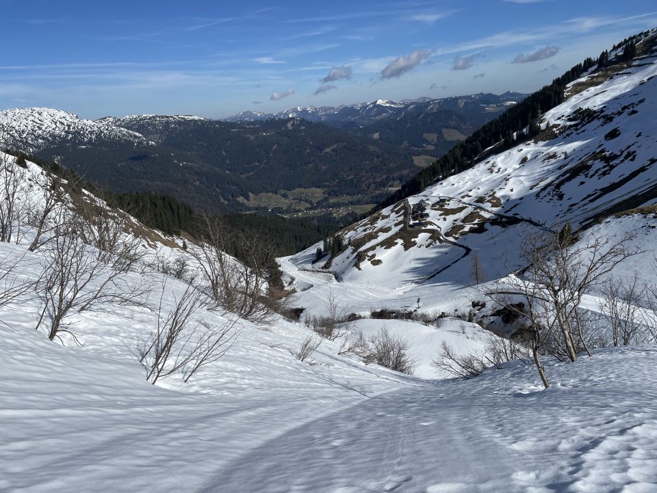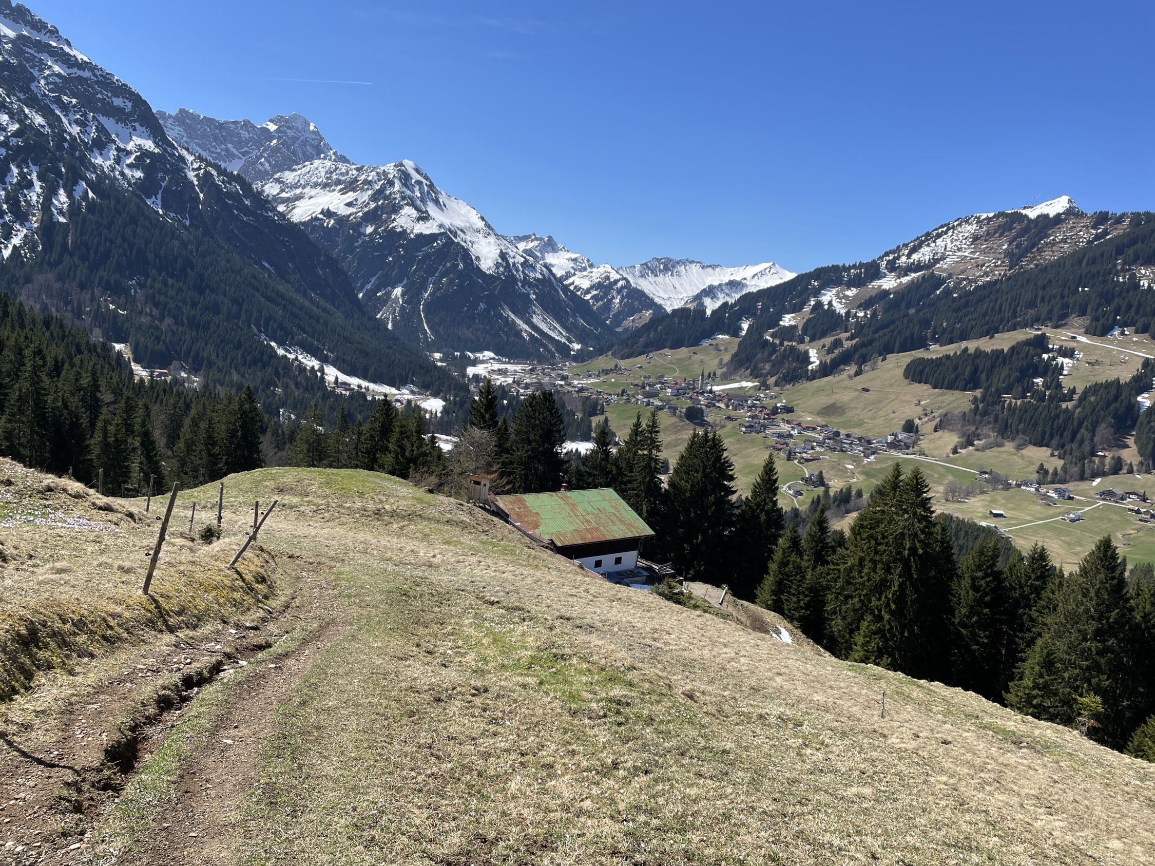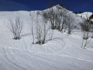 Tourenbeginn um 07:45 Uhr bei 5°C unter heiterem Himmel. Das Skigebiet mit den Liften und Bergbahnen hatte den Betrieb nach dem 6.4. eingestellt. So auch die Kanzelwandbahn. Wegen der nördlichen Schattenlage hält sich der Schnee auf der roten Skipiste mit Nr. 15 bis ins Frühjahr hinein. Insofern konnte man die Laufgeräte bereits an der Talstation anschnallen. Auf westseitiger Route über Äußere Kuhgehrenalpe liegt ab dem Wegweiser am Jäger-Hochstand unterhalb der Kuhgehrenalpe kein Schnee mehr.