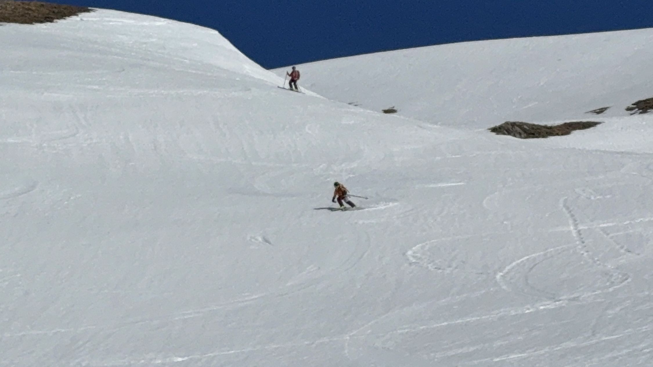 Die Abfahrt starteten wir gegen 11 Uhr in schönem Sulz, je nach Hangexposition unterschiedlich aufgefirnt.