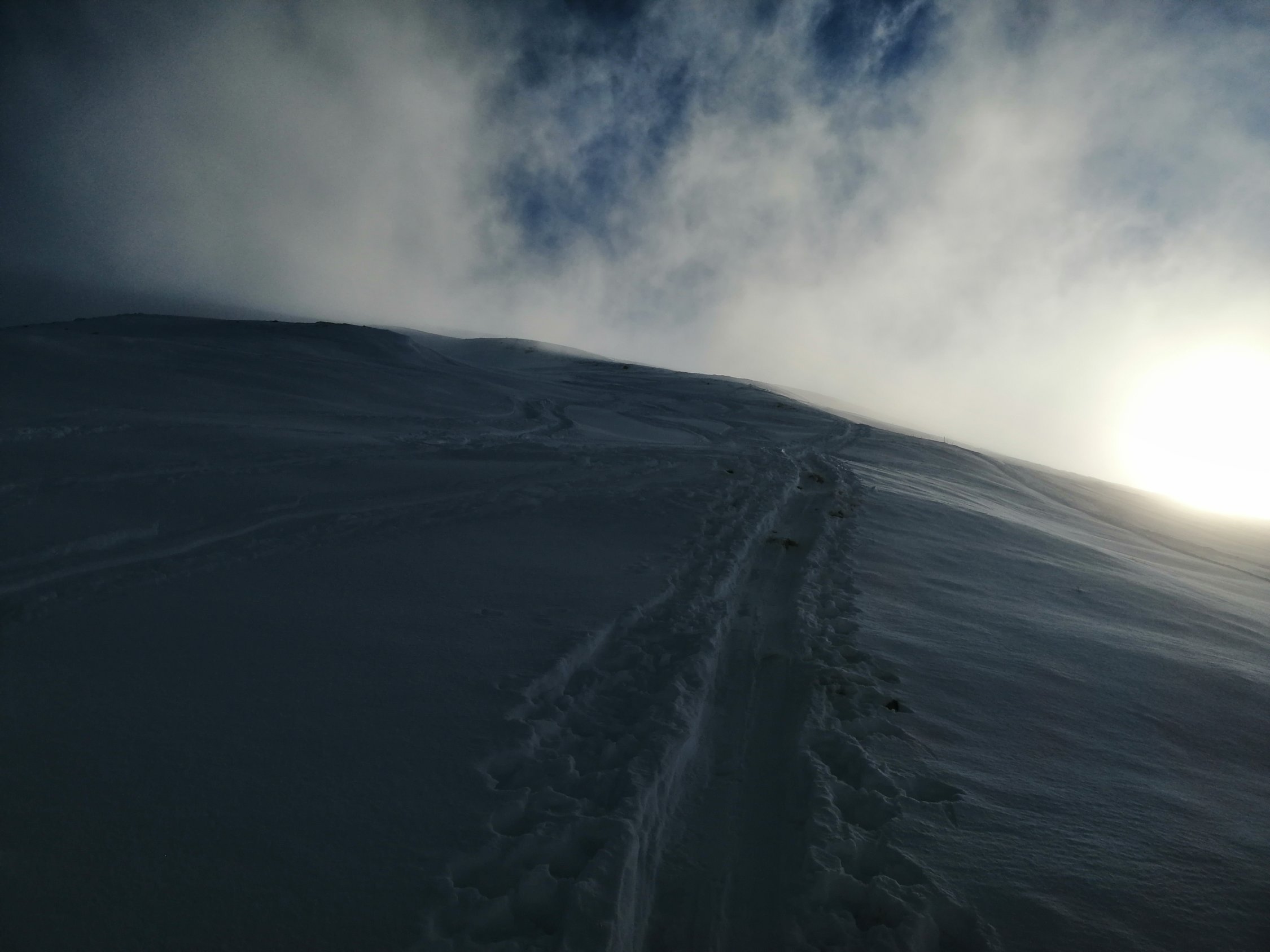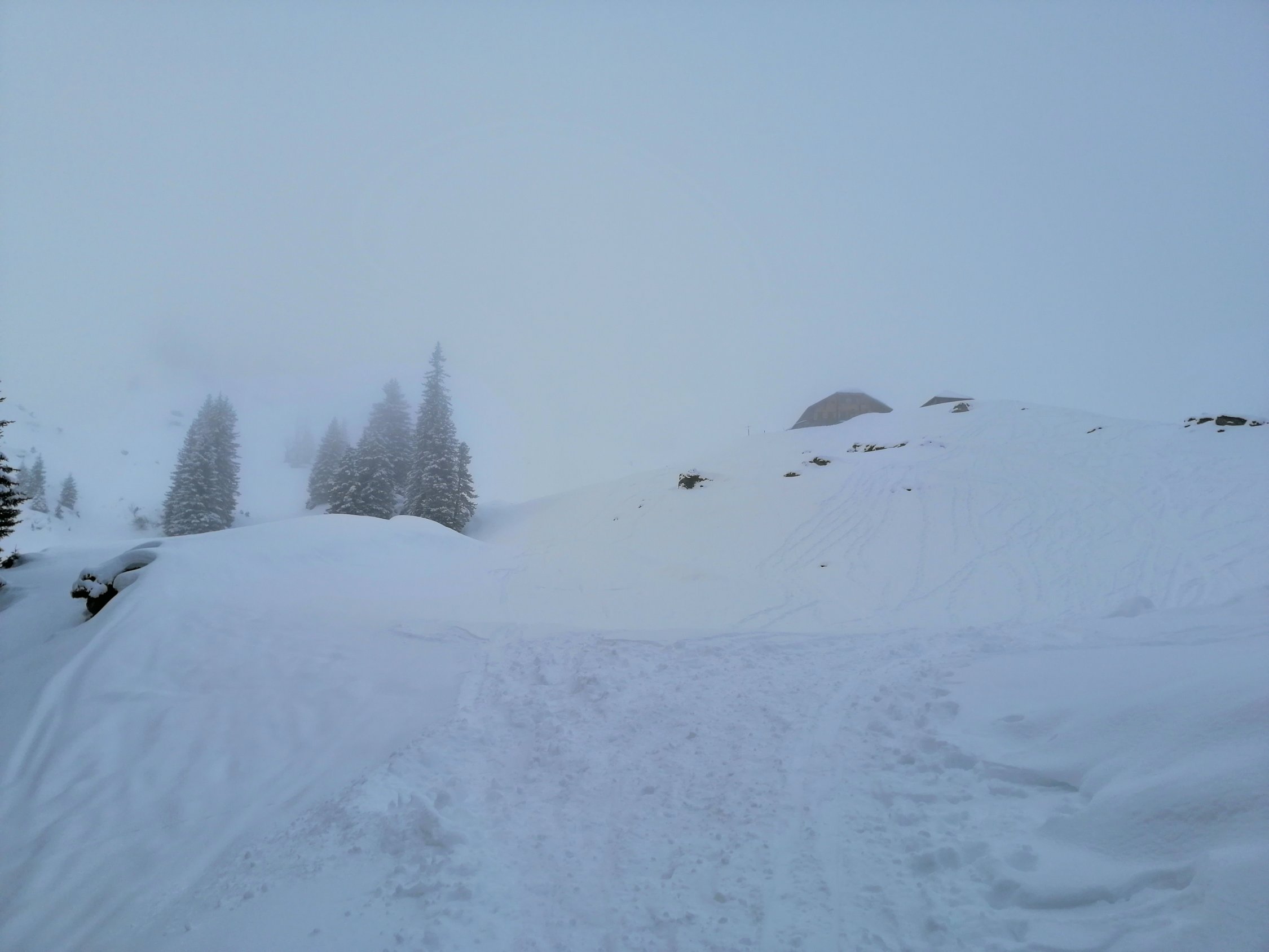 Wie im vorherigen Bericht ab Alp Grimmi bis ca. 2100m in der Suppe, gegen den Gipfel tat es auf und die Sonne zeigte sich, aber eisig kalter Wind. Deshalb gleich wieder runter, in der Gipfelflanke spürt man unter dem lockeren Pulverschnee die ruppige Altschneedecke. Nicht zu nahe am Grat abfahren, hier guckt immer wieder mal Steine oder Gras hervor.