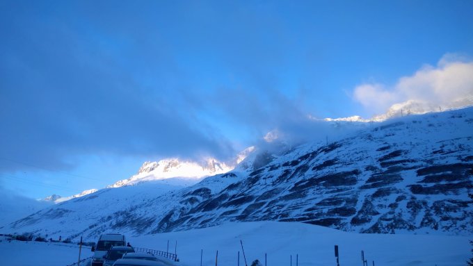 Start der Tour ca.9.00Uhr bei-8 Grad und einer kalten Bise. Die Neuschneemenge hält sich im Urserental, mit einem "Hauch", in Grenzen.
