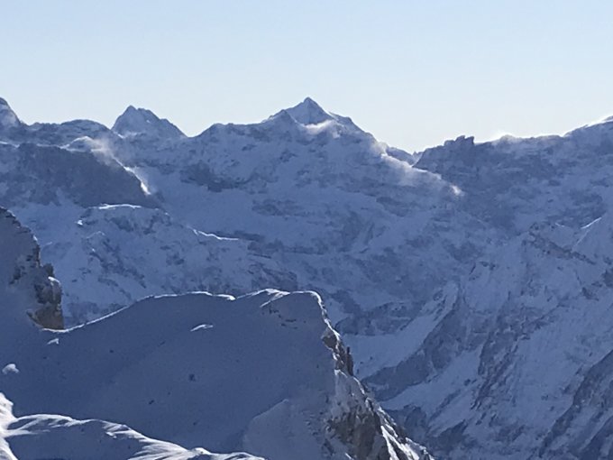 Gipfel Hang fahrbar jedoch hart. Nordost Flanke wurde gestern Sonntag auch gefahren. Wir haben uns für die Nordabfahrt entschieden. Im Nordhang gibt es Windgepresster Pulver mit sorgfältiger Routenwahl ohne Steinkontakt. In gewissen Mulden Knietief zu fahren.