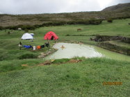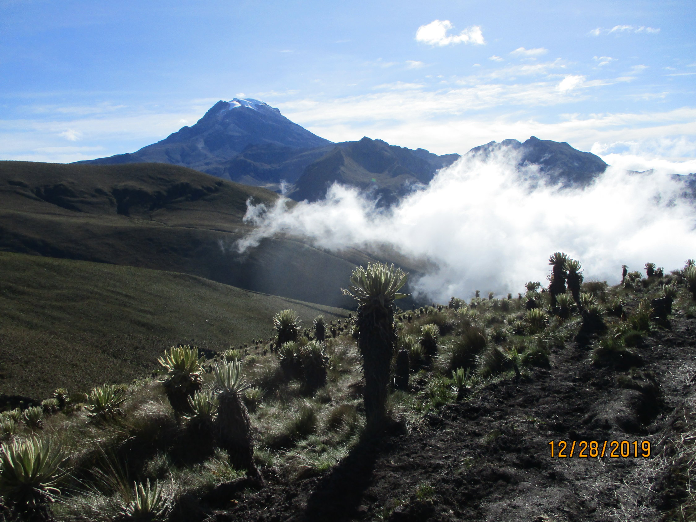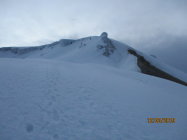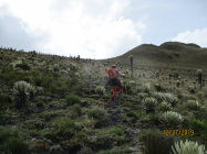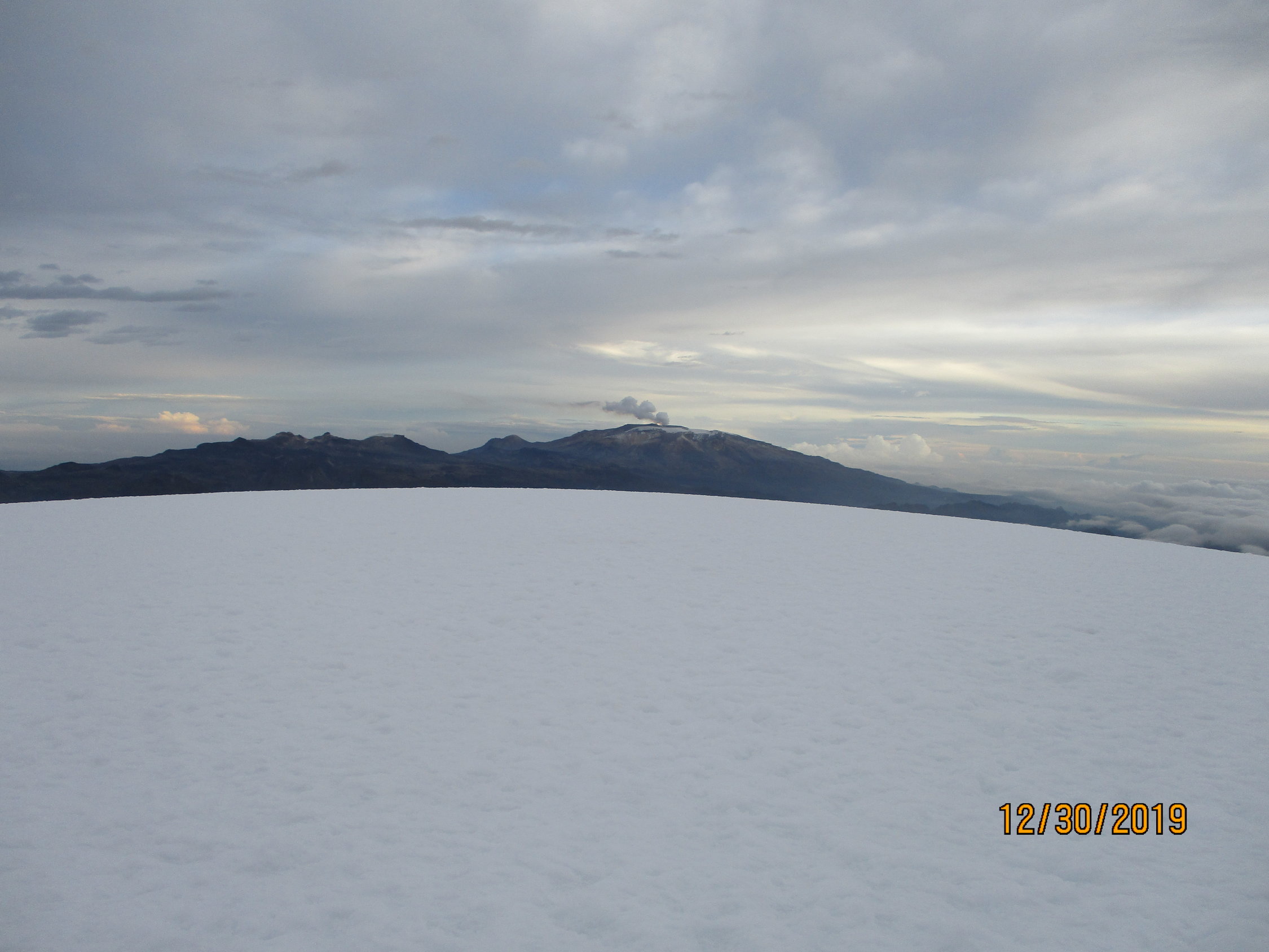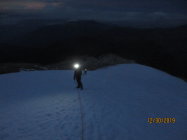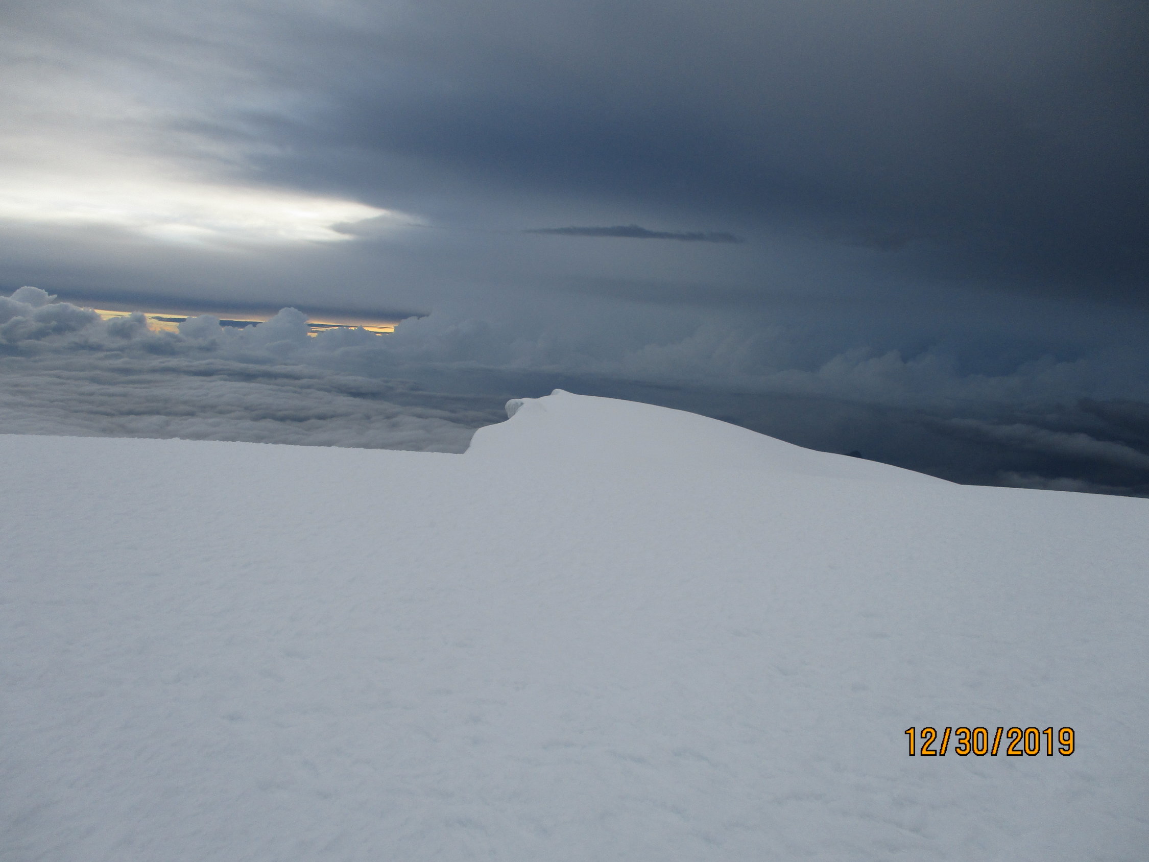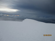 Nun ist es nicht ungewöhnlich, dass man in großen Höhen, in unserem Fall auf 4500 m, nicht so gut schläft. Bei mir war der Grund für eine schlaflose Nacht jedoch ein anderer: praktisch in Sekundenabständen wurde unser Zelt von entfernten Wetterleuchten erhellt, als befänden wir uns unter der Lichtanlage einer Disco. Von zwei Seiten gleich zuckte und leuchtete es, doch war kein Donnergrollen zu vernehmen. Mehrmals ging ich in dieser Nacht vors Zelt, um zu schauen, wie es um den Abstand der Gewitter zu uns bestellt ist. Für kurze Zeit kam dann prompt Wind auf, und Donnergrollen war mehrfach zu vernehmen. Als um 2 Uhr morgens unsere Wecker klingelten, hatte sich die Lage zwar beruhigt, aber im Süden, direkt hinterm Berg, blitzte es weiterhin. Meine beiden Kameraden Vladi un Daniel hatten indes von dem ganzen nächtlichen Lichtzauber nichts mitbekommen und erwachten recht gut ausgeschlafen. Das nächtliche Blitzen blieb dann das einzig Beunruhigende auf unserem ansonsten bei perfekten Bedingungen erlebten Aufstieg zum Gipfel. Außer uns war noch eine 3-er-Seilschaft aus Bogotá unterwegs, die etwa eine Stunde vor uns aufgebrochen war, und die wir dann mit herzlichen Umarmungen am Gipfel wiedertrafen. Da das Grau auf der Südseite des Gipfels Anstalten machte, sich dem Berg anzunähern, und dort immer noch ab und zu Blitze herauszuckten, beließen wir es bei einem Gipfelaufenthalt von nur etwa 20 Minuten, um anschließend zügig wieder abzusteigen.