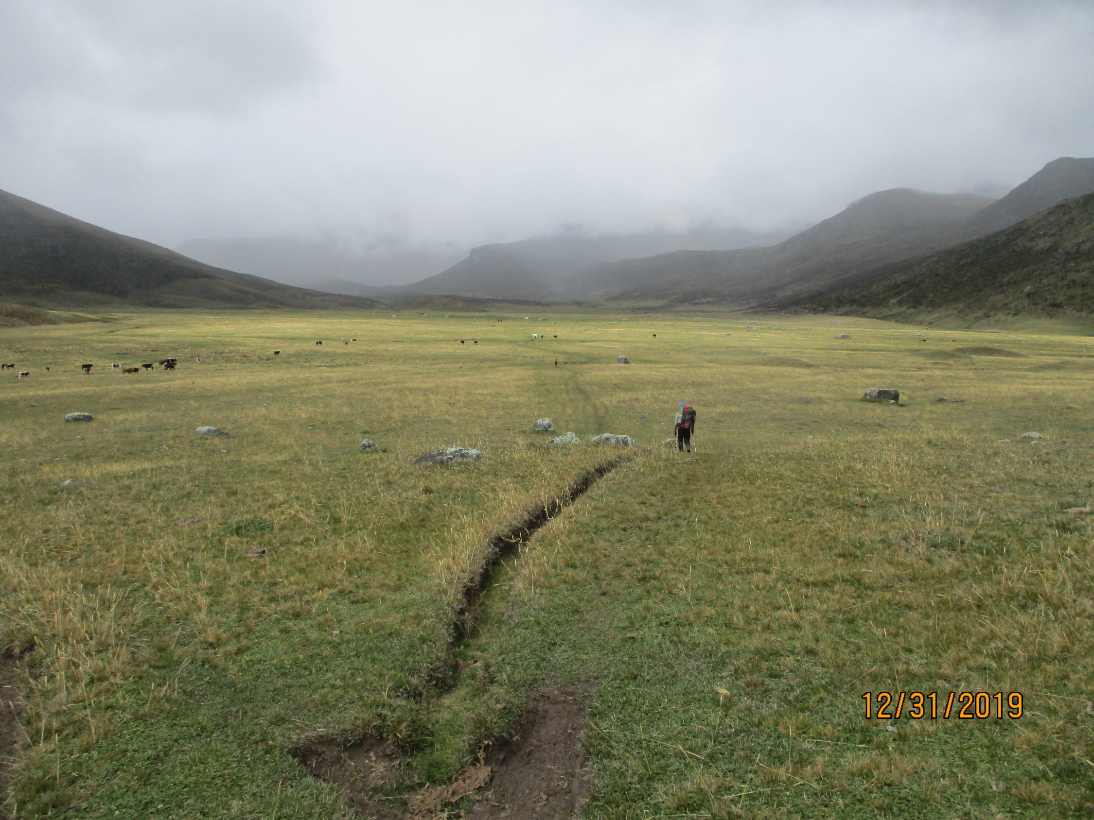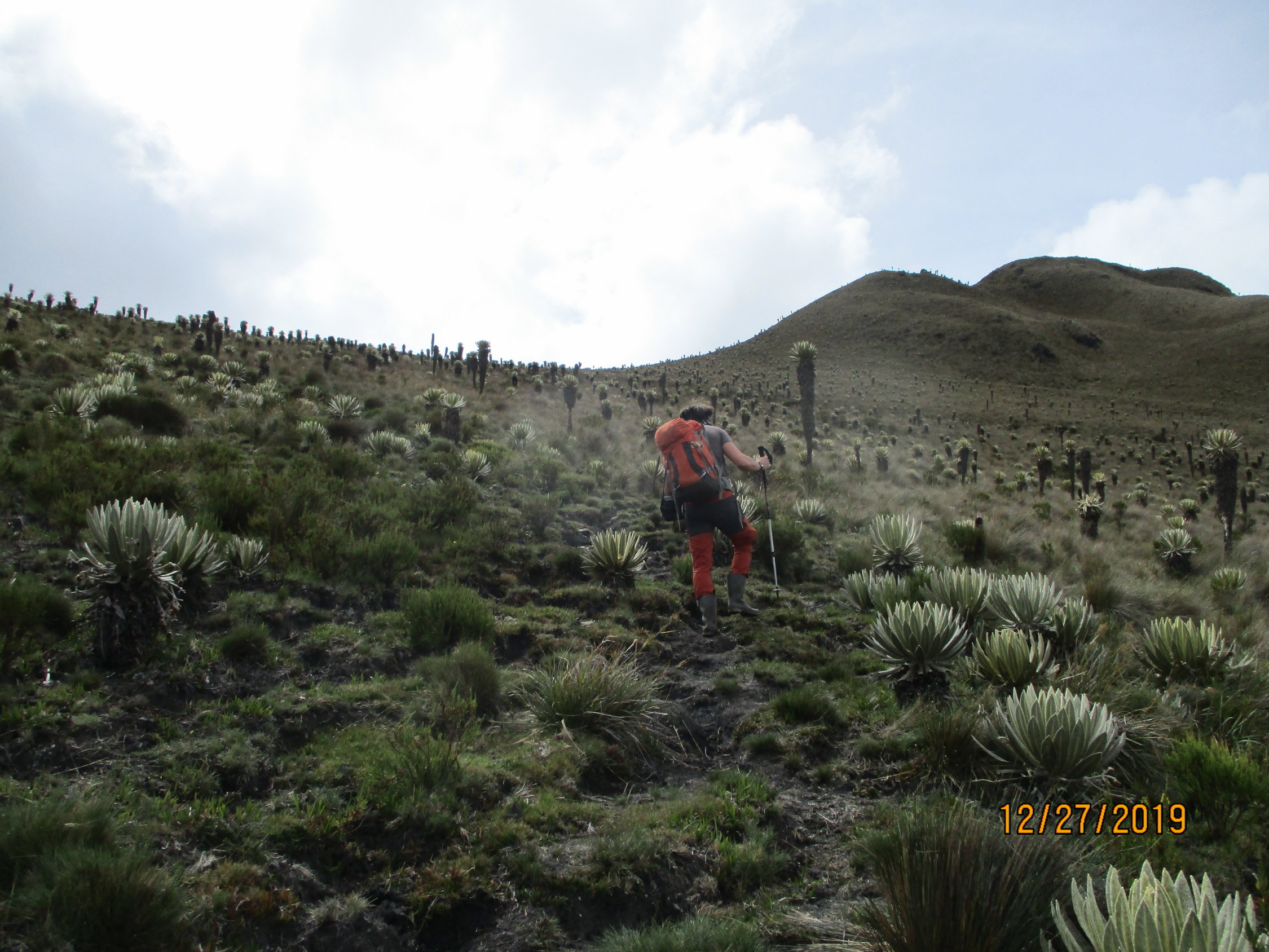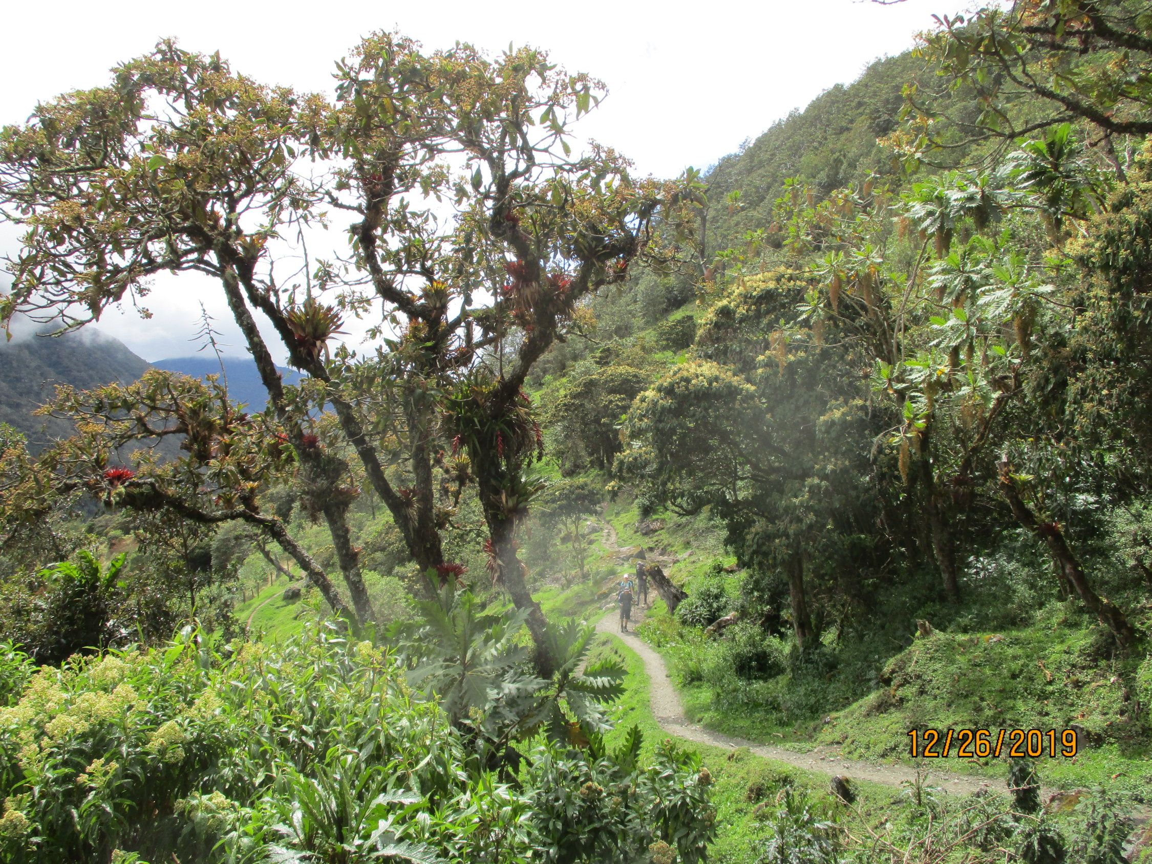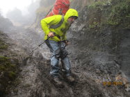 ... à propos Gummistiefel: die Mitnahme dieses Schuhwerks empfiehlt sich dringend zur Bewältigung von tiefschlammigen Pfaden in der Regenwald- und Paramozone. Diese Erfahrung machten wir mehrfach schon auf vergleichbaren Touren sowohl in Afrika, als auch in Südamerika. Nur diesmal schien es zunächst anders zu sein. An 5 von 6 Tagen fanden wir überwiegend trockene Pfadverhältnisse vor - bis auf diesen letzten Tag, wo es über Nacht kräftig geregnet hatte und es auch tagsüber schaueranfällig geblieben war. Die Begehung der Pfade geriet zu einer oft haarsträubenden Rutschpartie.