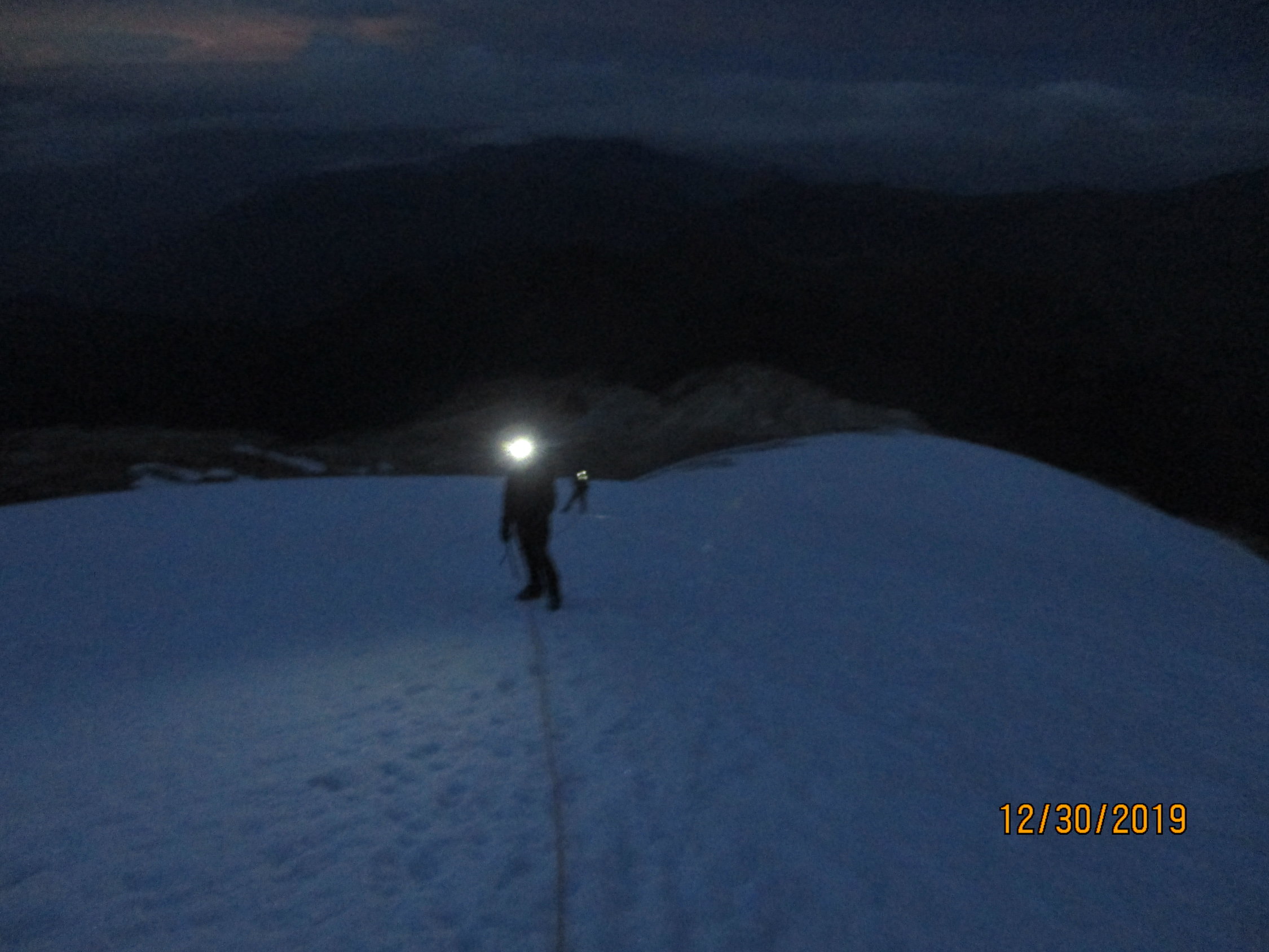 Zeiten: Wir verließen das Lager um 3 Uhr morgens, beim Erreichen des Anseilplatzes am Gletscherrand (ca. 4950 m) setzte die Morgedämmerung ein. Um 6.20 Uhr am 30.12.2019 genossen wir die Aussicht vom breiten Gipfelplateau. Bereits kurz nach 8 waren wir wieder unten im Camp.