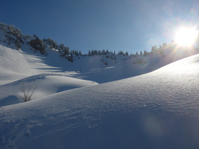 Wolkenlos, 25 cm neuer Pulverschnee, Nordabfahrt noch unverspurte Hänge, Südabfahrt schon ziemlich verfahren, aber auch schöner Pulver
